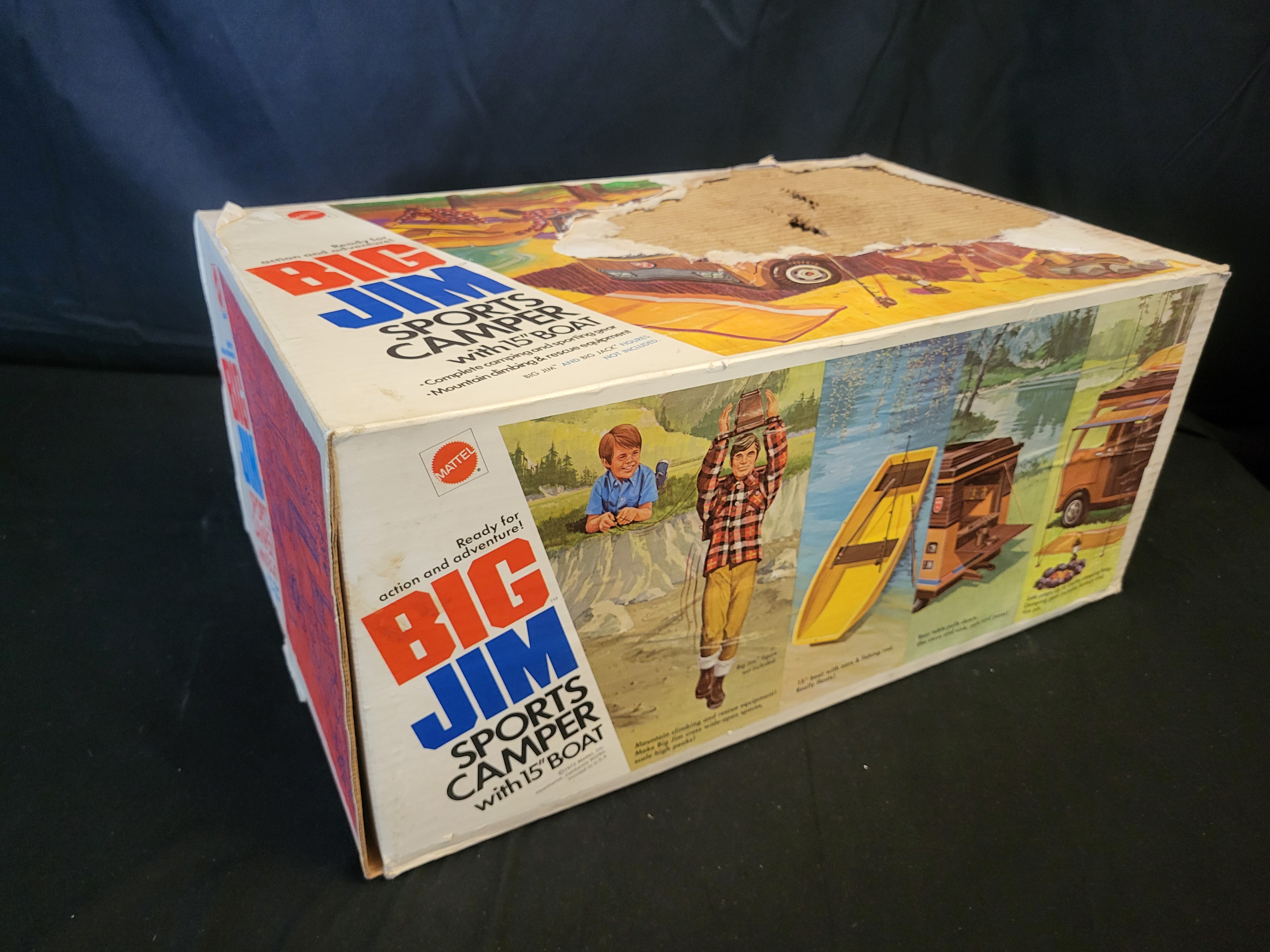 The original cardboard box exhibits significant damage, including large tears on the top and side panels that expose the corrugated interior, as well as shelf wear and creasing. The plastic camper and accessories show signs of age and play wear, including surface scuffing and minor decal wear.