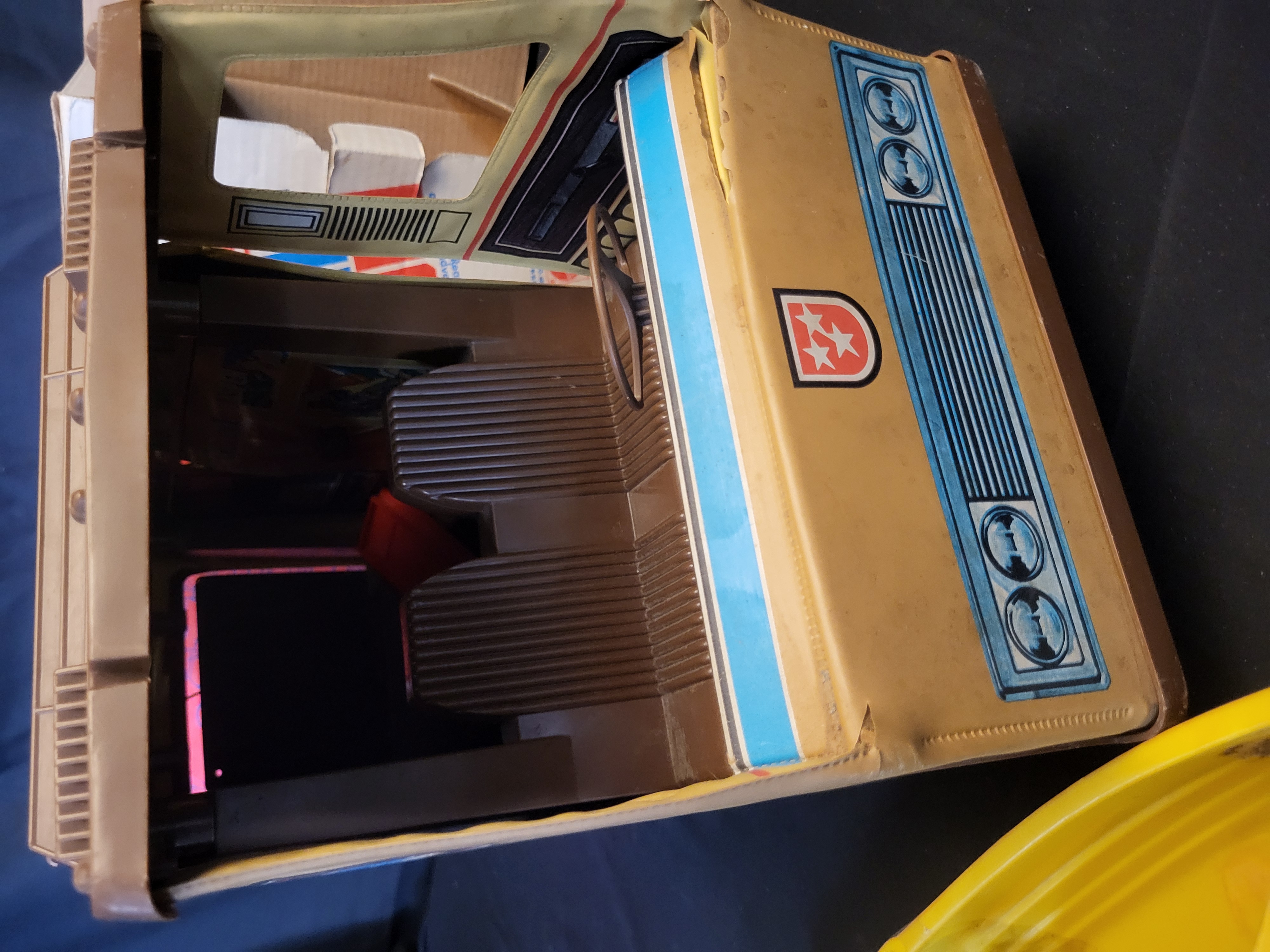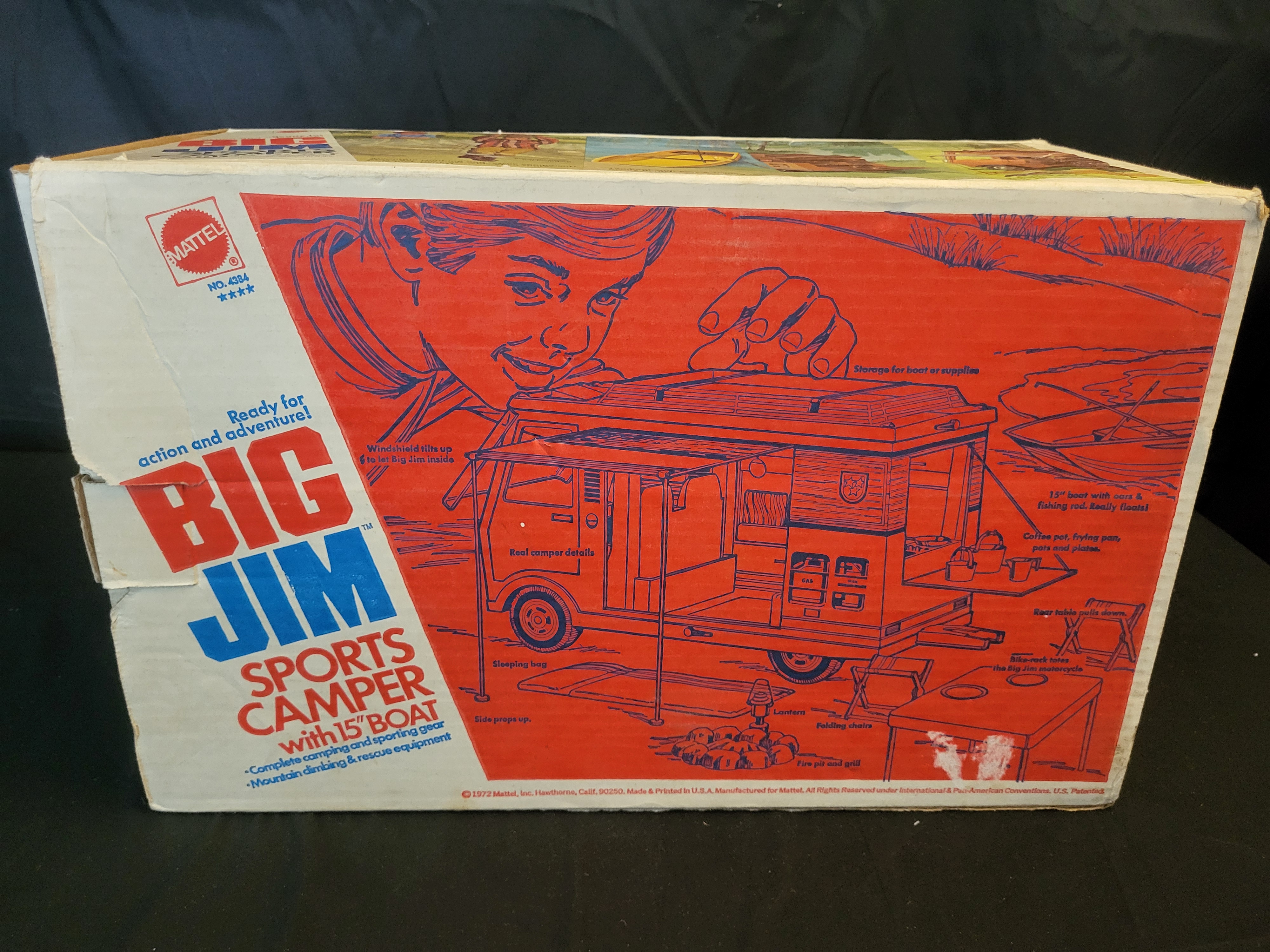 BID PER WHAT YOU SEE IN THE PHOTO, NOT THE AI GENERATED TITLES AND DESCRIPTIONS! Mattel Big Jim Sports Camper play set, model number 4384. The set features a molded plastic camper vehicle finished in tan and brown with simulated wood-grain panels and original decals. It is accompanied by a set of accessories including a yellow boat, folding chairs, a small brown cabinet, an orange life vest, and a yellow inflatable accessory marked U.S.N. The vehicle interior includes brown seating and a steering wheel. The original illustrated cardboard box is present, featuring the Mattel logo and a 1972 copyright date.