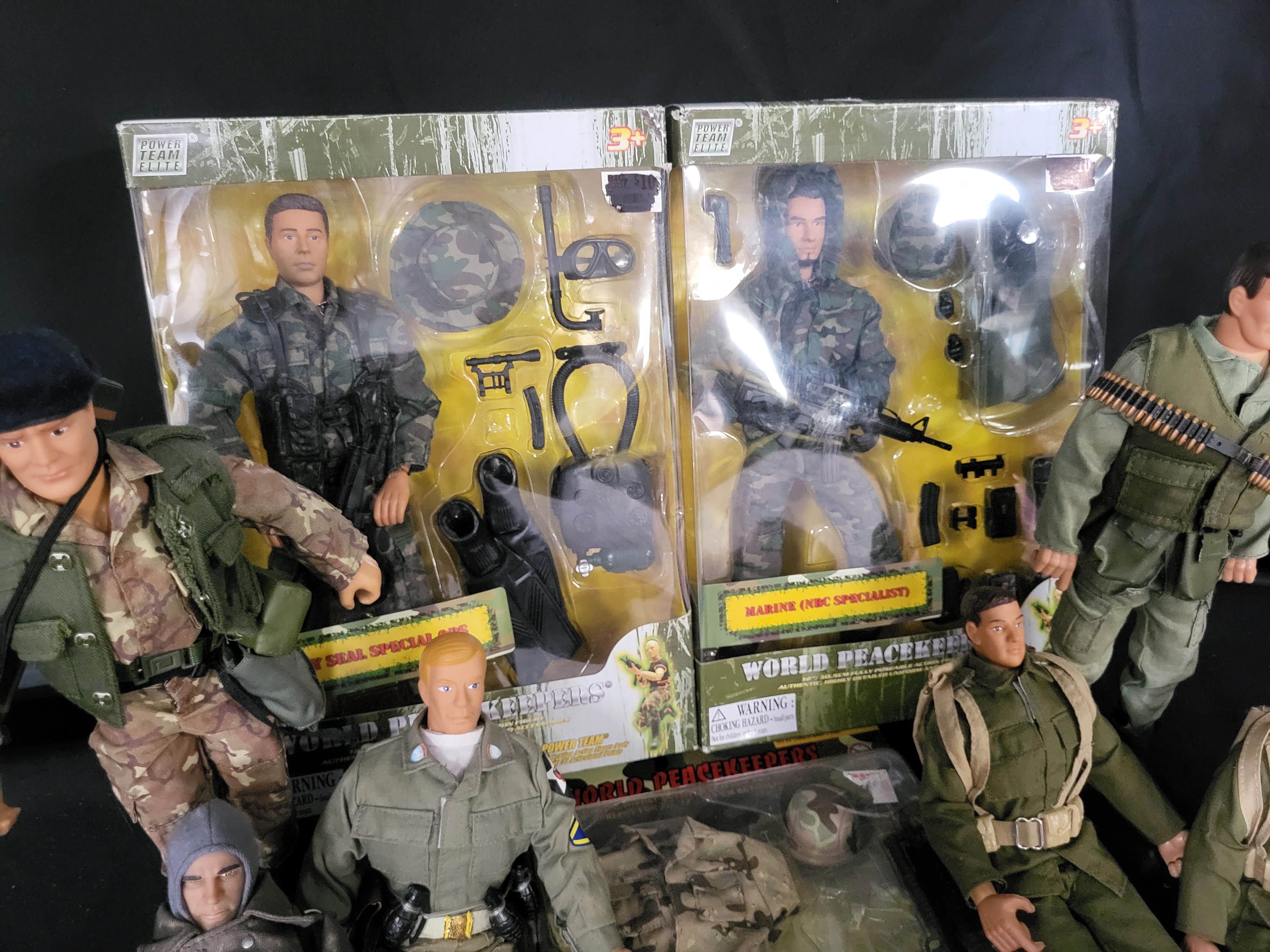 BID PER WHAT YOU SEE IN THE PHOTO, NOT THE AI GENERATED TITLES AND DESCRIPTIONS! A collection of 1:6 scale military-themed action figures and accessories primarily from the Power Team Elite and World Peacekeepers lines. The group features several articulated figures dressed in diverse textile uniforms, including camouflaged tactical gear, olive drab fatigues, and a grey greatcoat. Three items are contained within their original retail packaging: a Navy SEAL Special Ops figure, a Marine NBC Specialist figure, and a Desert Infantry accessory set. The figures are constructed of molded plastic with multiple points of articulation. The lot includes a diverse assortment of loose accessories such as miniature rifles, helmets, hats, and various field equipment.
