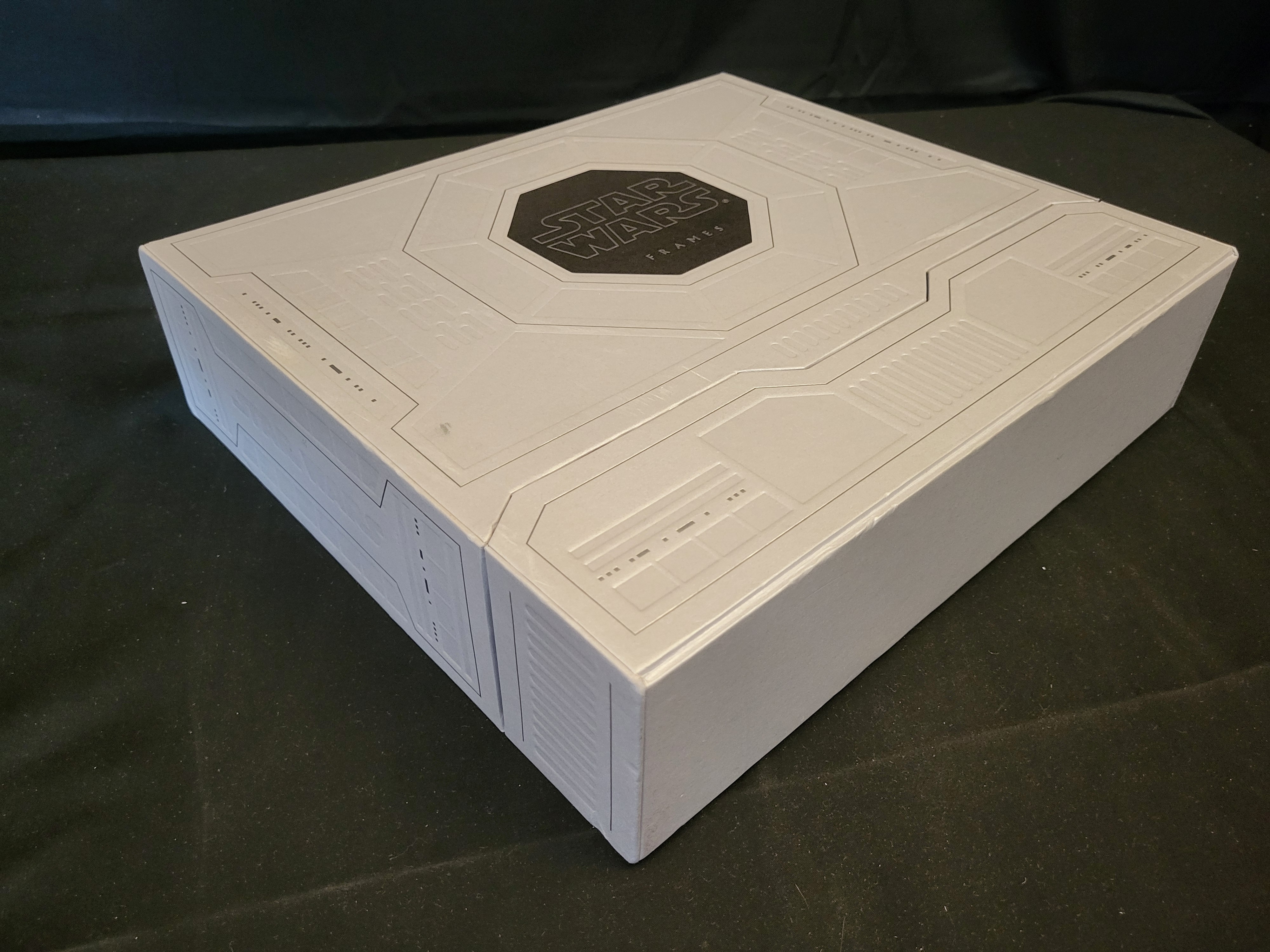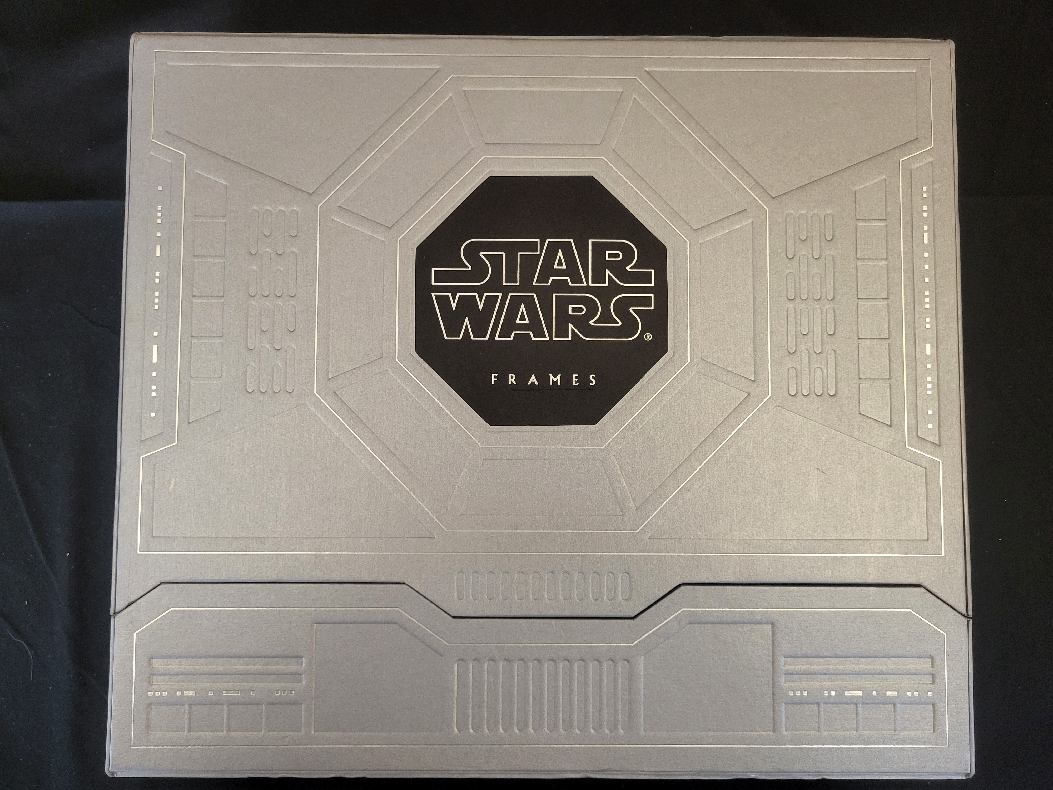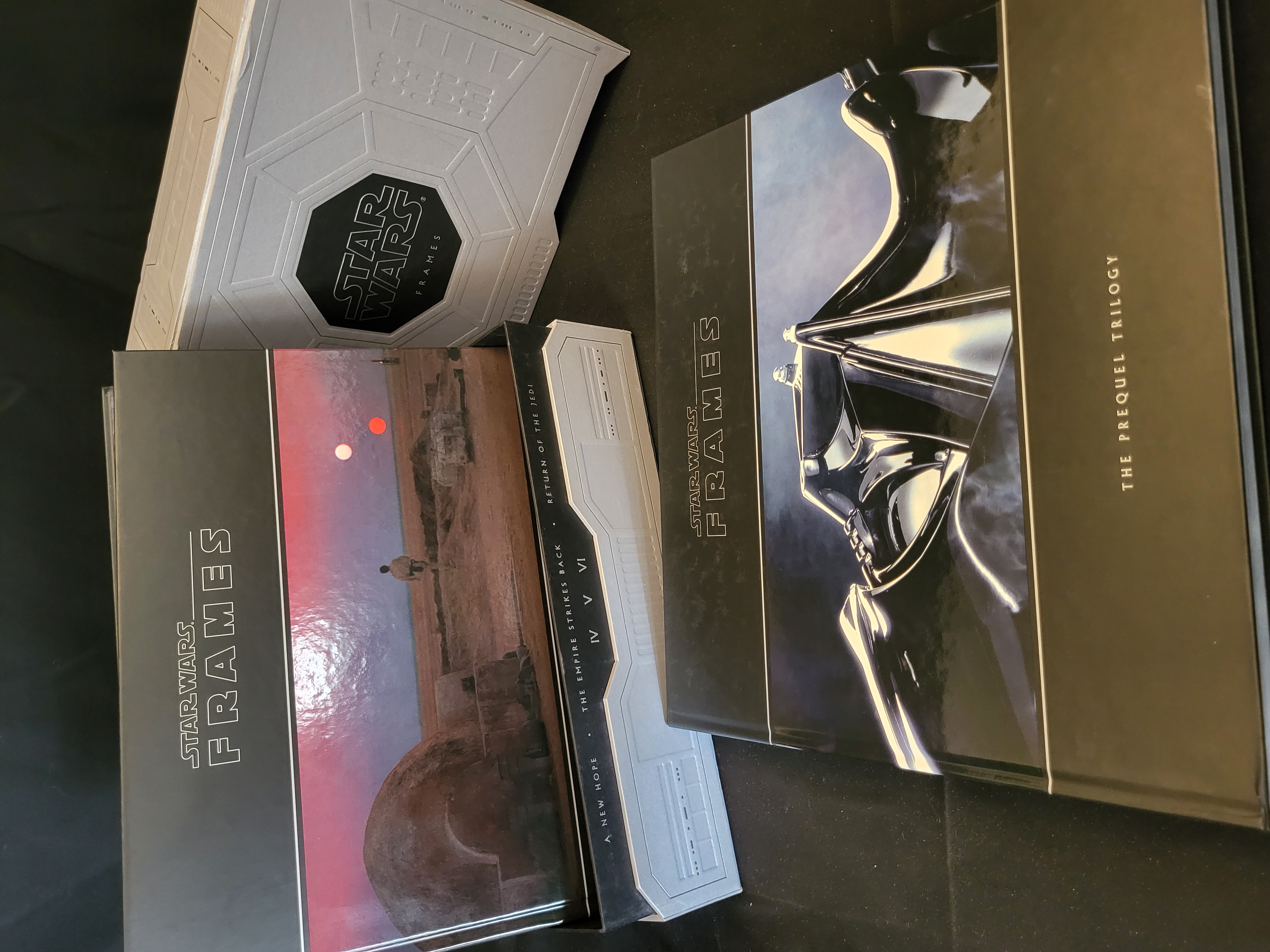 BID PER WHAT YOU SEE IN THE PHOTO, NOT THE AI GENERATED TITLES AND DESCRIPTIONS! This set of Star Wars: Frames hardcover volumes is housed in a large, embossed silver metallic-finish slipcase. The collection includes volumes dedicated to the Prequel Trilogy and the Original Trilogy, specifically A New Hope, The Empire Strikes Back, and Return of the Jedi. Each volume contains high-resolution cinematic still frames printed on heavy, glossy paper. The slipcase features a central black octagonal logo with geometric embossed detailing. The interior pages feature full-color imagery from the films.