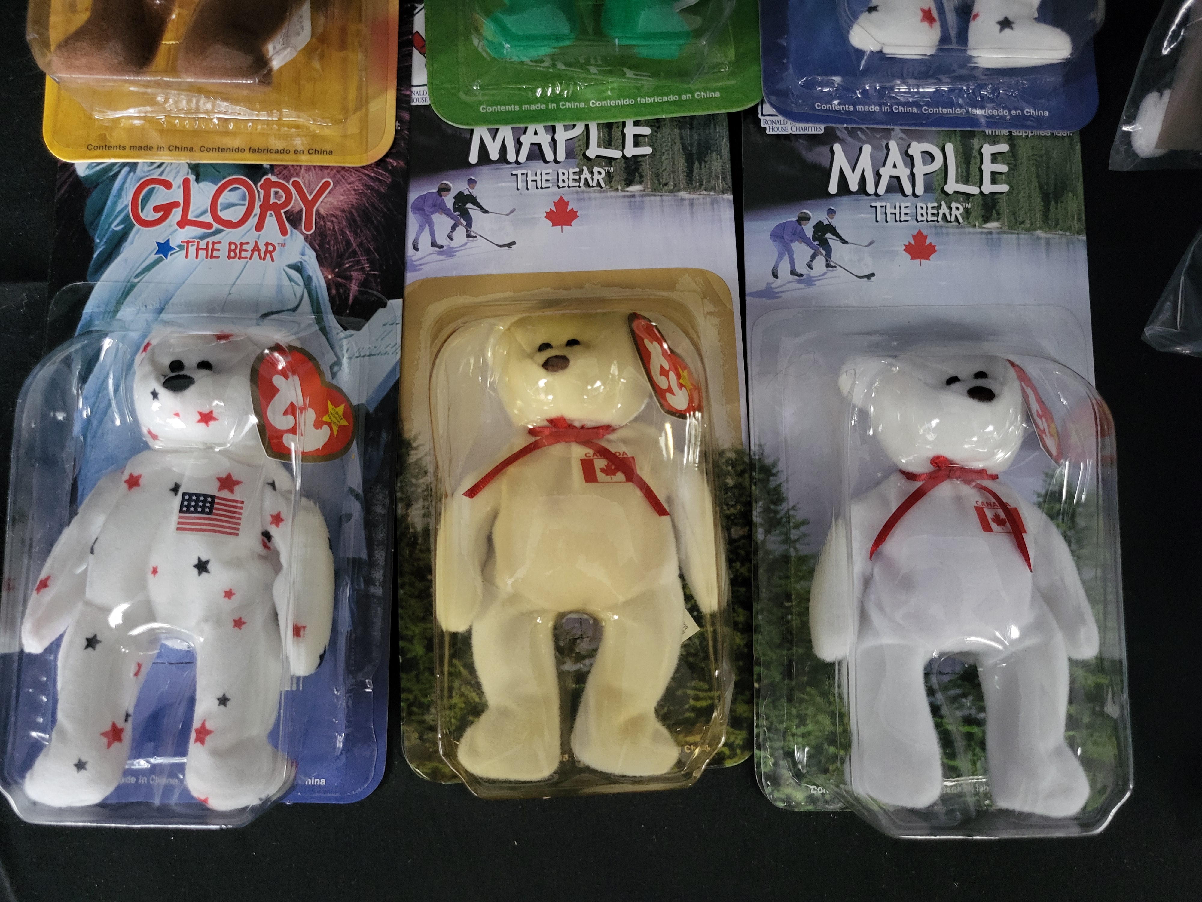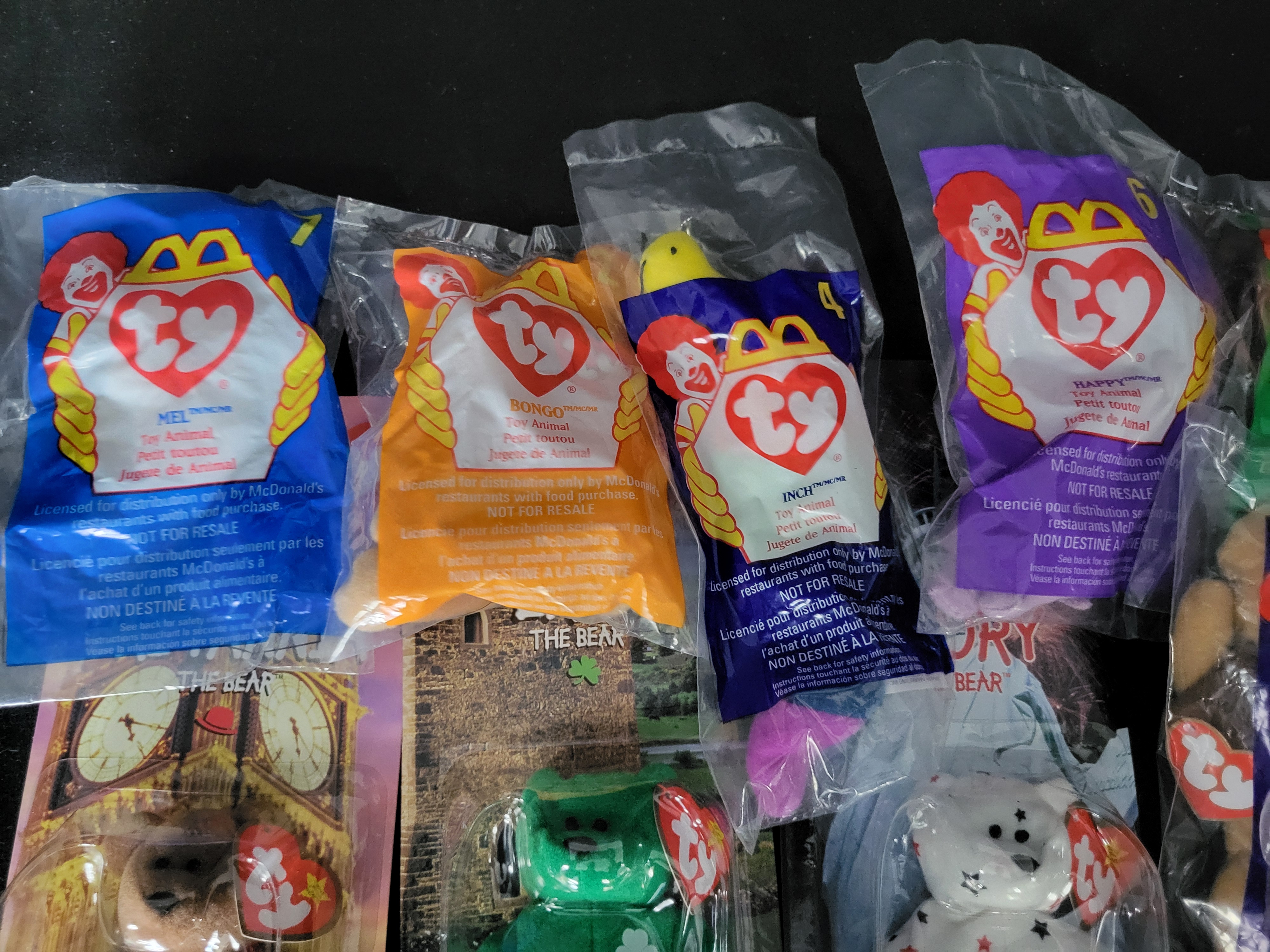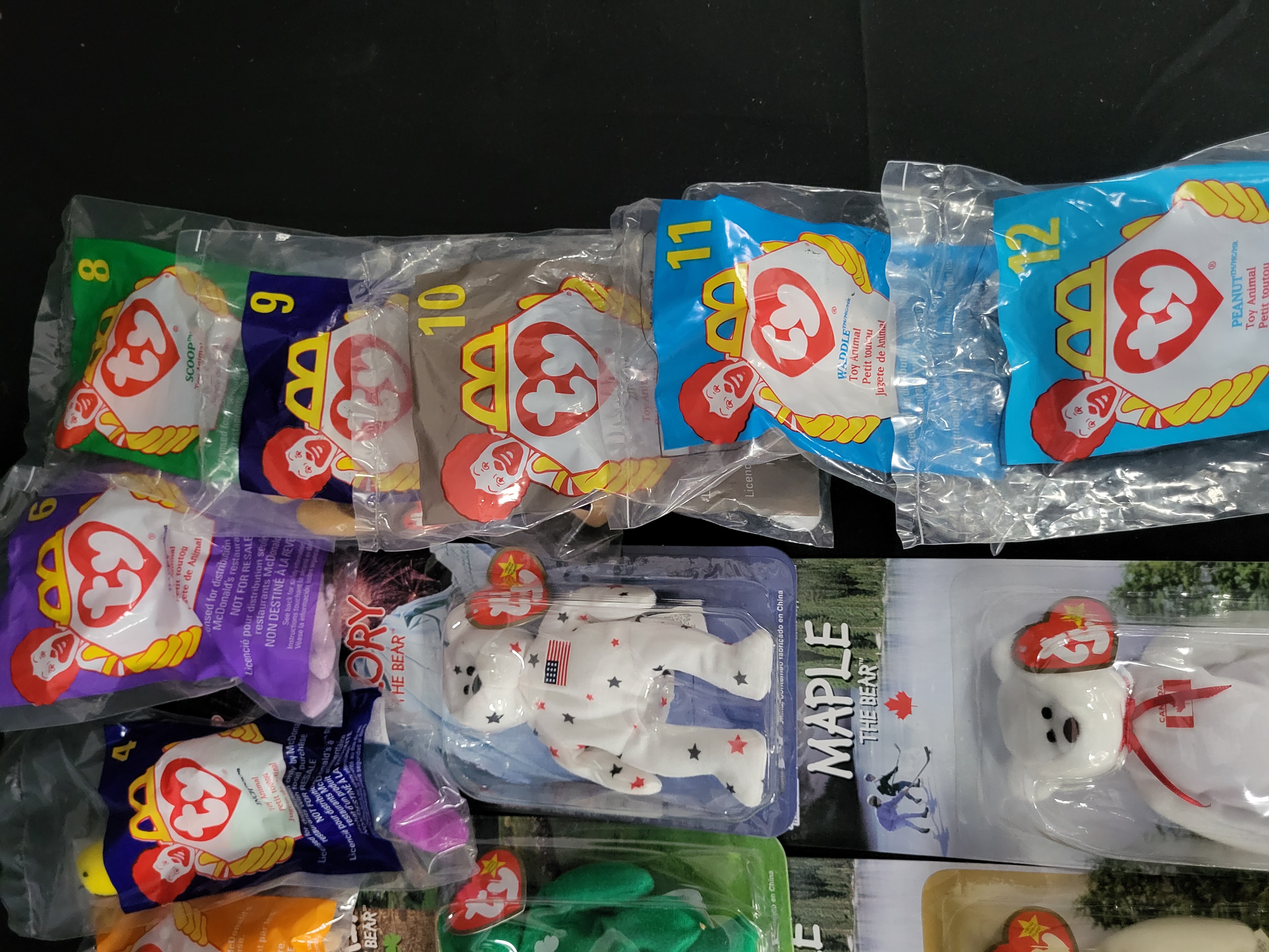 BID PER WHAT YOU SEE IN THE PHOTO, NOT THE AI GENERATED TITLES AND DESCRIPTIONS! A collection of Ty for McDonald’s plush toys, including Teenie Beanie Babies and Ronald McDonald House Charities International Bears. The Teenie Beanie Babies are housed in original, unopened clear plastic polybags and include characters such as Mel, Bongo, Inch, Happy, Scoop, Waddle, and Peanut. These items feature the McDonald’s Happy Meal logo and specific character numbering. The International Bears are presented in original cardboard and plastic blister packs and include Britannia (United Kingdom), Erin (Ireland), Glory (USA), and Maple (Canada). Each bear features the signature Ty heart-shaped hang tag and relevant national emblems. Packaging includes bilingual text in English and French. Market research indicates the Erin bear is frequently associated with tush tag misprints and manufacturing errors.