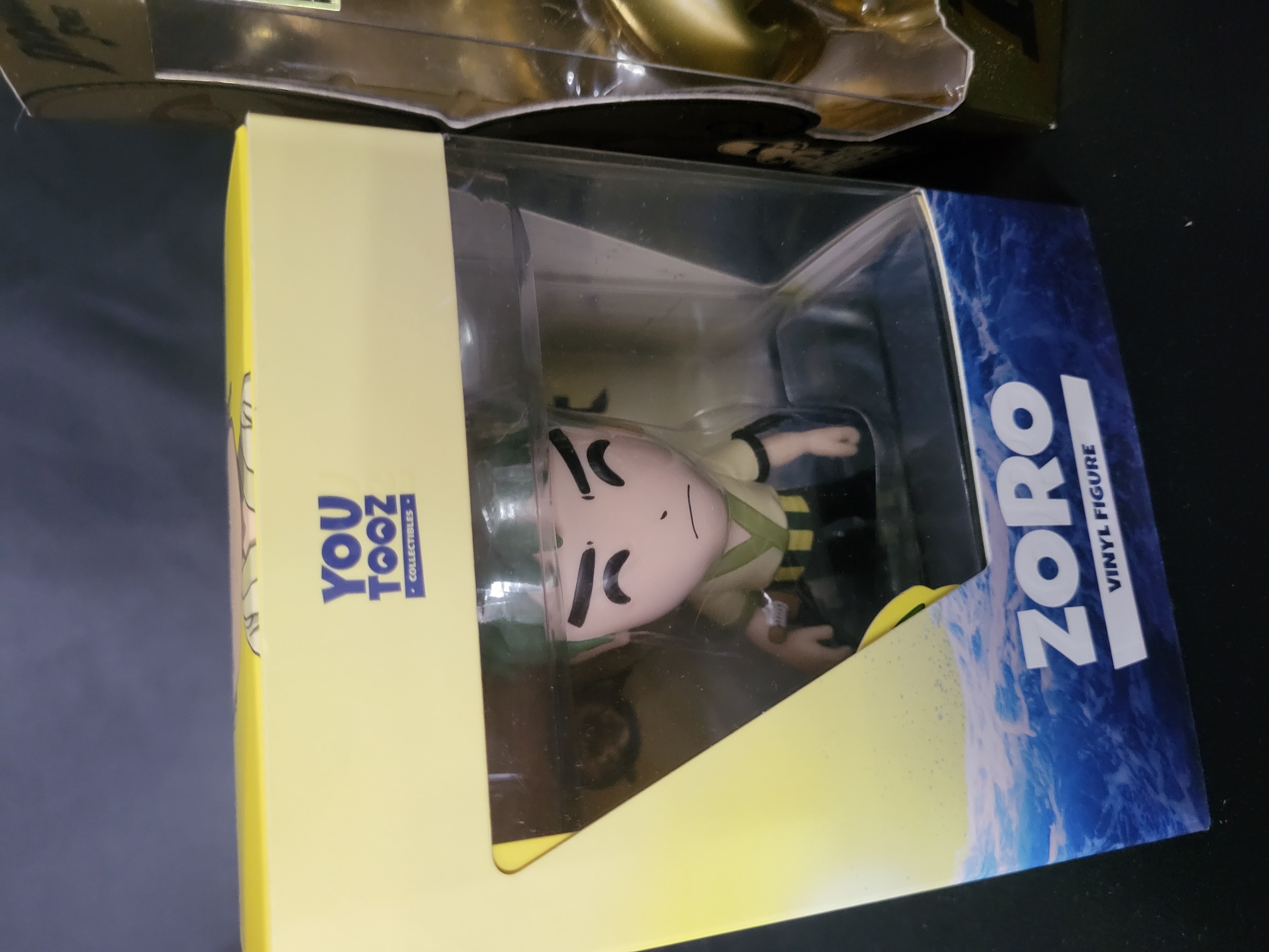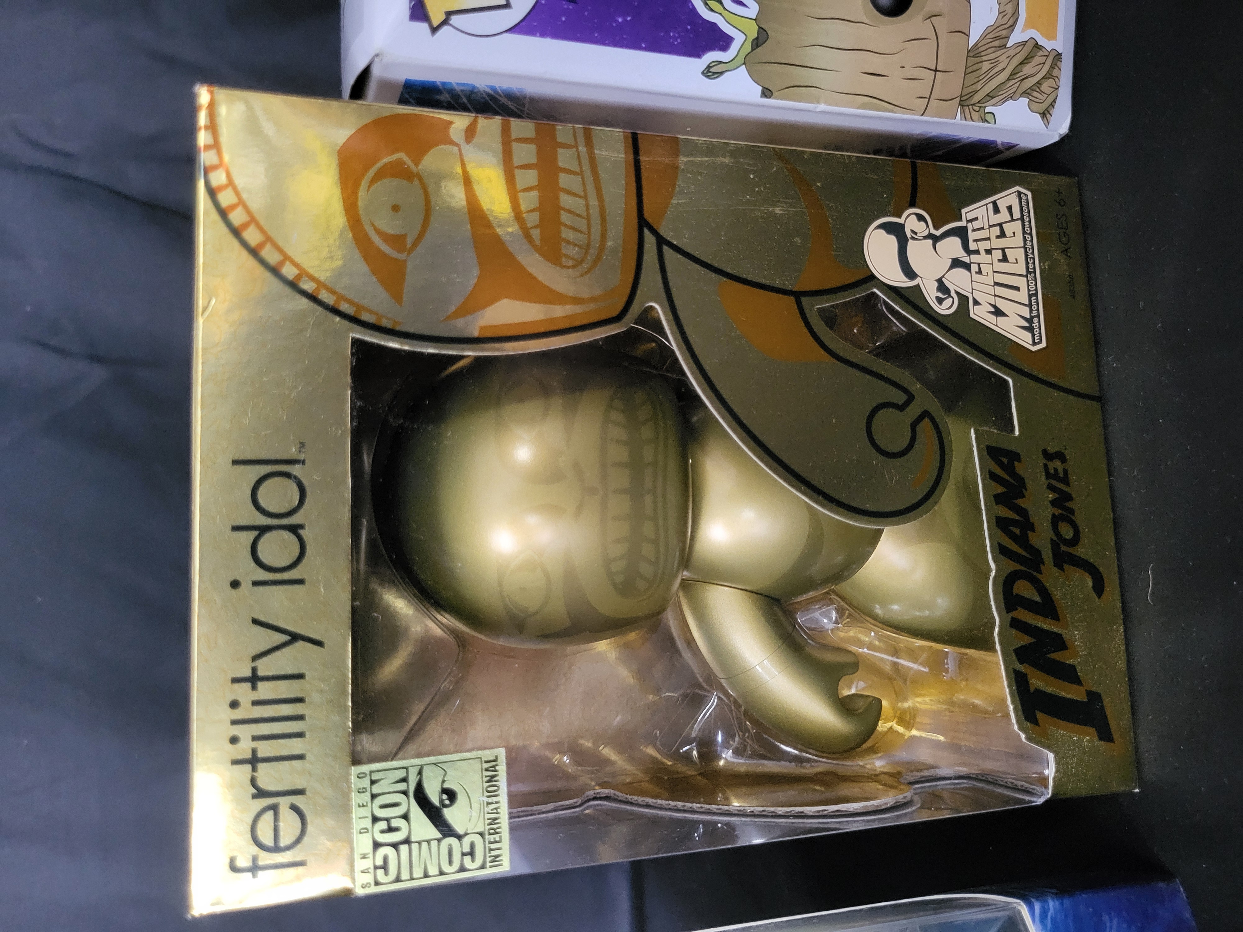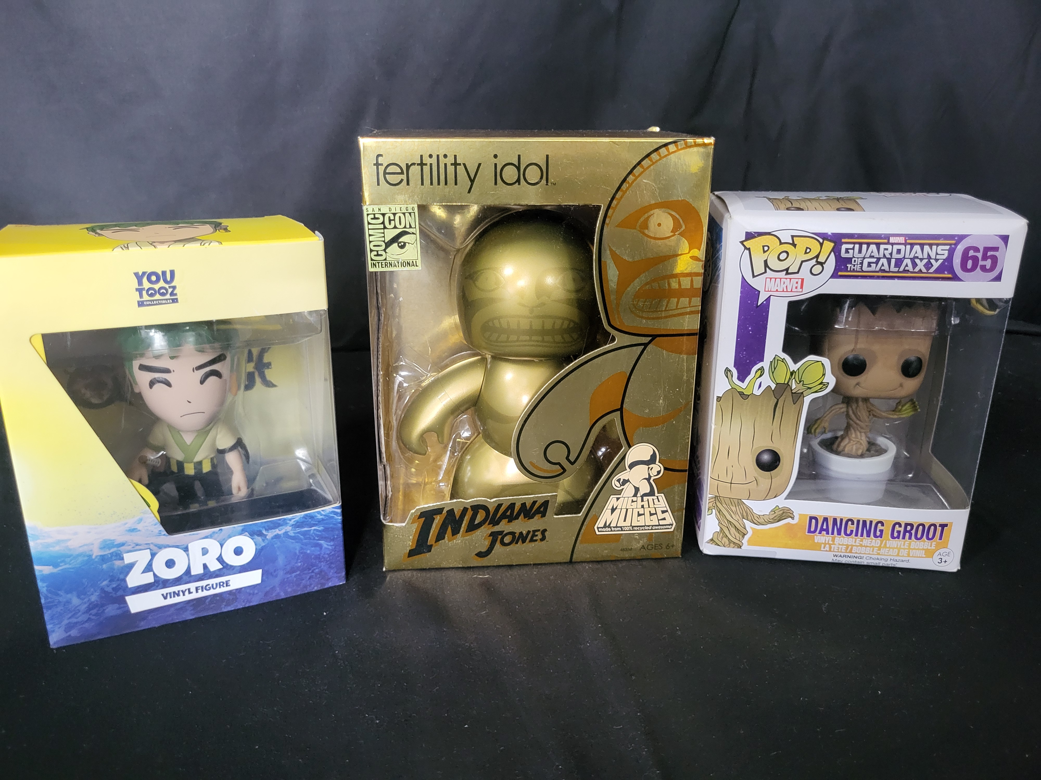 BID PER WHAT YOU SEE IN THE PHOTO, NOT THE AI GENERATED TITLES AND DESCRIPTIONS! A trio of modern vinyl collectible figures in original manufacturer retail packaging. The collection features a Hasbro Indiana Jones Mighty Muggs Fertility Idol, identified as a 2008 San Diego Comic-Con International exclusive with a metallic gold finish. The group also contains a Funko Pop! Marvel Guardians of the Galaxy Dancing Groot vinyl bobble-head (No. 65) and a Youtooz Zoro vinyl figure. Each figure is constructed of molded vinyl and is housed in a window-style box with brand-specific graphics and text.