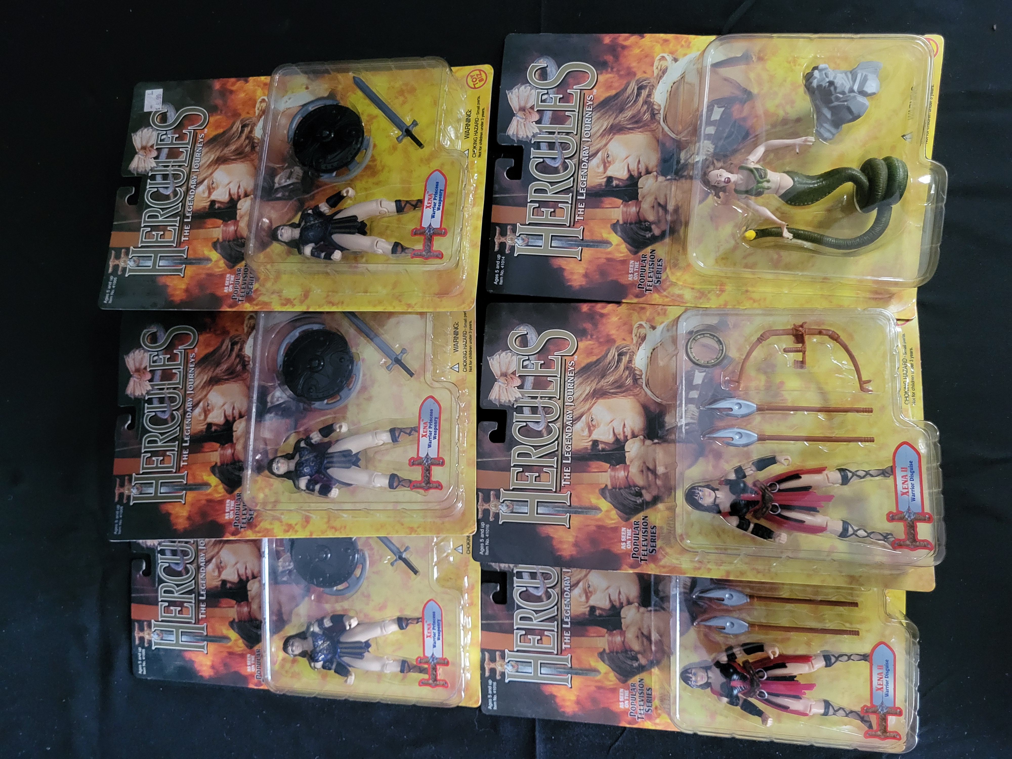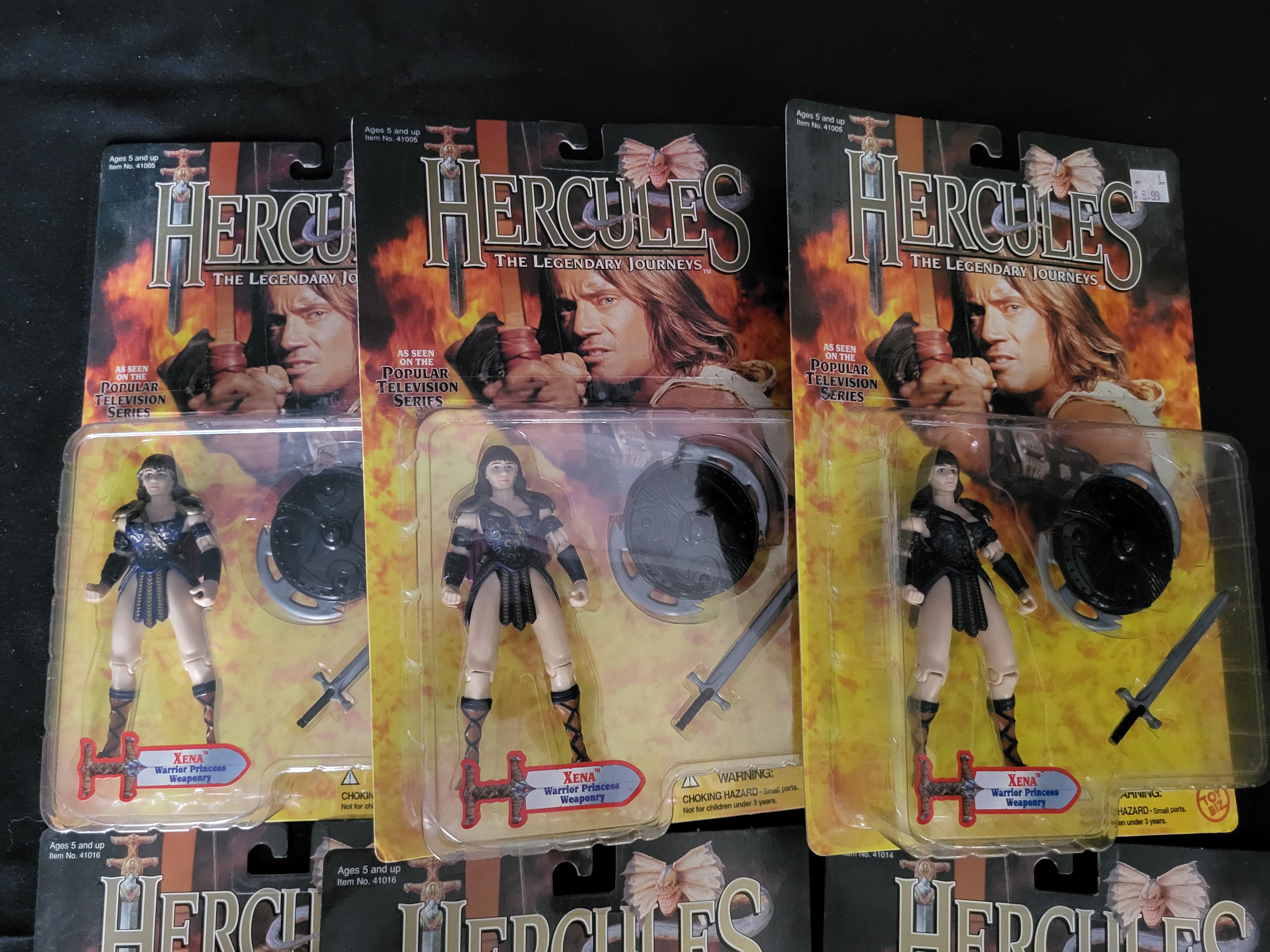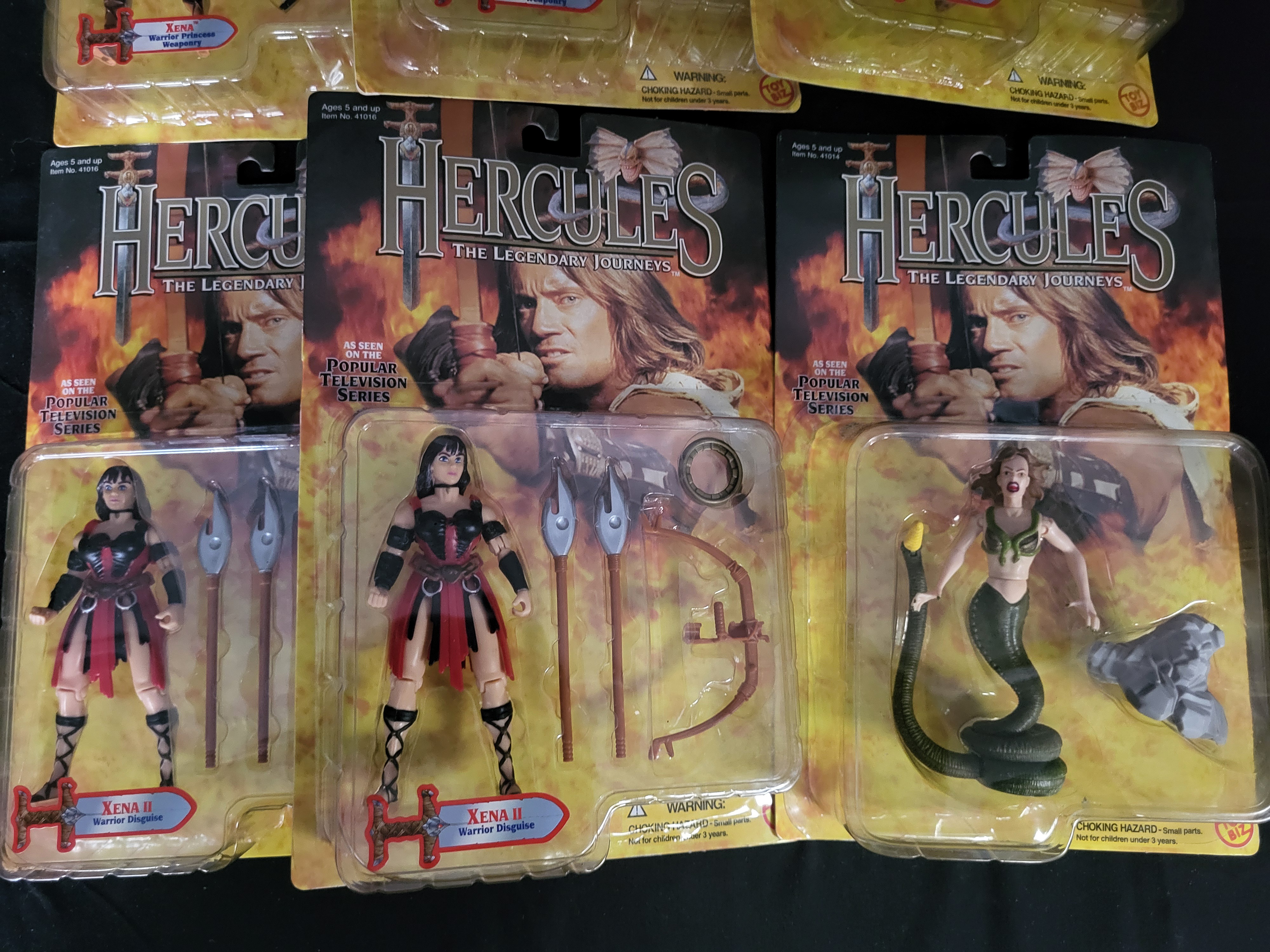 BID PER WHAT YOU SEE IN THE PHOTO, NOT THE AI GENERATED TITLES AND DESCRIPTIONS! A collection of Toy Biz action figures from the 1996 series Hercules The Legendary Journeys. The group includes multiple variations of the Xena character and a mythological creature. Specific figures include Xena Warrior Princess Weaponry with sword and shield accessories, Xena II Warrior Disguise with bow, spears, and chakram accessories, and She-Demon with Stone Strike Tail and rock accessory. Each figure is constructed of molded plastic and presented in its original unopened blister pack. The colorful cardboard backing cards feature character graphics from the television series and include manufacturer markings, item numbers 41005, 41014, and 41016, and age warnings.