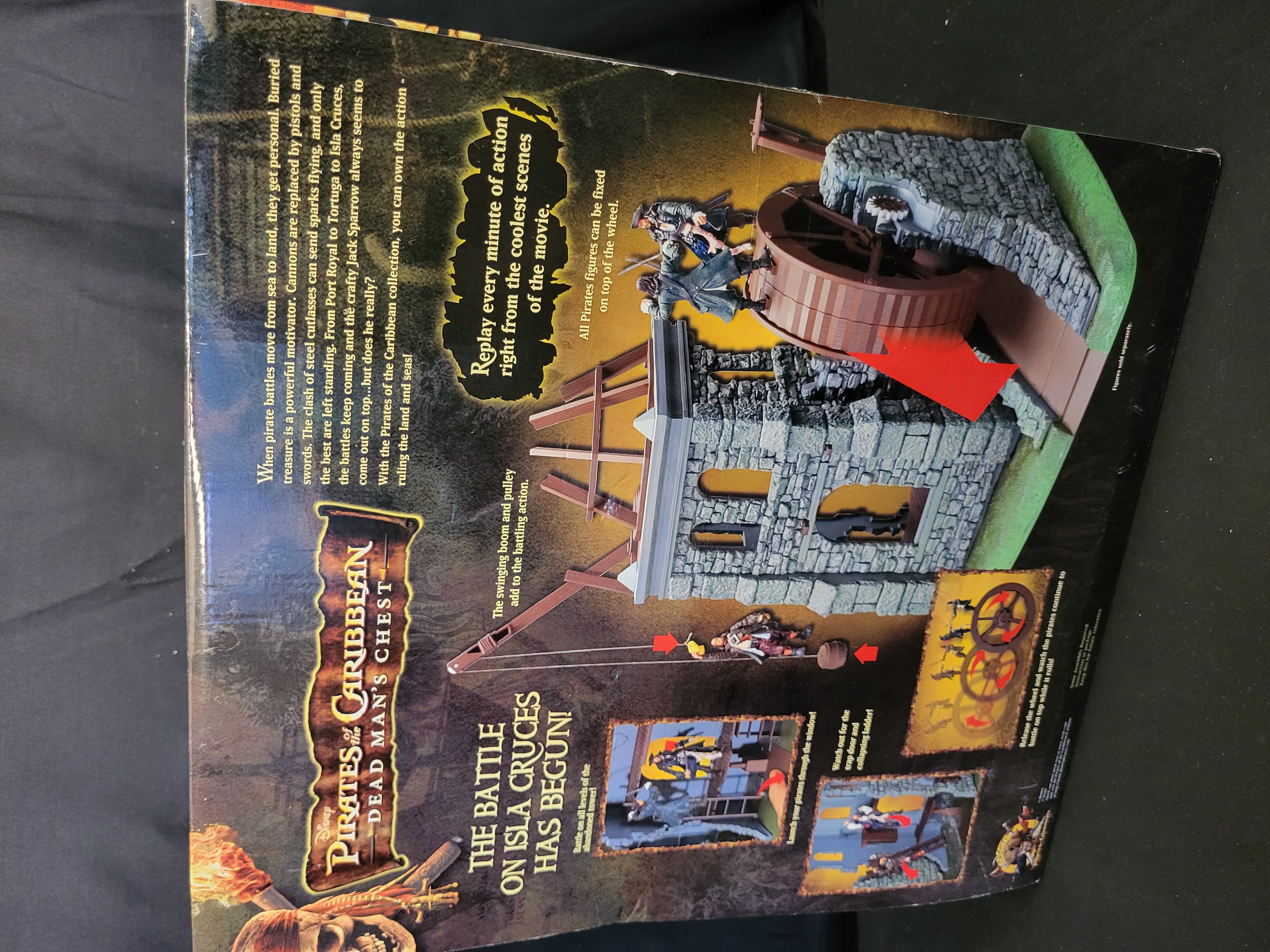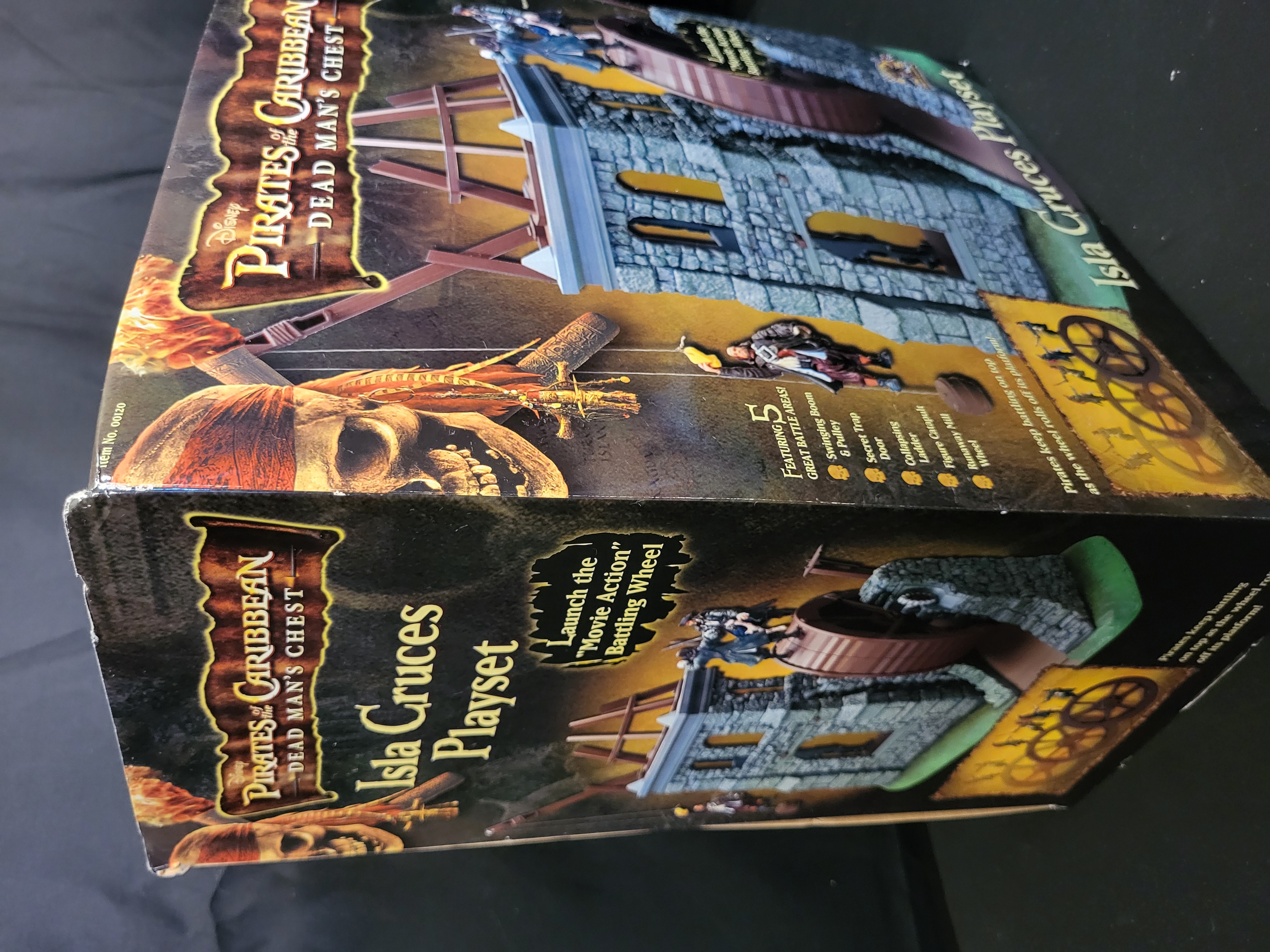 BID PER WHAT YOU SEE IN THE PHOTO, NOT THE AI GENERATED TITLES AND DESCRIPTIONS! A boxed Disney Pirates of the Caribbean: Dead Mans Chest Isla Cruces playset manufactured by Zizzle, circa 2006. This plastic playset is modeled after scenes from the motion picture and features a movie action battling wheel, a swinging boom and pulley, a secret trap door, a collapsing ladder, a figure catapult, and a runaway mill wheel. The item is identified by product number 00120 and includes original manufacturer branding and film-related graphics. The playset is housed in its original color-illustrated cardboard packaging. Action figures were sold separately and are not included with this lot.