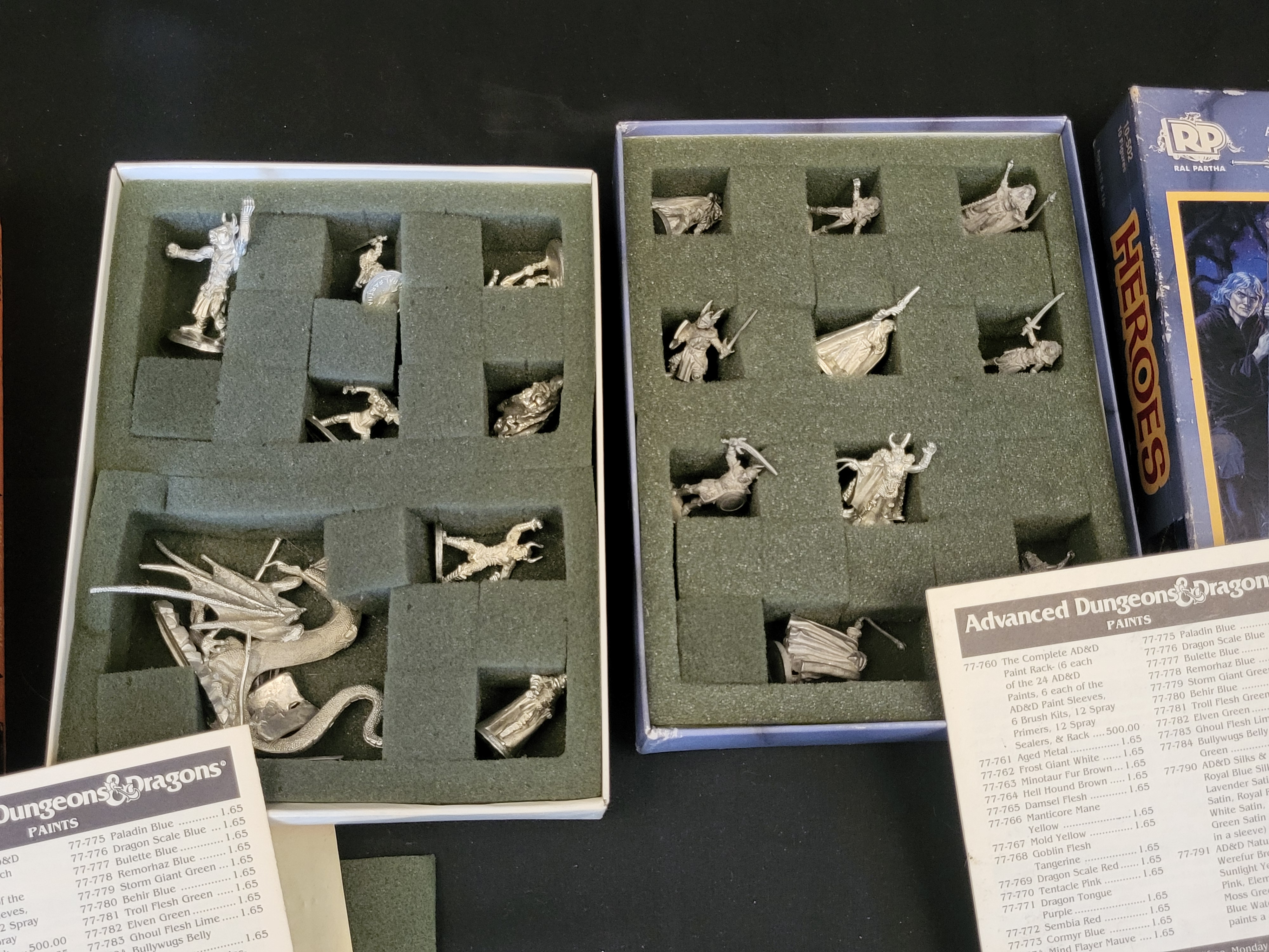 BID PER WHAT YOU SEE IN THE PHOTO, NOT THE AI GENERATED TITLES AND DESCRIPTIONS! A pair of boxed sets of Ral Partha 25mm scale metal miniatures for the Advanced Dungeons & Dragons Dragonlance campaign setting, comprising the Heroes (item 10-502) and Villains (item 10-504) collections. Produced circa 1989-1991 under license from TSR, Inc., these sets feature characters sculpted by Tom Meier and Dennis Mize. The Heroes set includes figures such as Raistlin, Tanis, Goldmoon, and Flint. The Villains set includes Lord Soth, Kitiara, and others. The miniatures are unpainted and housed within their original foam-lined boxes. Each set is accompanied by period promotional inserts for official AD&D paints. The Villains box features a RALIDIUM Lead Free Pewter sticker on the reverse.