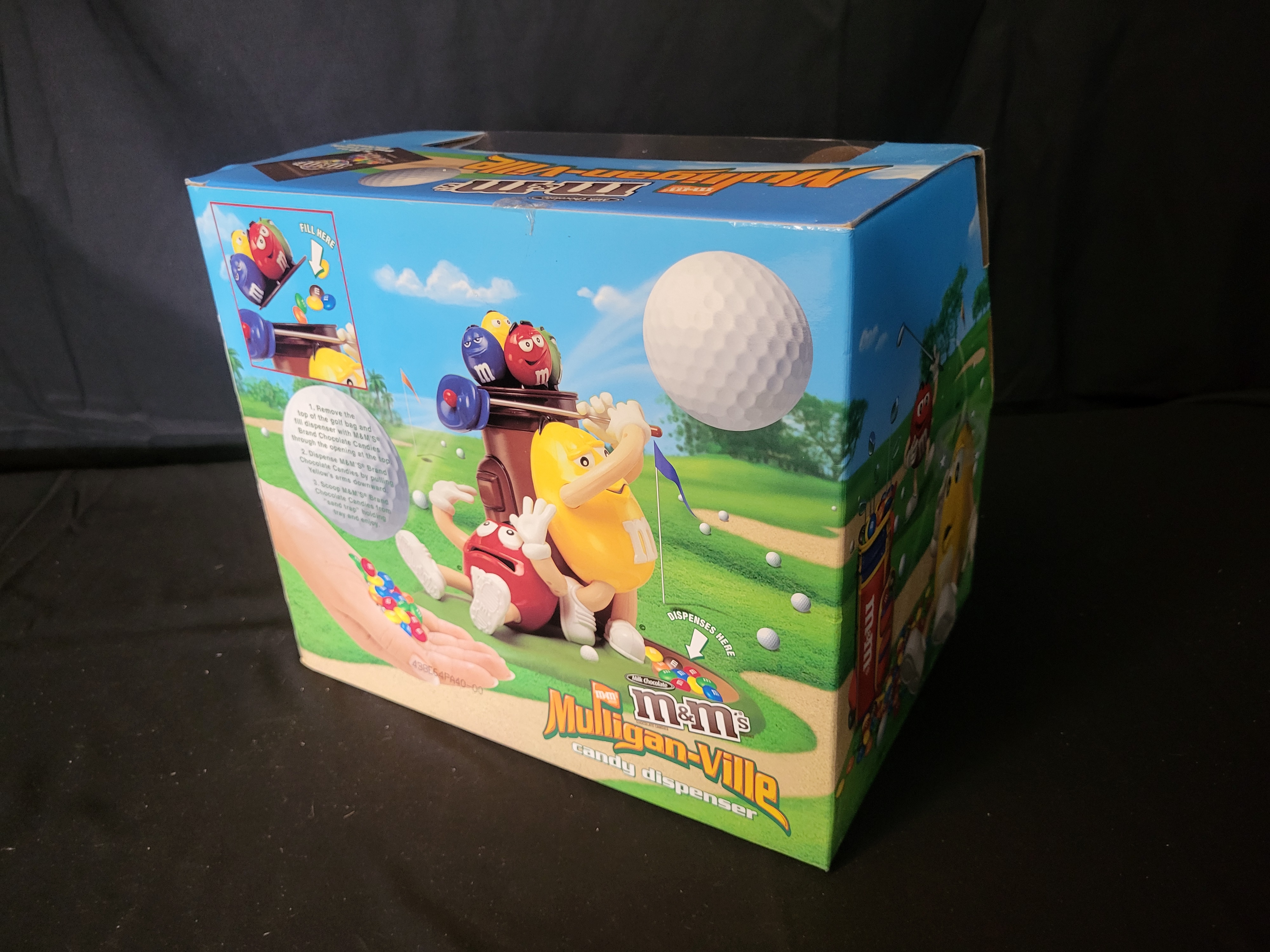 BID PER WHAT YOU SEE IN THE PHOTO, NOT THE AI GENERATED TITLES AND DESCRIPTIONS! M&M’s brand Mulligan-Ville candy dispenser, identified as a limited edition and the first in a series of official sports-themed dispensers. This plastic collectible features the Yellow M&M character in a golf swing pose positioned next to the Red M&M character and a brown golf bag. The golf bag serves as the reservoir for candy, which is dispensed into a sand trap tray at the base. The item is housed in its original illustrated cardboard retail packaging with a clear plastic display window. The reverse of the box features illustrated instructions for filling and dispensing.