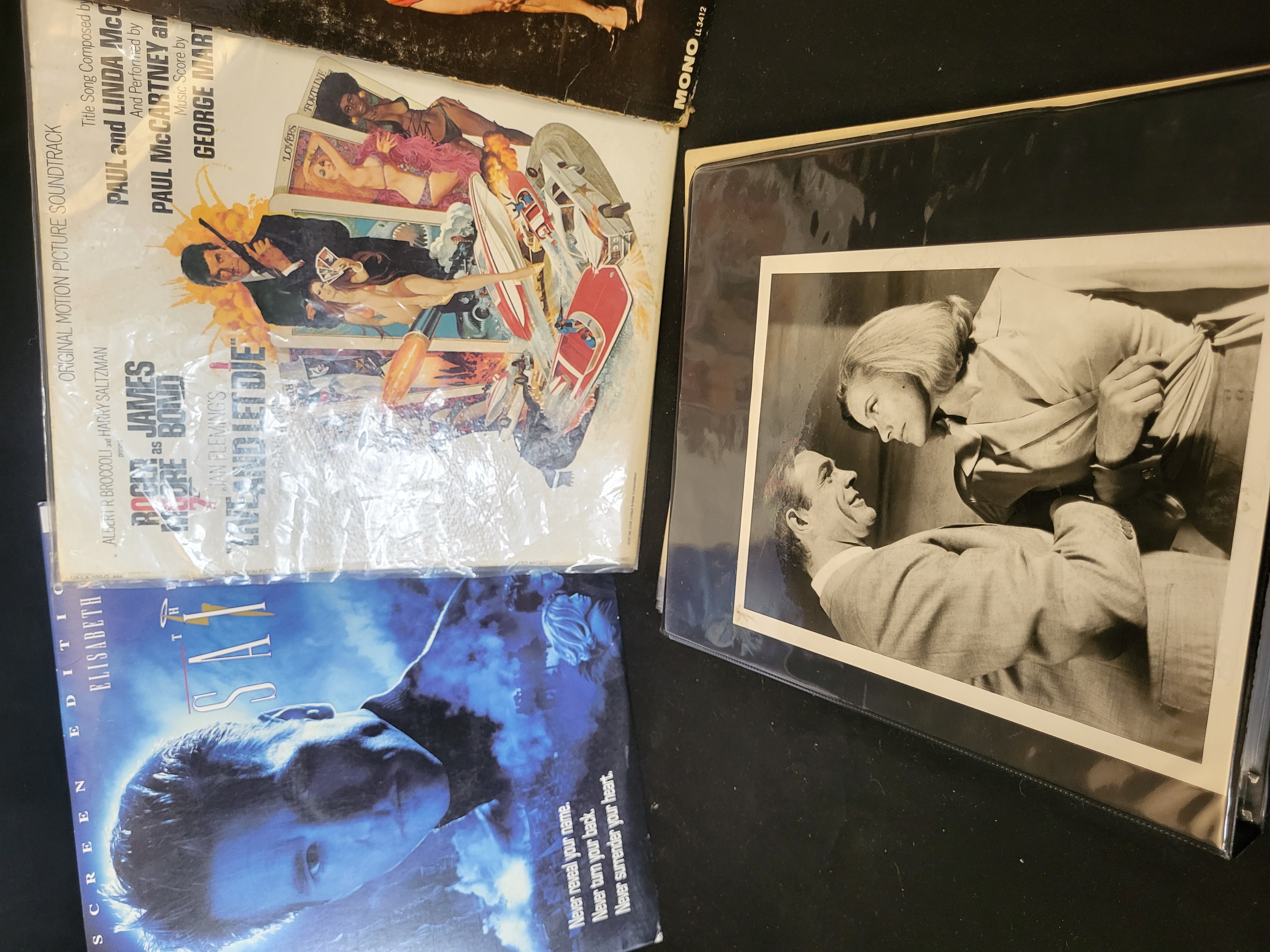 BID PER WHAT YOU SEE IN THE PHOTO, NOT THE AI GENERATED TITLES AND DESCRIPTIONS! A collection of film and music memorabilia primarily focused on the James Bond franchise. The lot includes a Live and Let Die Original Motion Picture Soundtrack vinyl LP (1973) on the United Artists label, featuring music by Paul and Linda McCartney and George Martin. Also present is a Themes From 007 The James Bond Thrillers vinyl LP by The Roland Shaw Orchestra, released by London Records in mono (LL 3412). The cinematic media includes a widescreen edition LaserDisc of the 1997 film The Saint starring Val Kilmer. Accompanying these items is a black three-ring binder containing an assortment of promotional film photographs in both black-and-white and color, alongside a Women of James Bond In Motion lenticular trading card checklist. The photographic materials are stored within clear plastic protective sleeves.