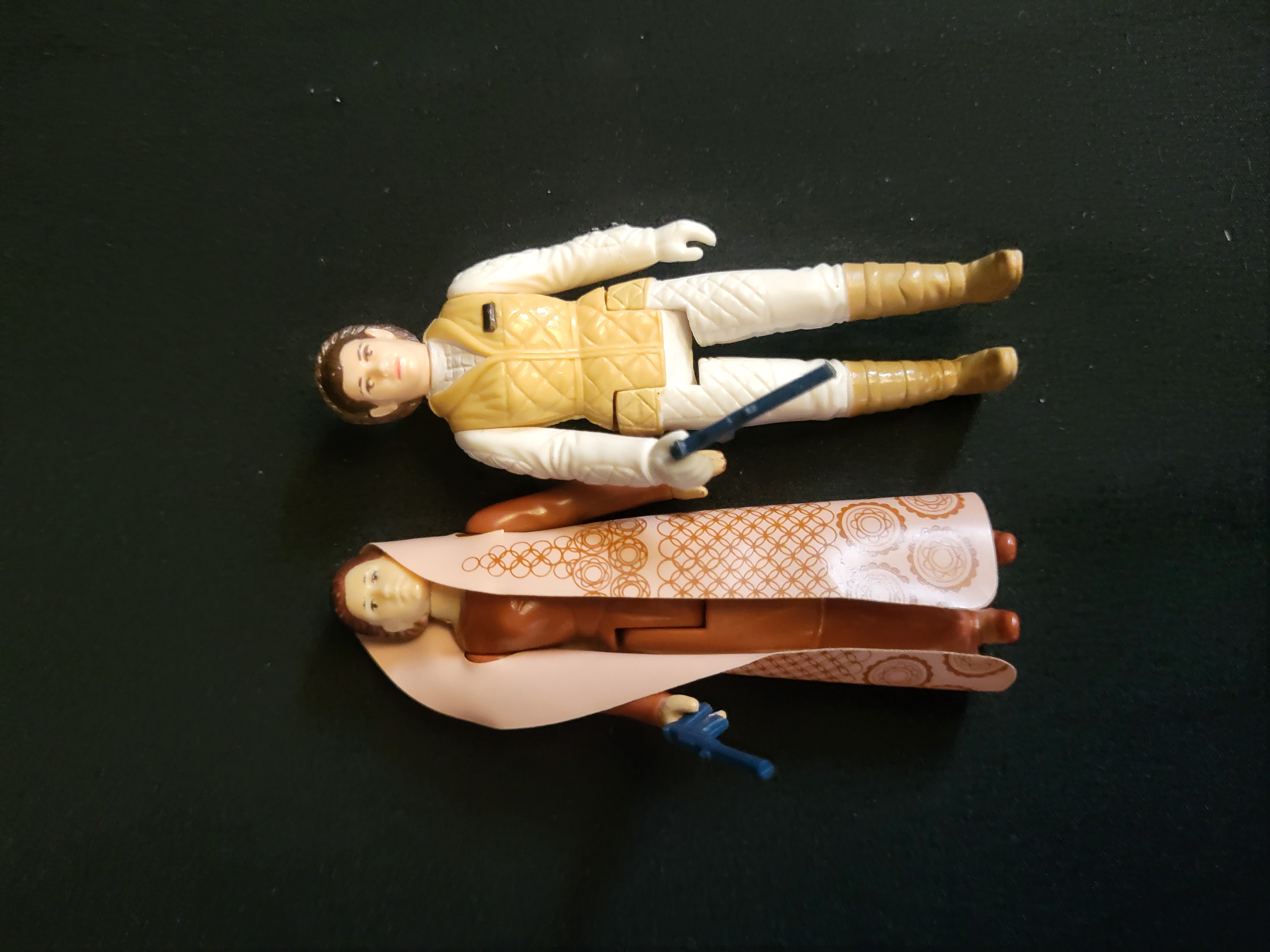 BID PER WHAT YOU SEE IN THE PHOTO, NOT THE AI GENERATED TITLES AND DESCRIPTIONS! A pair of vintage Kenner action figures representing Princess Leia Organa from the Star Wars: The Empire Strikes Back series. The first figure is Princess Leia Organa in Hoth Outfit, featuring a white jumpsuit and a tan quilted vest. This figure bears the molded inscriptions MADE IN HONG KONG and © L.F.L. 1980 on the reverse of the legs. The second figure is Princess Leia Organa in Bespin Gown, featuring a reddish-brown jumpsuit and a removable pink vinyl cape decorated with a printed orange geometric pattern. The lot includes two blue plastic blaster accessories.