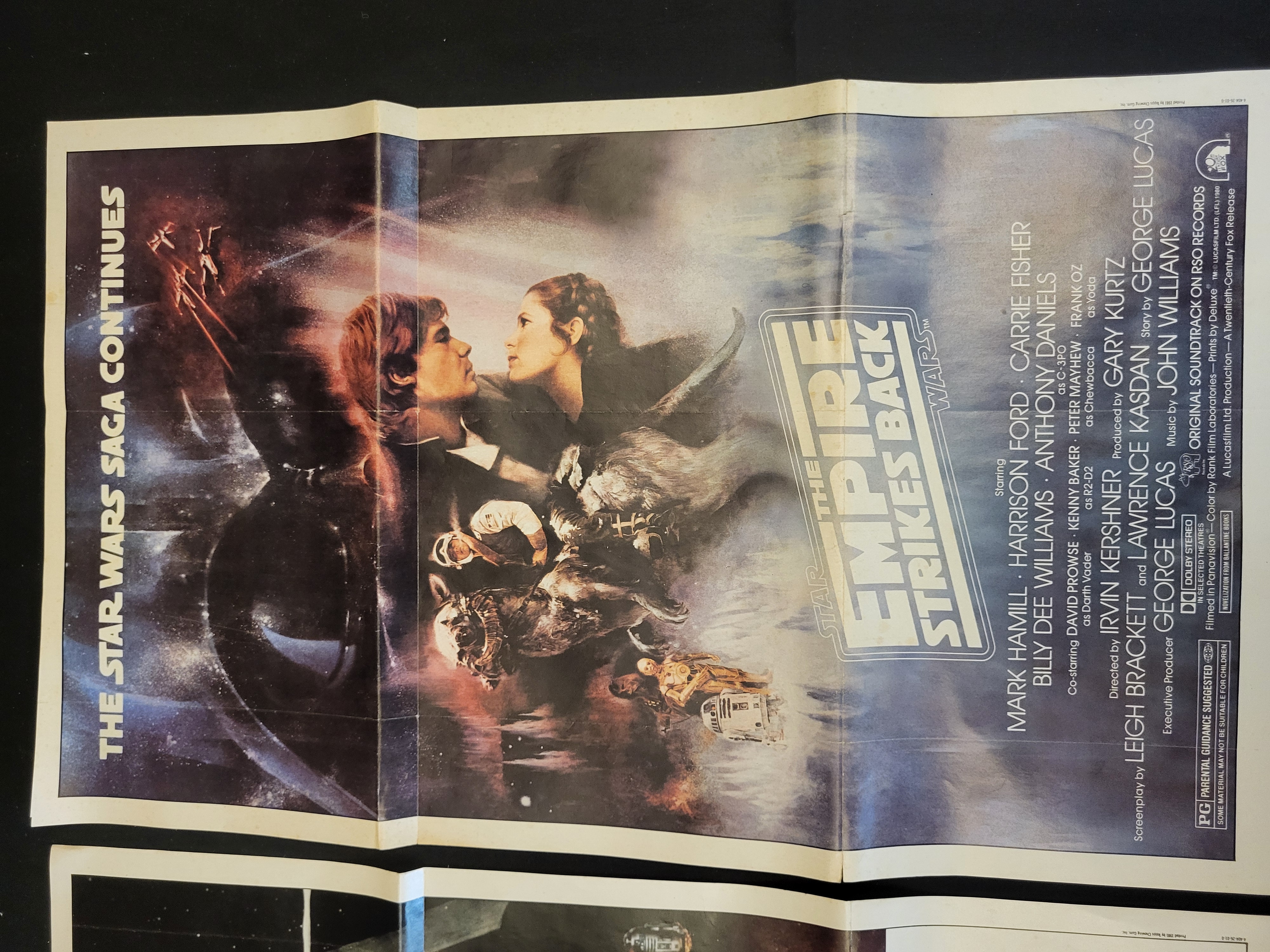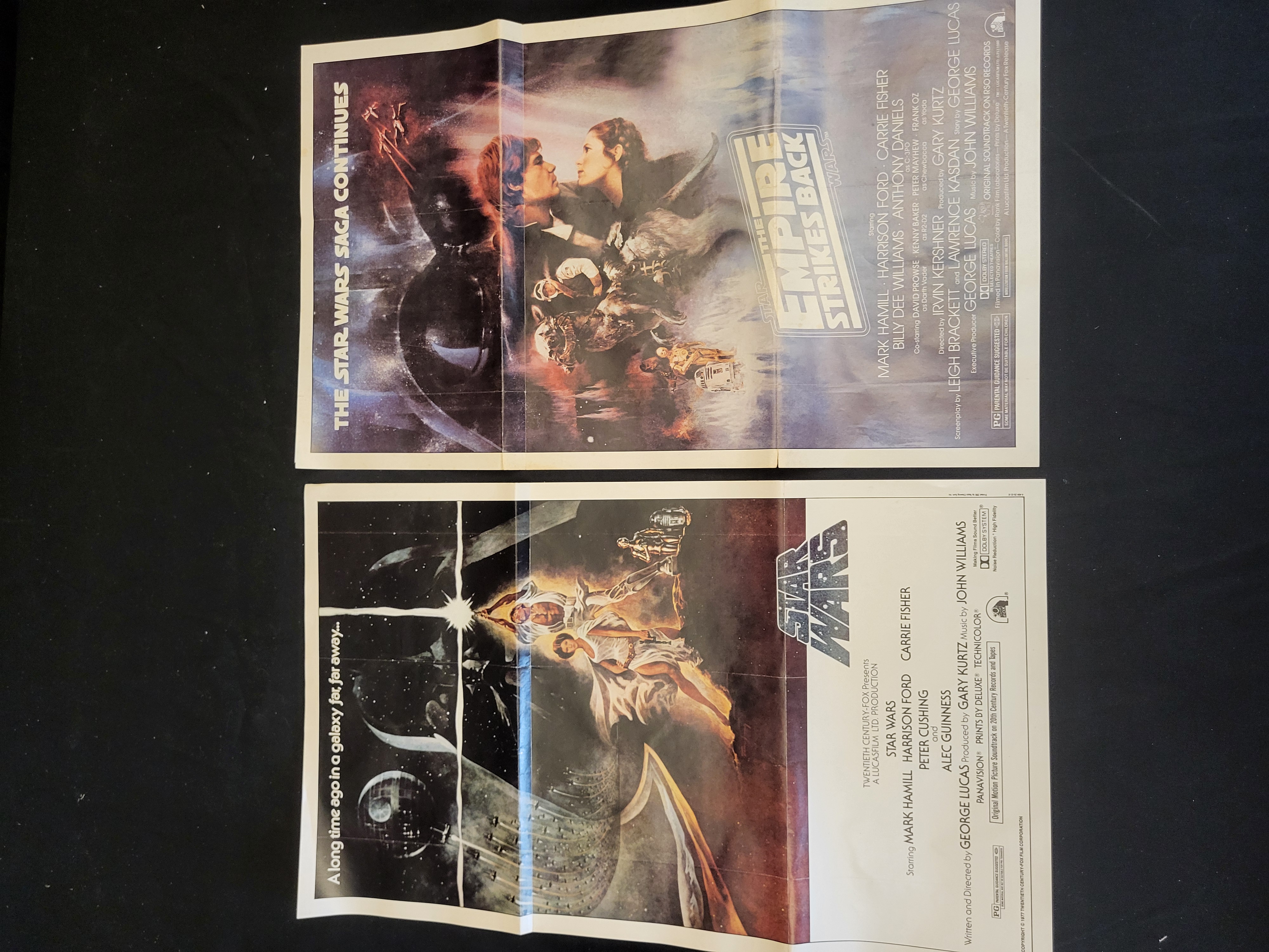 BID PER WHAT YOU SEE IN THE PHOTO, NOT THE AI GENERATED TITLES AND DESCRIPTIONS! A pair of vintage promotional paper posters for the films Star Wars and The Empire Strikes Back. Each horizontal poster features illustrated artwork, including the Style A design for the original Star Wars and the Style B design for the sequel. Both items are marked Printed 1981 by Topps Chewing Gum, Inc. in the lower right margin, identifying them as promotional inserts. The posters include title logos, credits for cast and crew, and studio logos for 20th Century Fox and Lucasfilm Ltd.