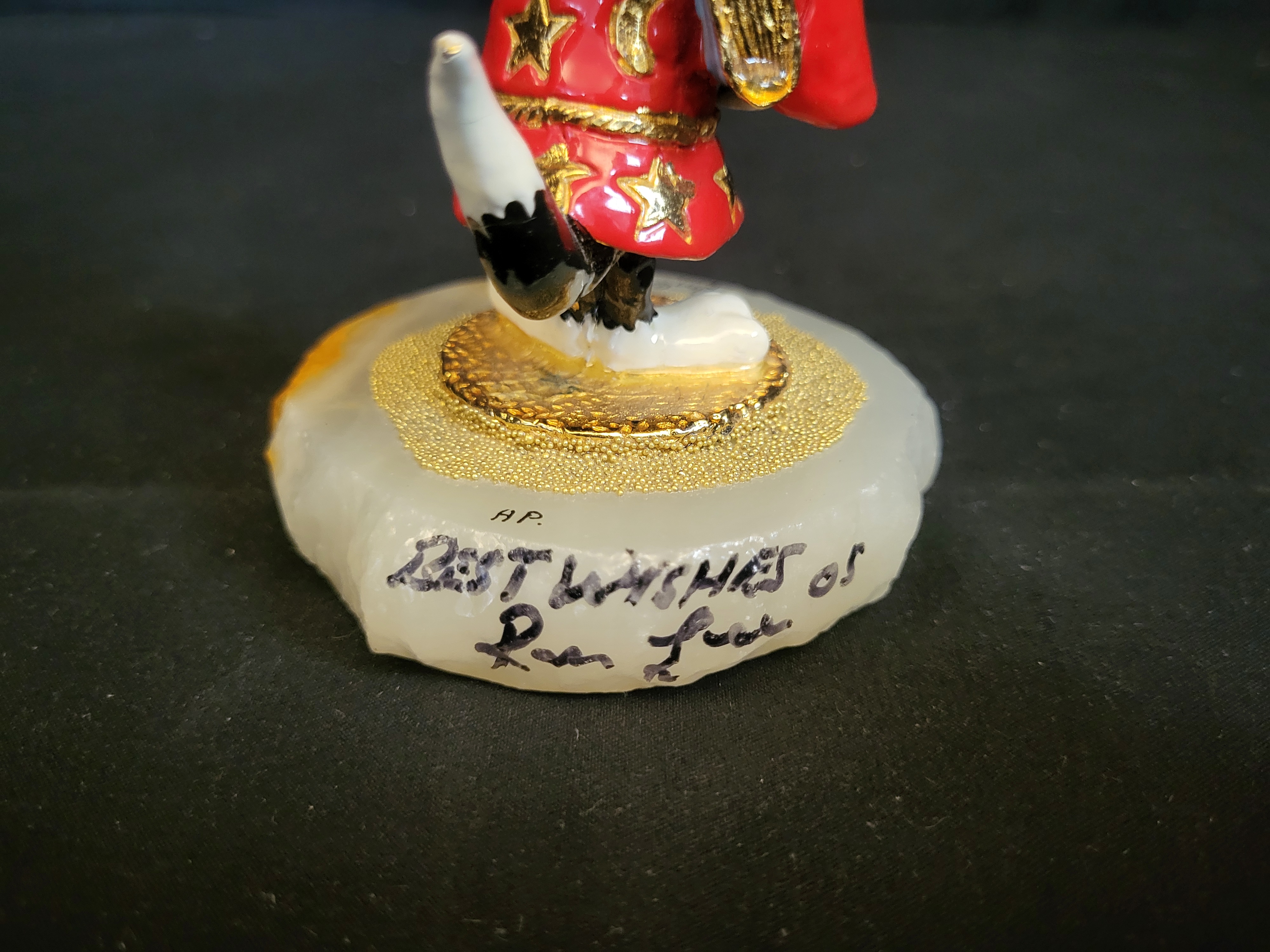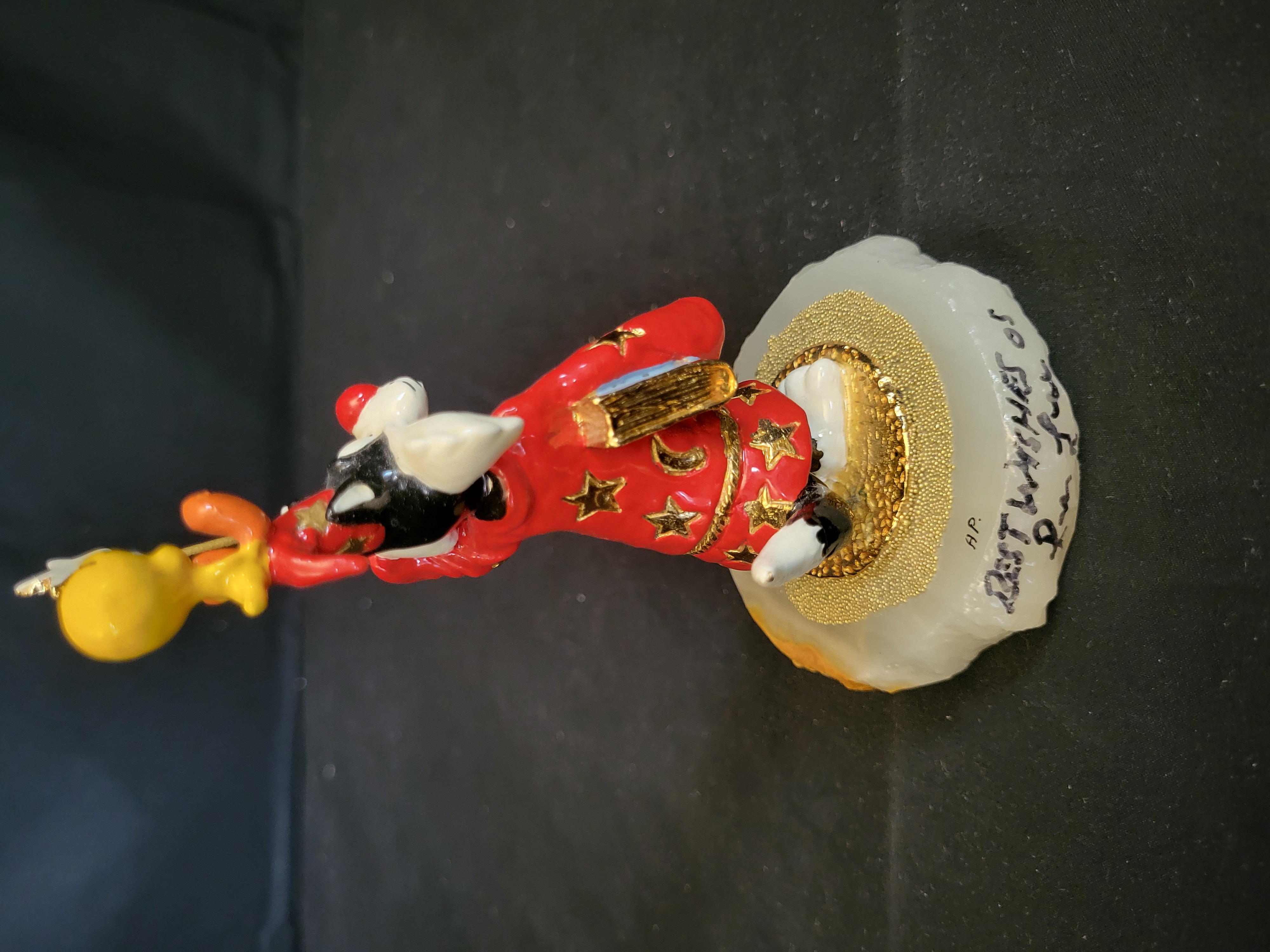 BID PER WHAT YOU SEE IN THE PHOTO, NOT THE AI GENERATED TITLES AND DESCRIPTIONS! A hand-painted sculpture by Ron Lee featuring the Warner Bros. Looney Tunes characters Sylvester and Tweety. The piece depicts Sylvester dressed as a magician in a red robe with gold-toned stars, holding a golden book and a star-tipped wand with Tweety perched on the end. The figure is mounted on a polished, irregular stone base, likely onyx or agate, with a central ring of gold-colored beads. The base is marked Ron copyright 2003 on the top surface. A handwritten inscription on the side of the base reads A.P. BEST WISHES 05 Ron Lee, designating the item as an artist proof.