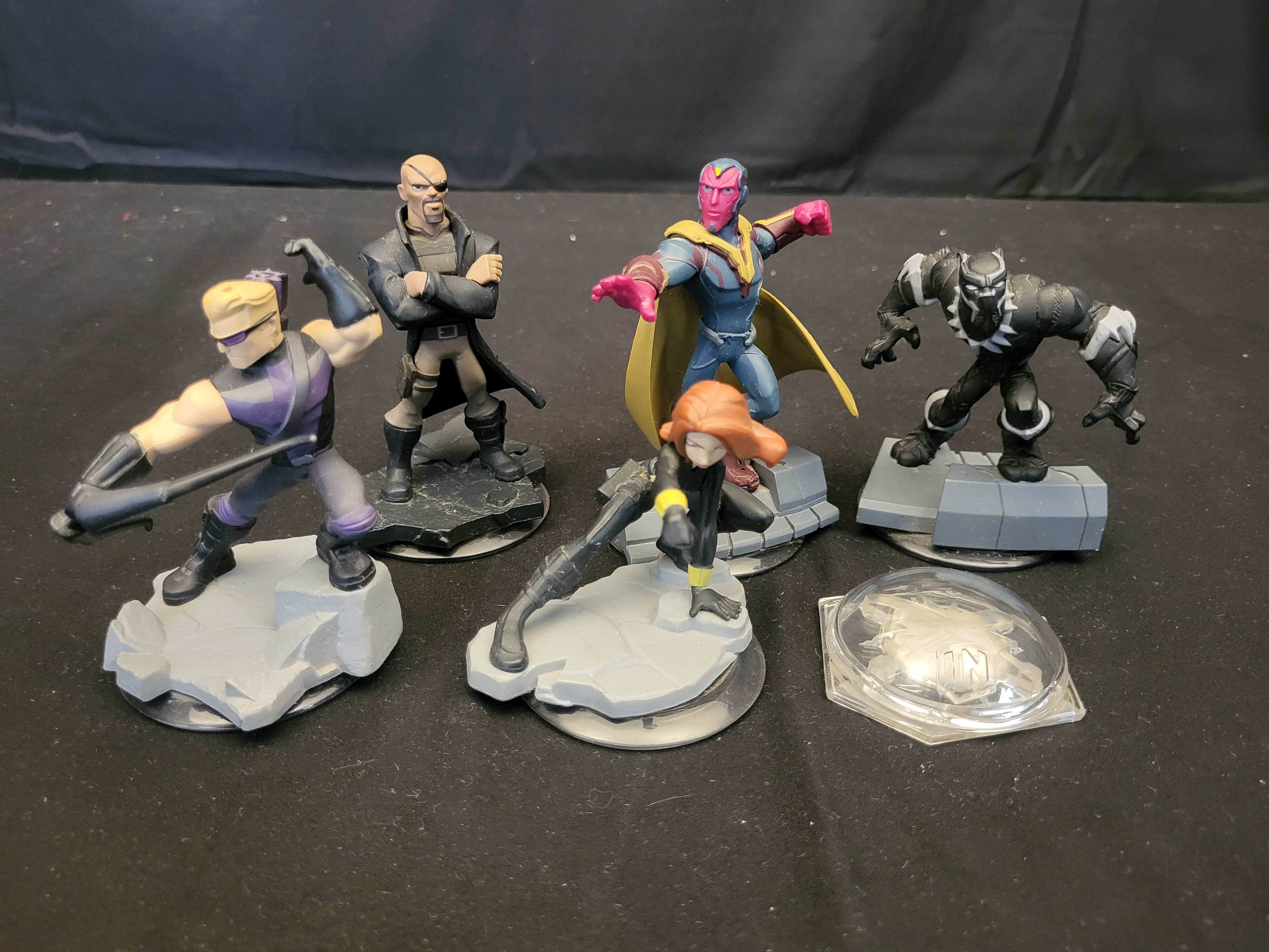 BID PER WHAT YOU SEE IN THE PHOTO, NOT THE AI GENERATED TITLES AND DESCRIPTIONS! A collection of molded plastic figurines and a gaming accessory from the Disney Infinity 3.0 Marvel Edition series. The group includes stylized character figures including Hawkeye, Nick Fury, Vision, Black Widow, and Black Panther. Each figure is constructed with a cartoonish aesthetic and mounted upon an integrated thematic base set on a clear circular pedestal. The collection is accompanied by a clear hexagonal plastic play set piece featuring a raised emblem with the letters IN. These items were produced for use with the Disney Infinity video game system.