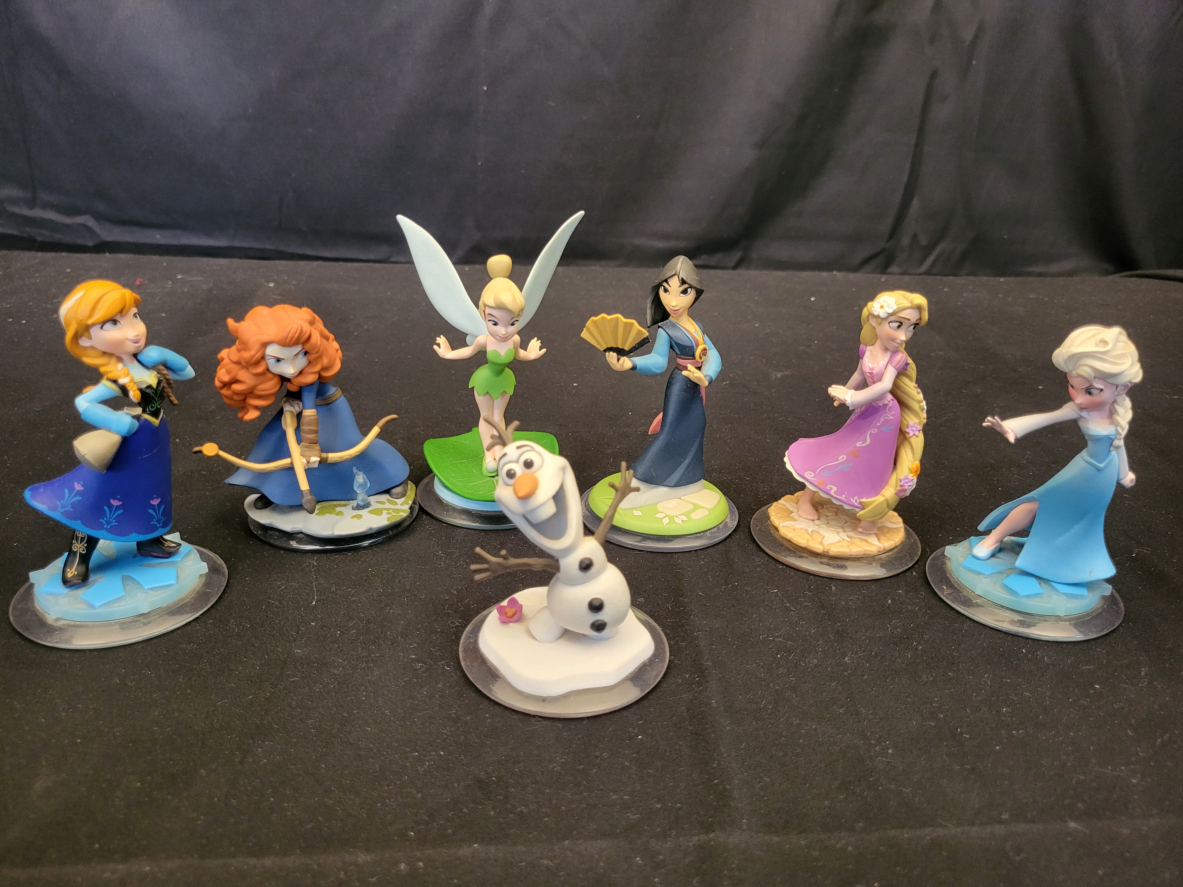 BID PER WHAT YOU SEE IN THE PHOTO, NOT THE AI GENERATED TITLES AND DESCRIPTIONS! A collection of Disney Infinity and Disney Infinity 2.0 Edition character figures. The group includes various characters from Disney animated features, specifically Anna, Elsa, and Olaf from Frozen, Merida from Brave, Tinker Bell from Peter Pan, Mulan, and Rapunzel from Tangled. Each figure is manufactured from molded plastic and features a stylized design consistent with the video game series. The figures are mounted on integrated clear circular bases and exhibit vibrant multi-colored paint applications. These pieces were produced as interactive components for the Disney Infinity gaming system.