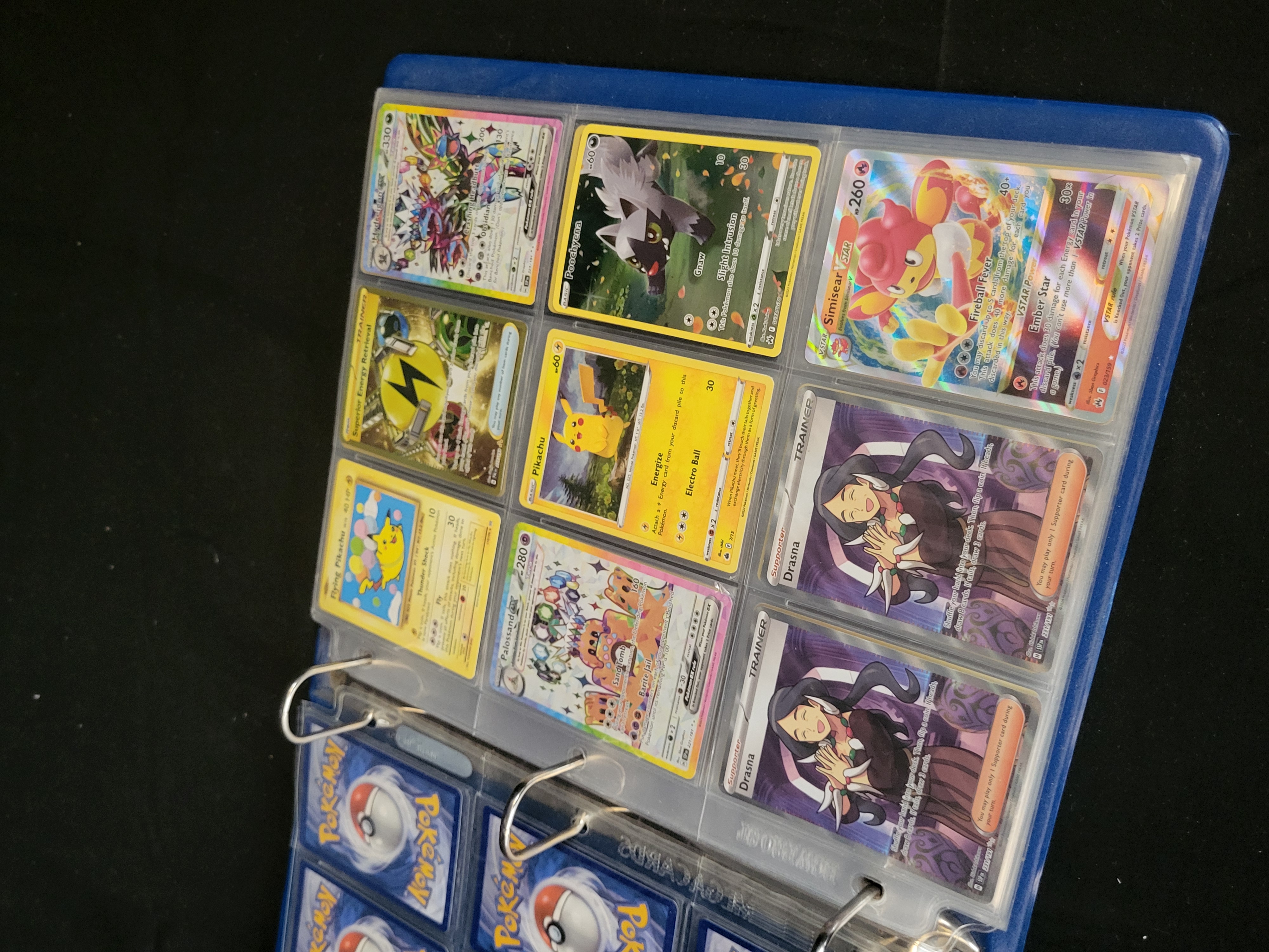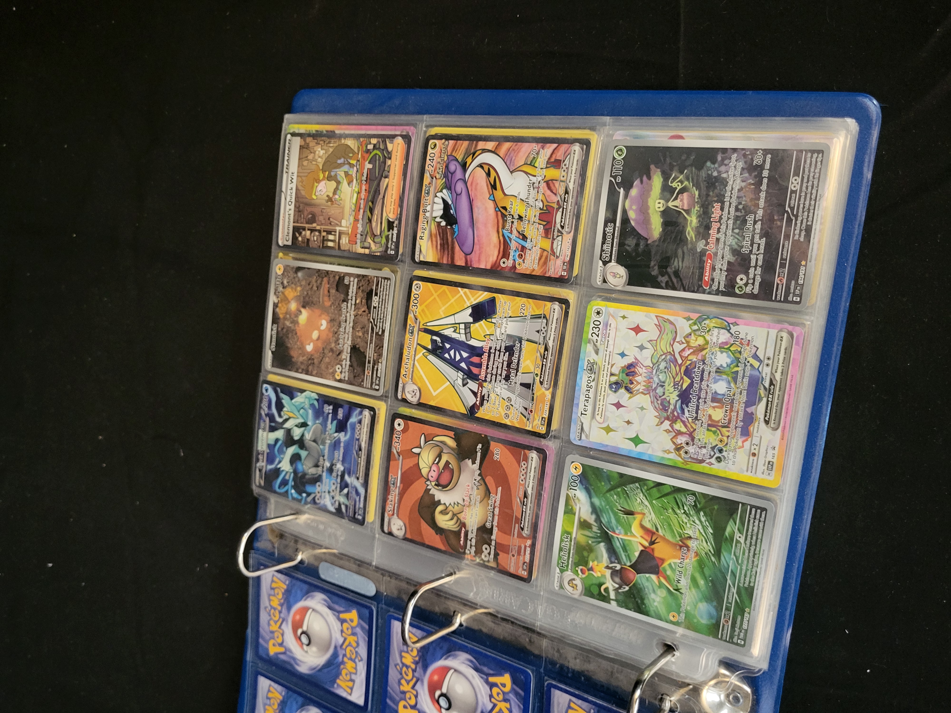 BID PER WHAT YOU SEE IN THE PHOTO, NOT THE AI GENERATED TITLES AND DESCRIPTIONS! A collection of Pokémon trading cards spanning multiple eras from the late 20th century to the 21st century. The assortment is housed in a blue three-ring binder with multi-pocket protective sleeves. The group includes a variety of card types such as holographic, full-art, V, VMAX, ex, and VSTAR cards. Notable characters represented include multiple iterations of Pikachu, Charizard, Kangaskhan, Bulbasaur, Terapagos, and Tatsugiri. The collection features Trainer and Supporter cards in both English and Japanese languages. Specific examples identified include vintage Base Set cards and modern releases such as Crown Zenith and SV Prismatic Evolutions.