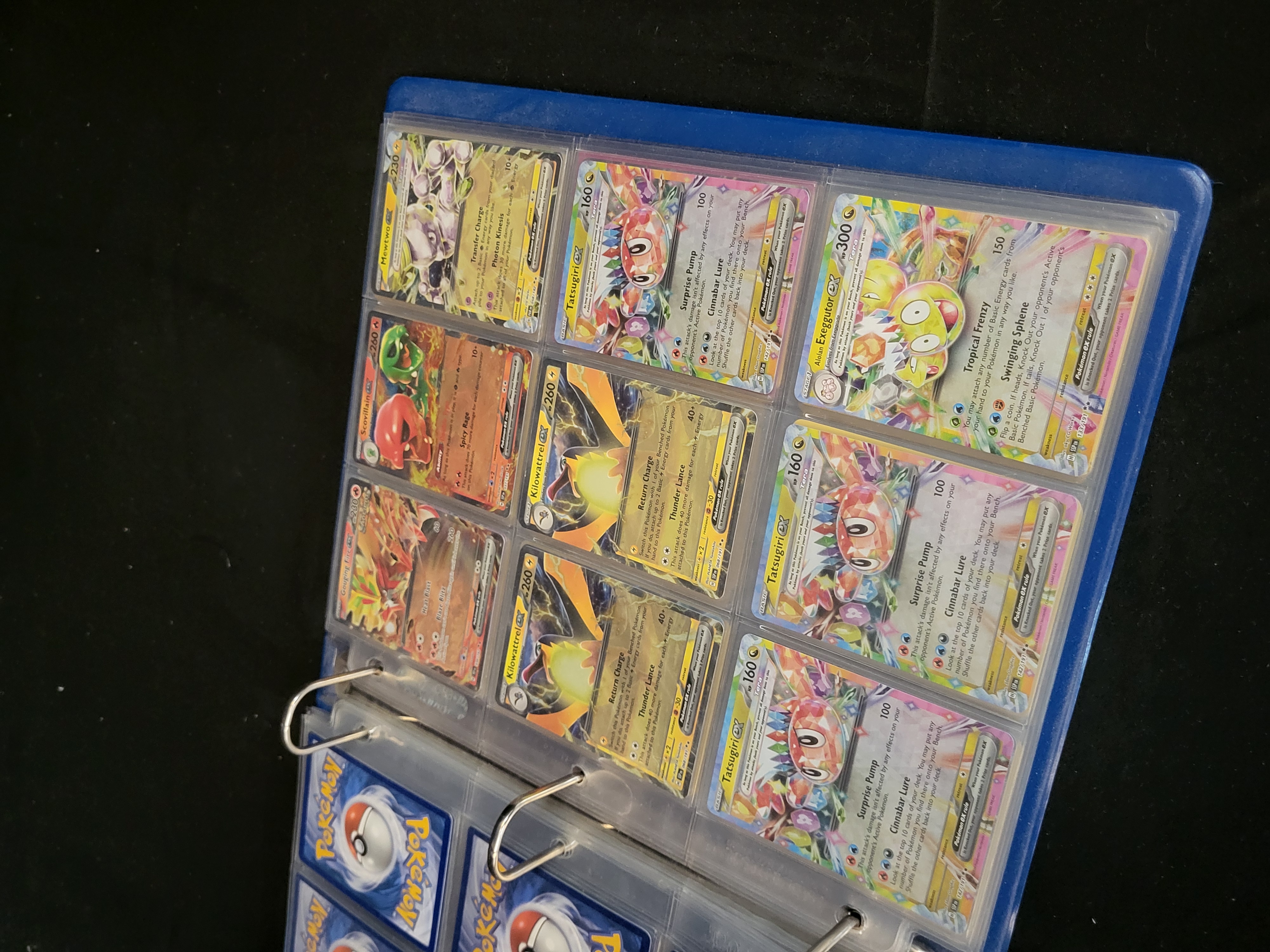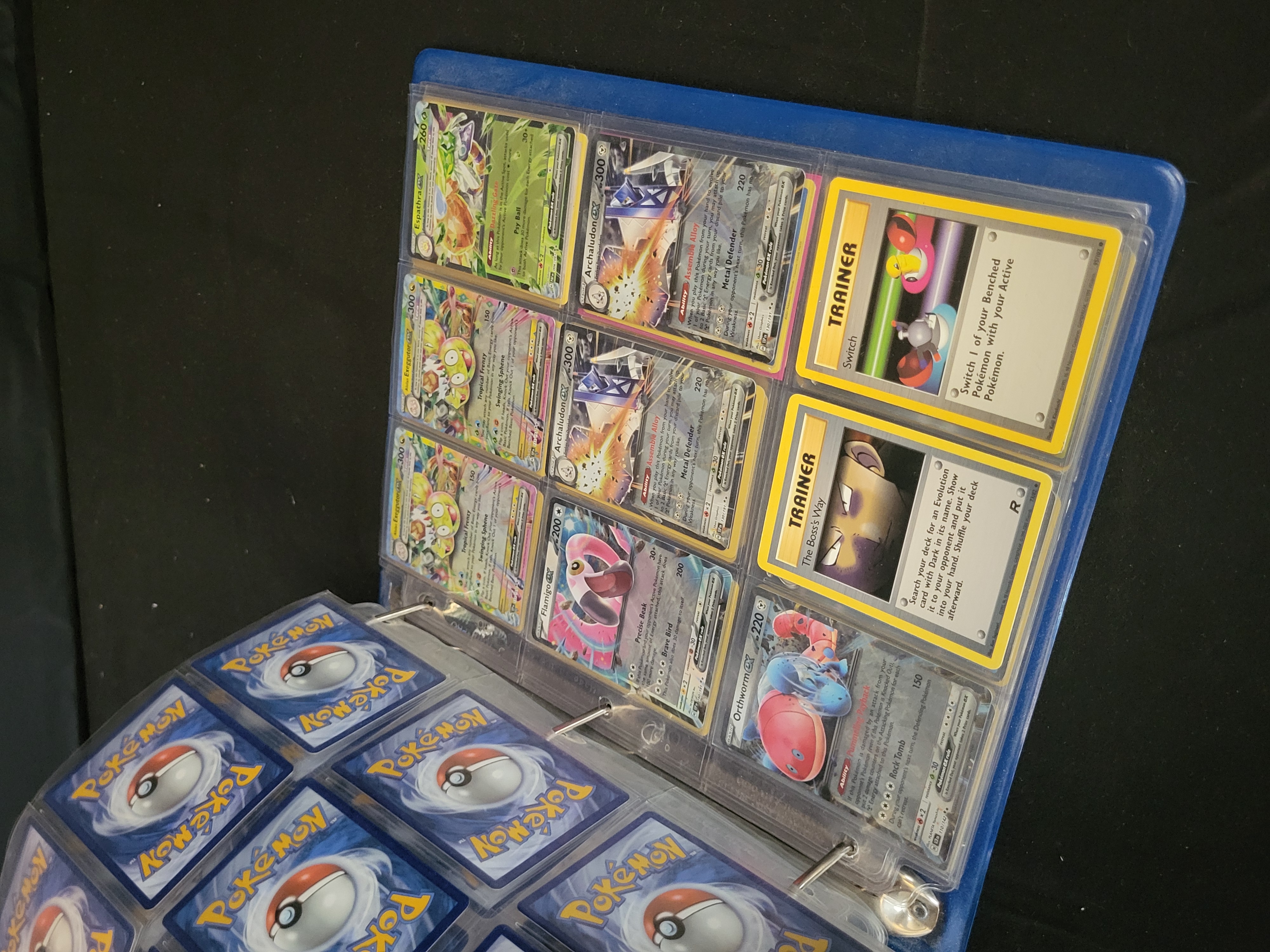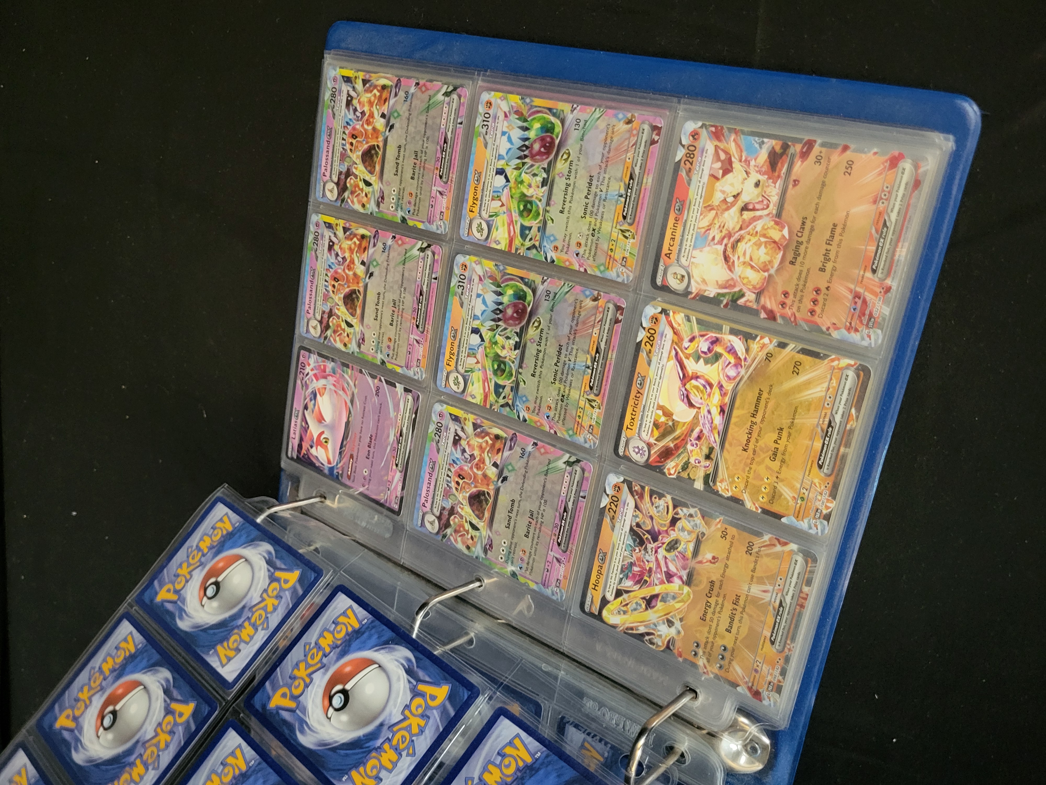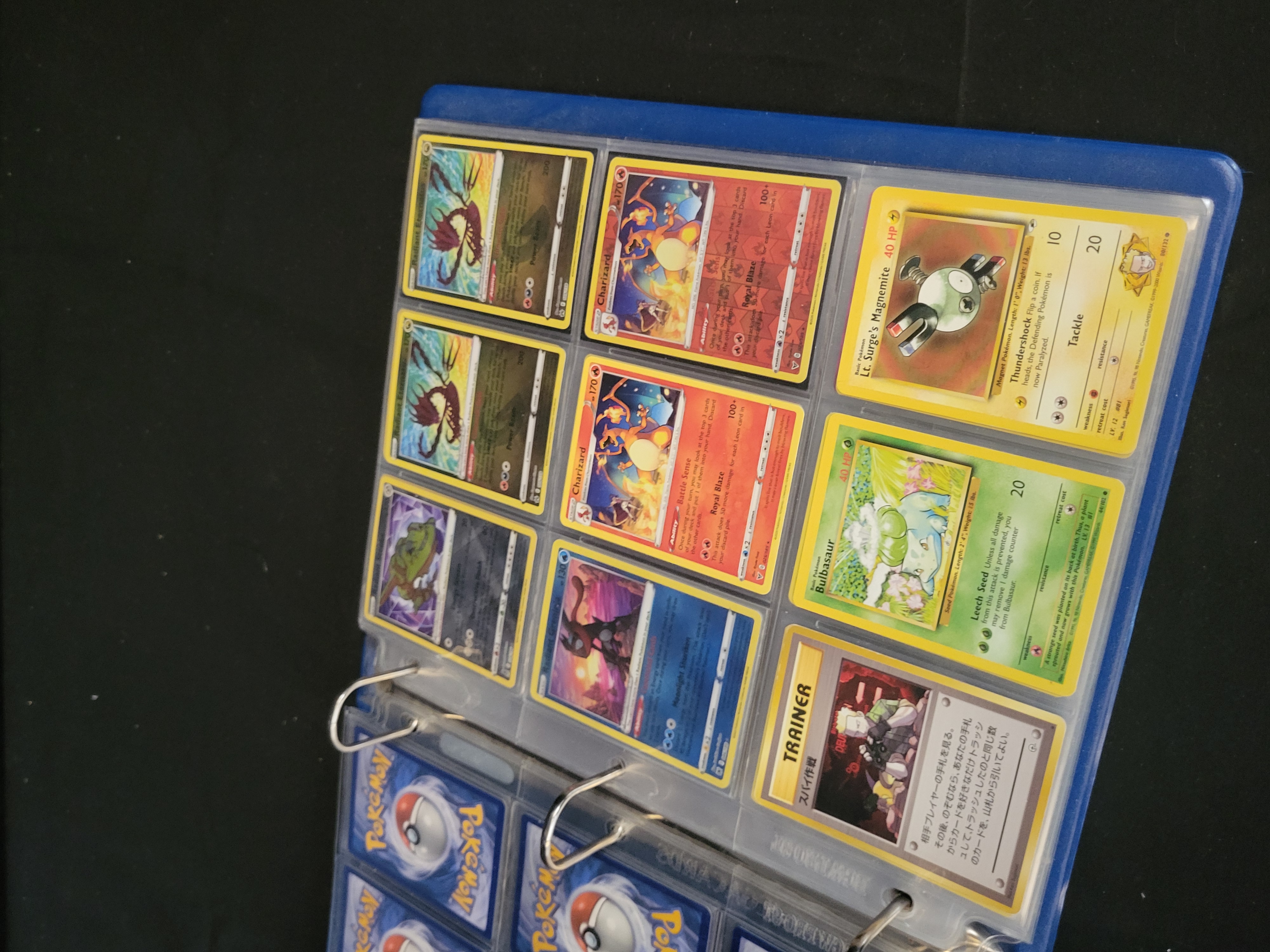 The cards generally appear to be in good condition as viewed through protective plastic housings. Several modern high-rarity cards are individually sleeved within the binder pages. Minor surface wear consistent with handling may be present on vintage examples.