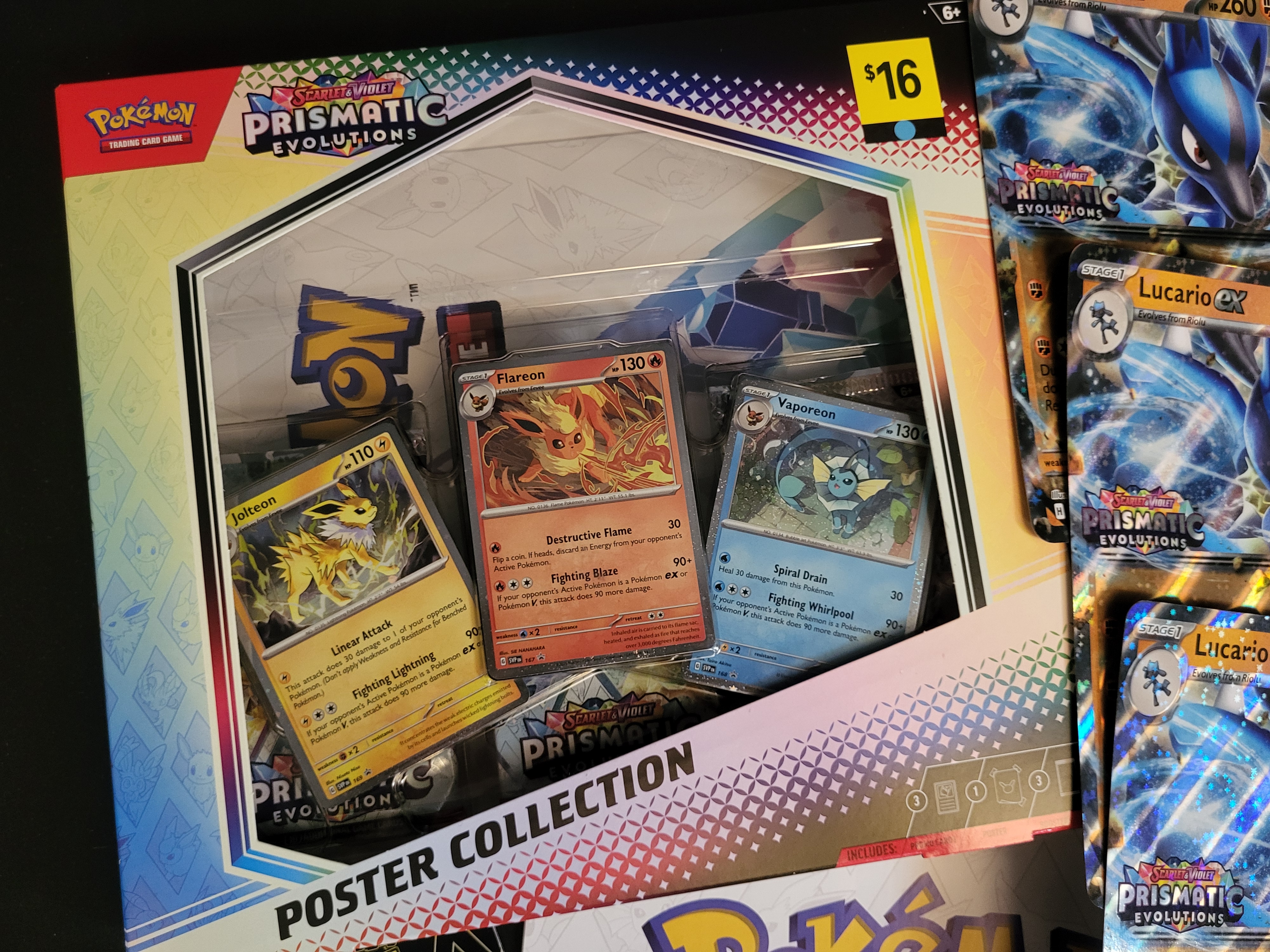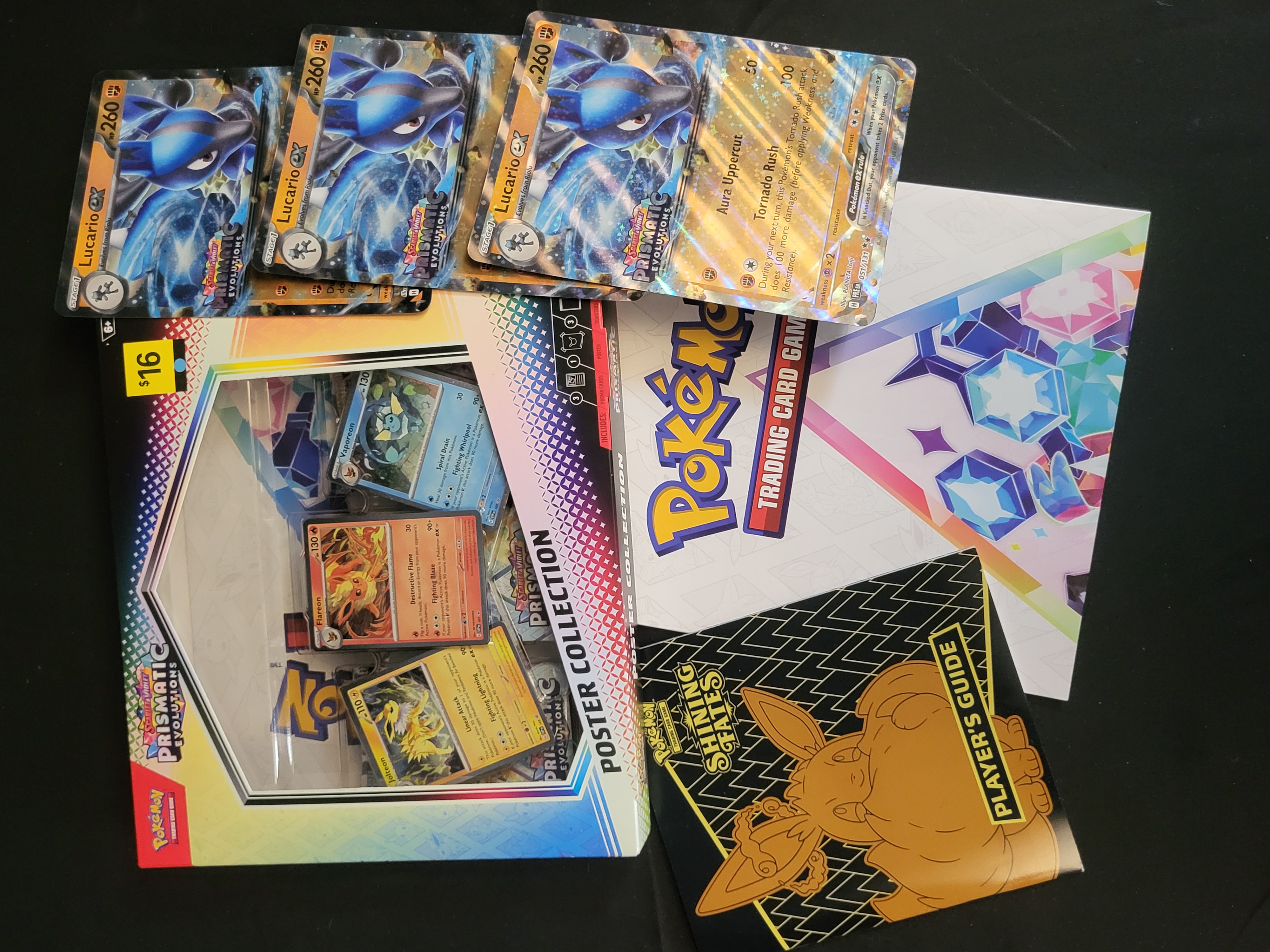 BID PER WHAT YOU SEE IN THE PHOTO, NOT THE AI GENERATED TITLES AND DESCRIPTIONS! This collection includes a Pokemon Scarlet and Violet Prismatic Evolutions Poster Collection box. The packaging contains three holographic promo cards featuring Jolteon, Flareon, and Vaporeon, as well as a themed poster. Also included are several loose Lucario ex holographic cards from the Prismatic Evolutions expansion and a Pokemon Sword and Shield Shining Fates Player Guide featuring Gigantamax Eevee. The items are made of printed cardstock and paper. Notable markings include the Scarlet and Violet Prismatic Evolutions set logos, individual card names, and a retail price sticker on the box.