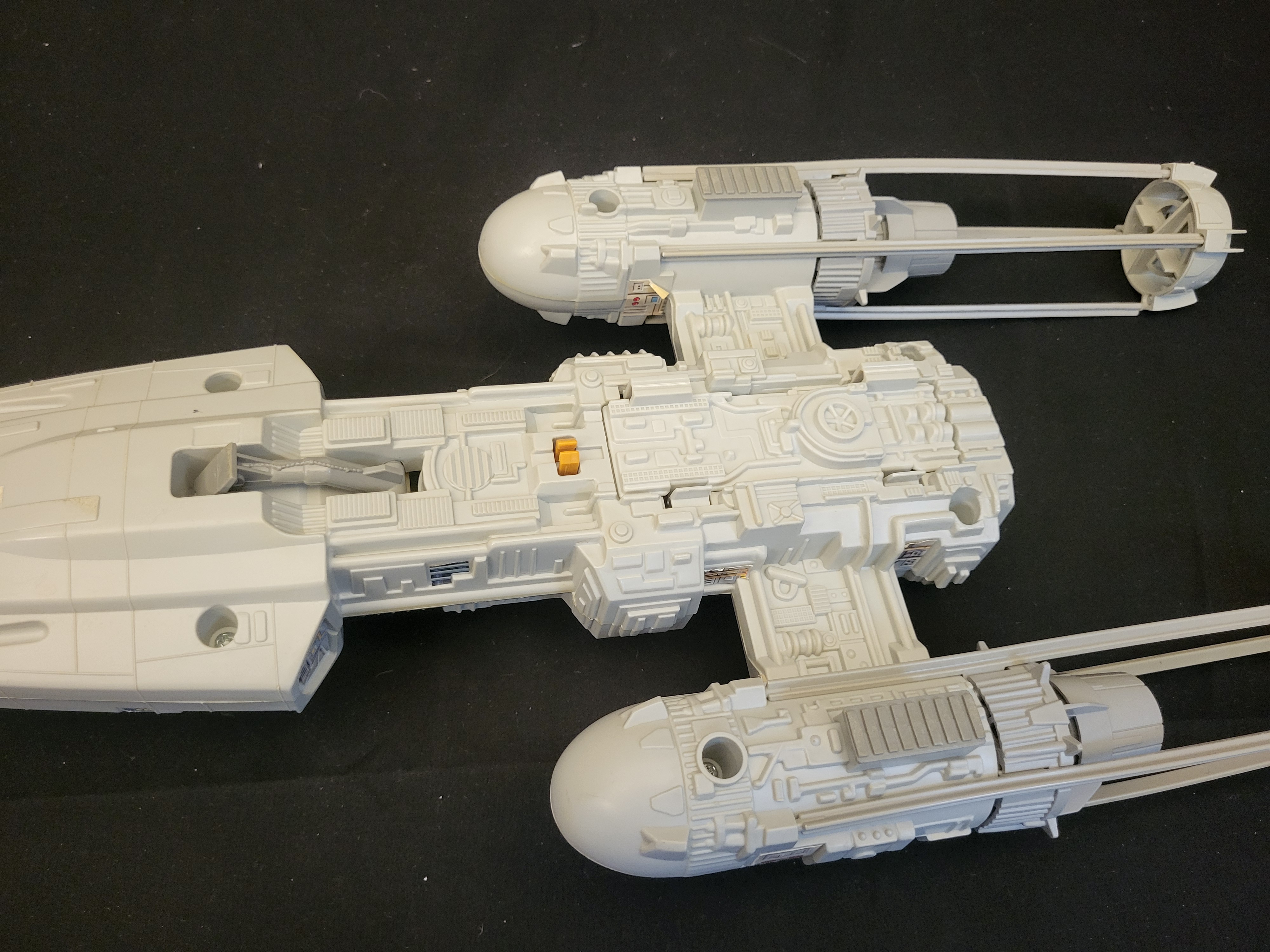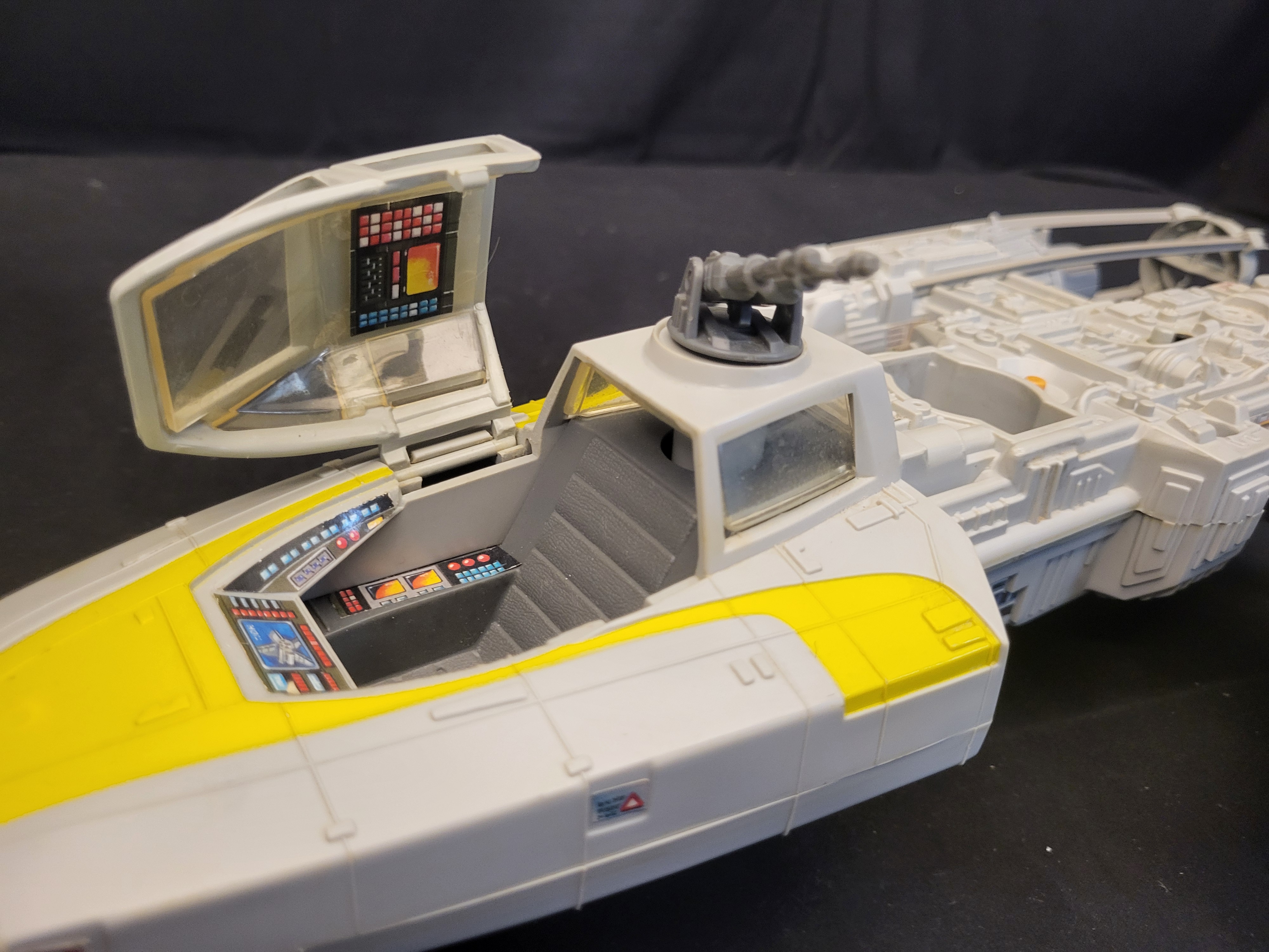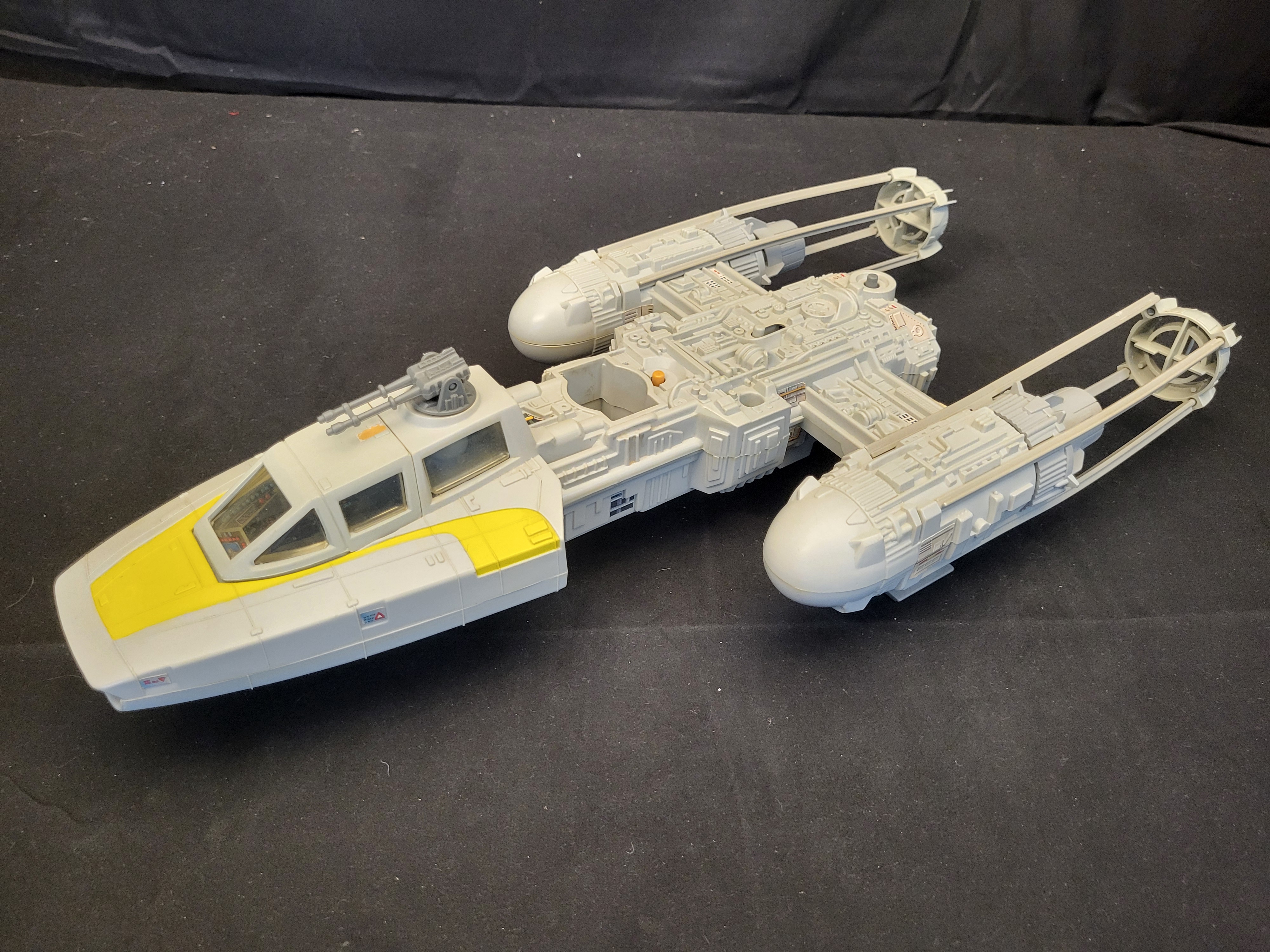 BID PER WHAT YOU SEE IN THE PHOTO, NOT THE AI GENERATED TITLES AND DESCRIPTIONS! A 1983 Kenner Star Wars Return of the Jedi Y-Wing Fighter toy vehicle. This model is constructed from molded light-gray and yellow plastic. It features an opening cockpit with interior control panel decals, a top-mounted swiveling ion cannon turret, and a recessed socket for an astromech droid figure. The vehicle is adorned with various original stickers, including decals containing Japanese text such as 危険. The design includes two long engine nacelles with rear exhaust ports and a central fuselage with a retractable front landing skid.
