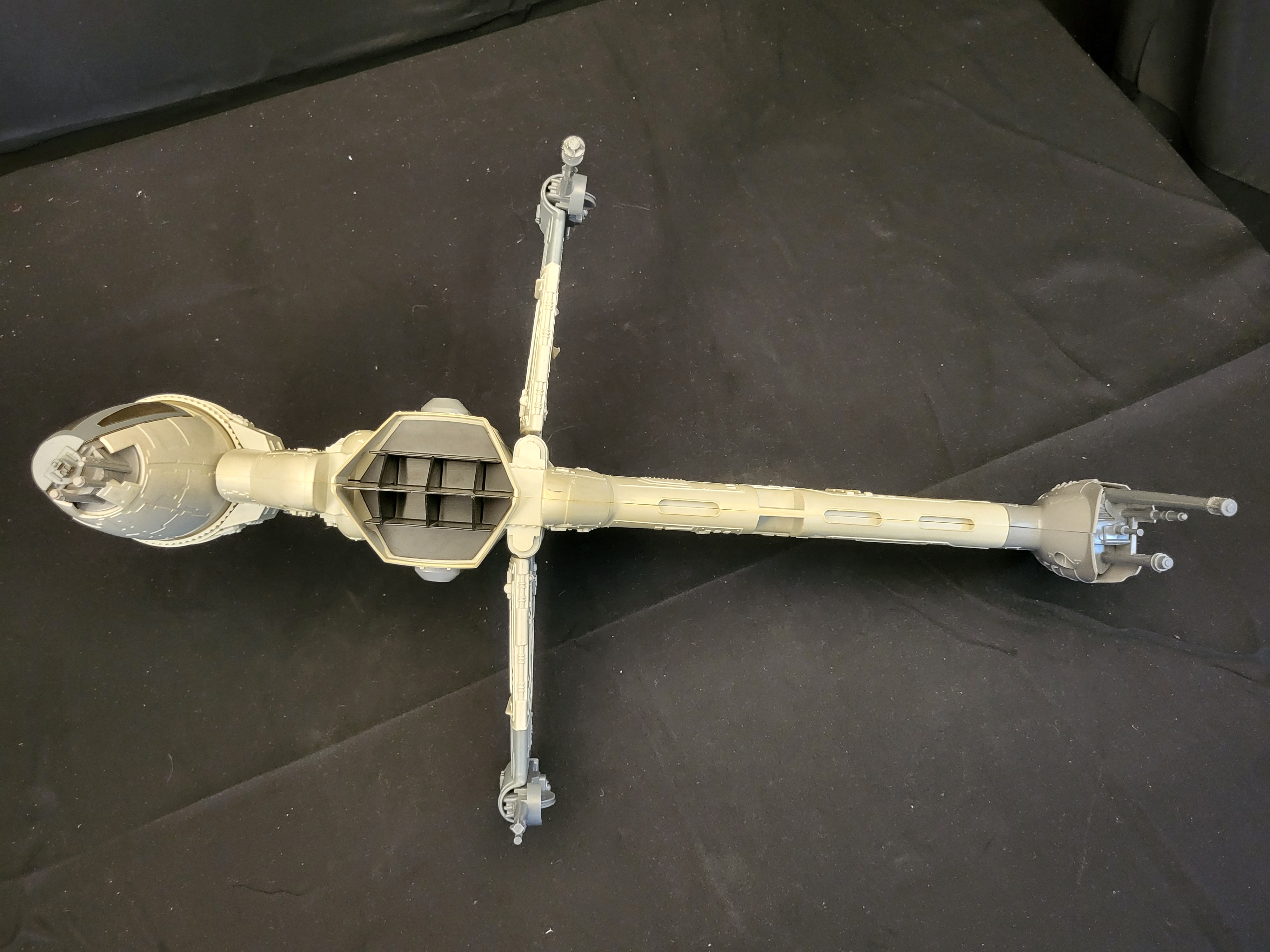 The plastic shows age-related discoloration and yellowing throughout. Minor surface wear and scuffing are present, specifically on the decal applications and wing tips.
