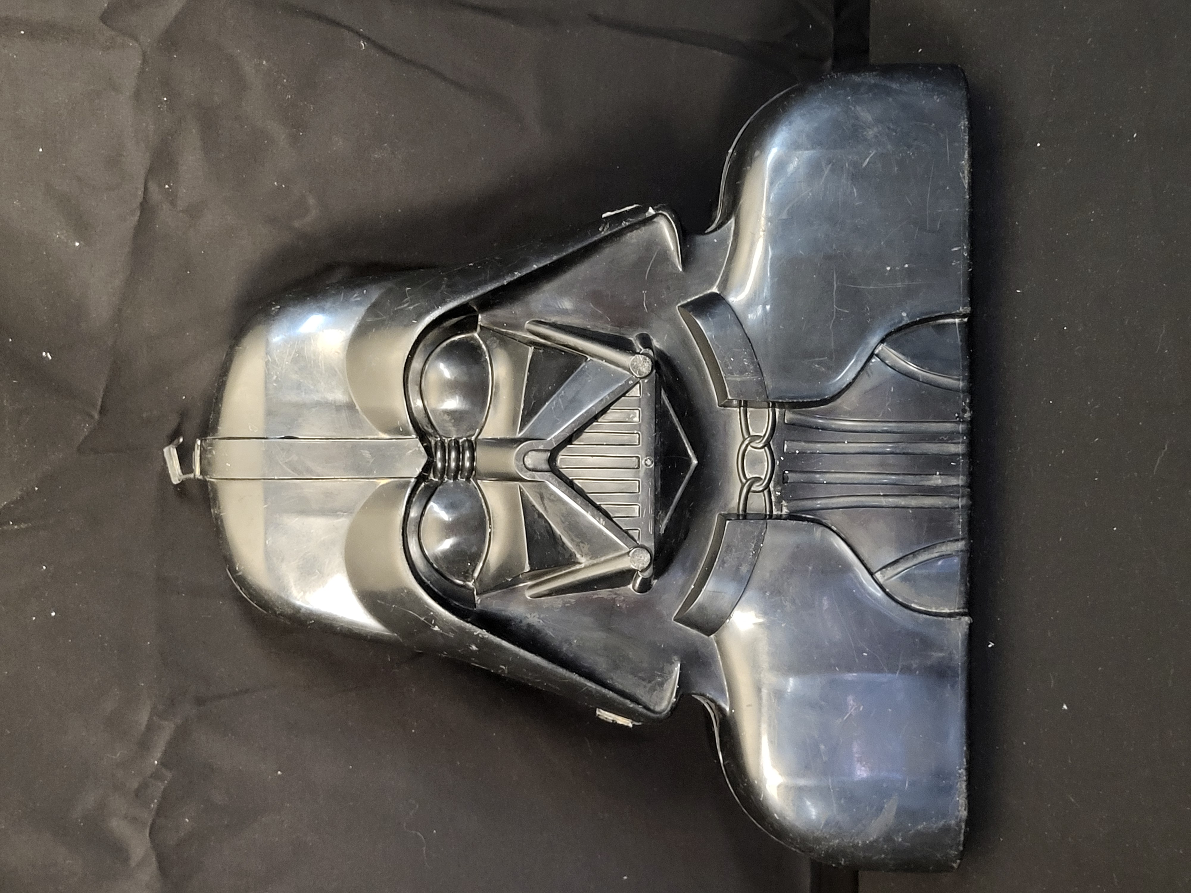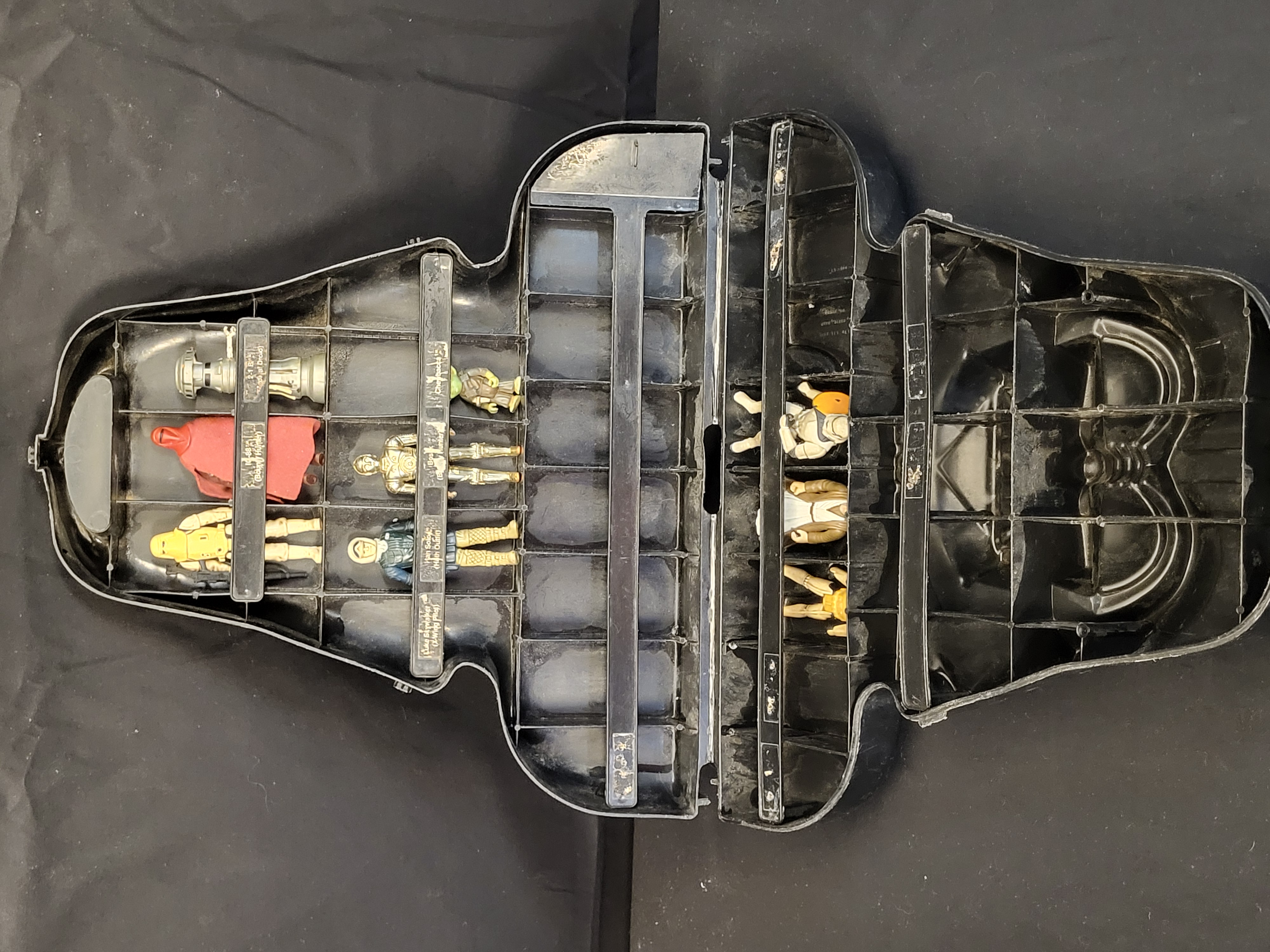 BID PER WHAT YOU SEE IN THE PHOTO, NOT THE AI GENERATED TITLES AND DESCRIPTIONS! This lot features a vintage Kenner Darth Vader action figure carrying case accompanied by an assortment of Star Wars action figures. The case is manufactured from molded black plastic in the shape of Darth Vader’s bust and features a hinged opening mechanism with an integrated handle and a plastic latch. The interior is organized into segmented compartments designed for figure storage. Several original paper identification labels remain adhered to the internal shelving, including text for Han Solo (Hoth Outfit), Bossk (Bounty Hunter), Chewbacca, IG-88 (Bounty Hunter), and 2-1B (Medical Droid). The included action figures represent various characters from the franchise, including C-3PO, Yoda, Han Solo in Hoth gear, an Imperial Royal Guard with a red fabric cape, a Snowtrooper, and Obi-Wan Kenobi. The interior plastic is marked with Lucasfilm Ltd. copyright information.
