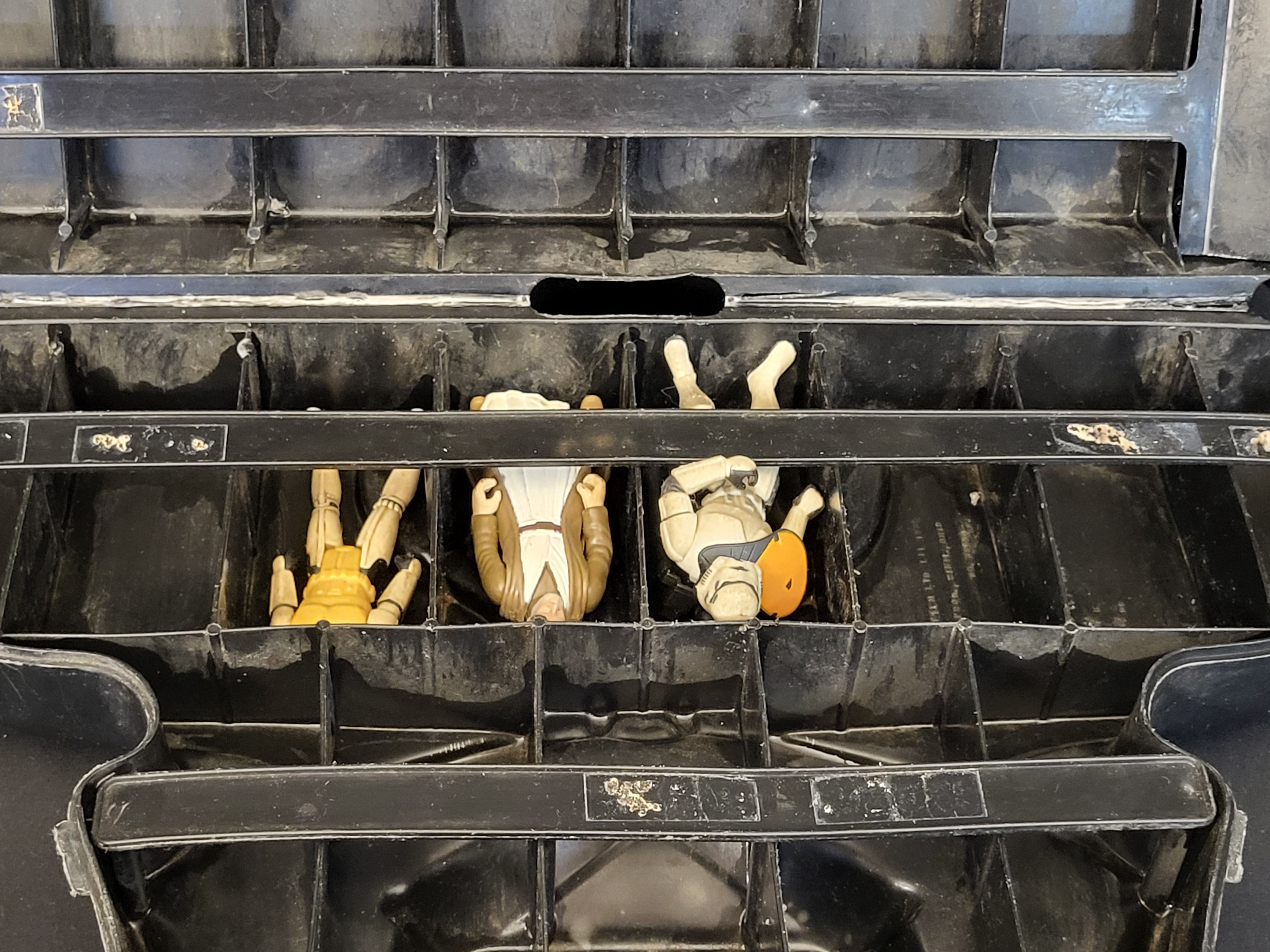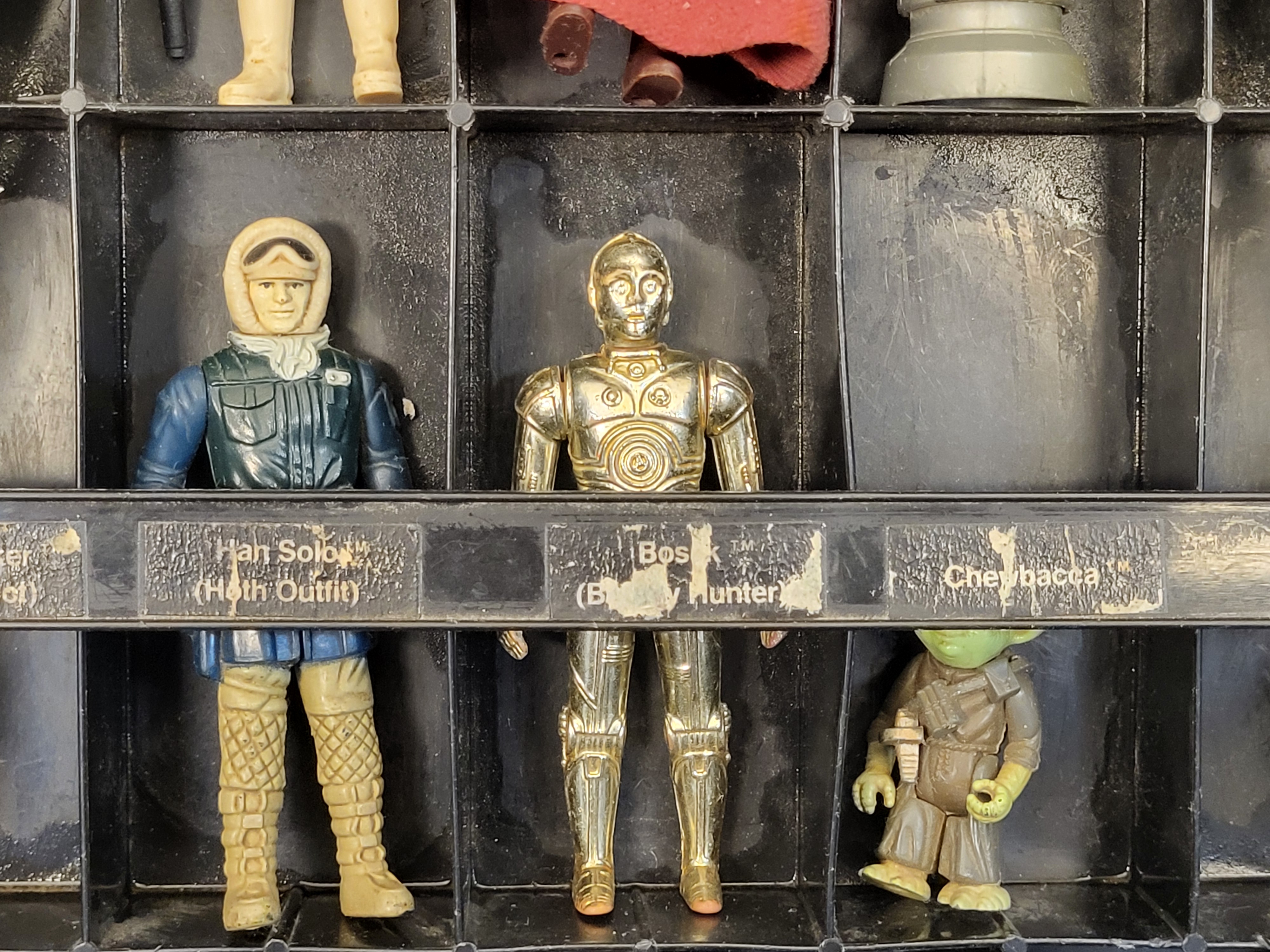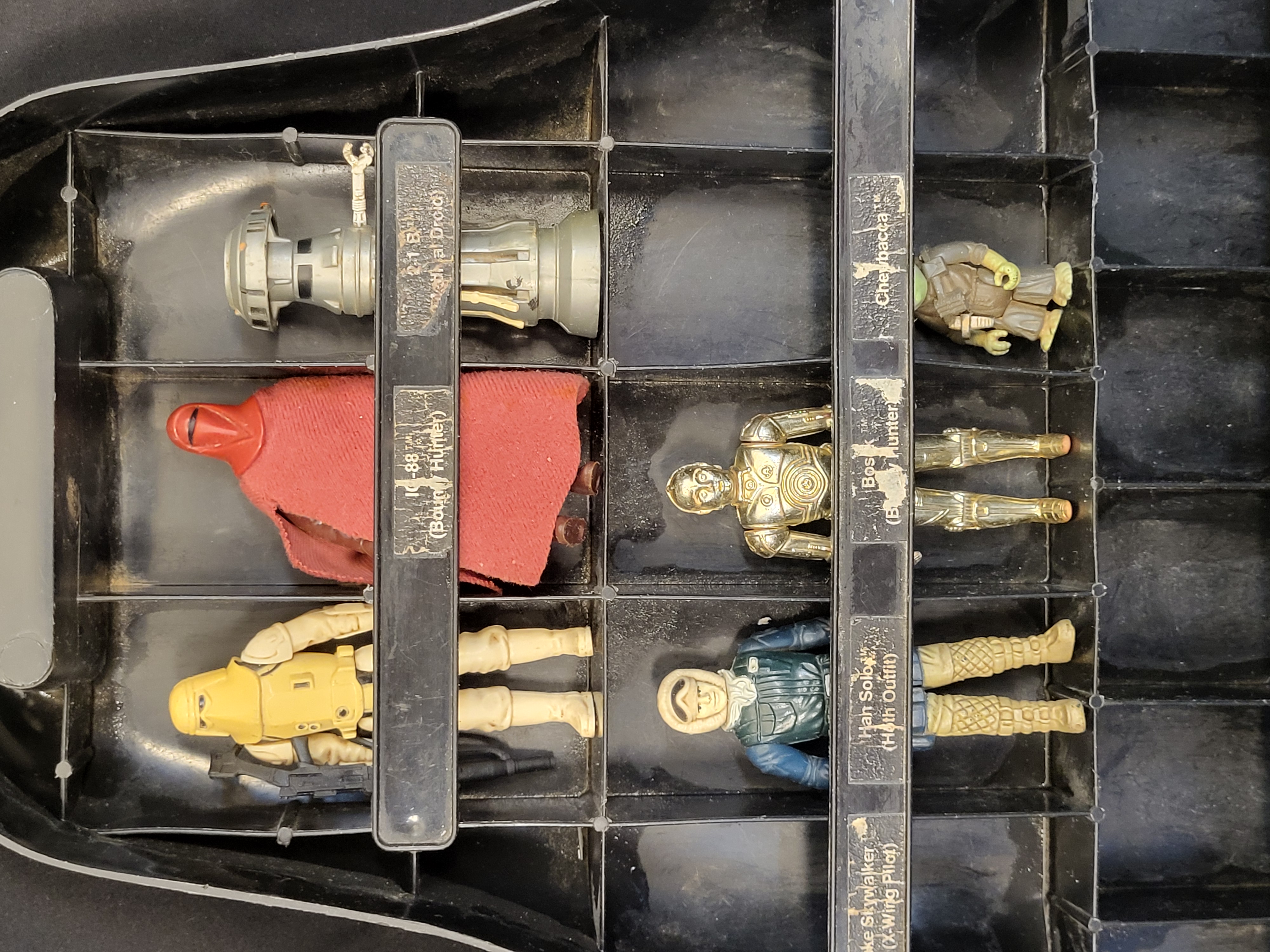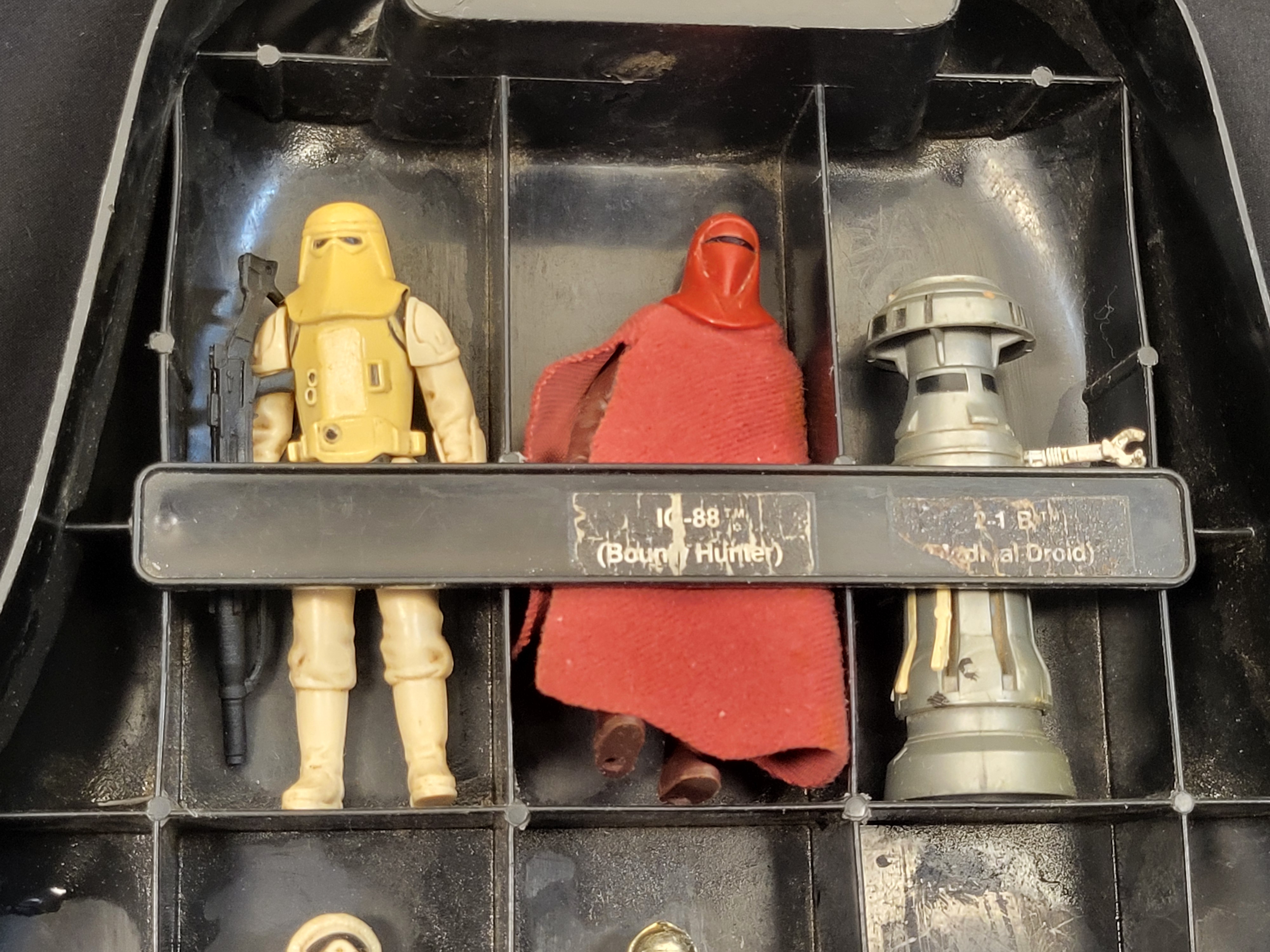 The case is in used condition, showing significant surface scratching, scuffing, and general wear to the exterior plastic consistent with age and use. The interior paper labels exhibit peeling, adhesive failure, and some paper loss. The action figures show typical signs of play wear, including minor paint loss, surface soiling, and varying degrees of joint flexibility. The fabric cape on the Imperial Royal Guard shows minor fraying.