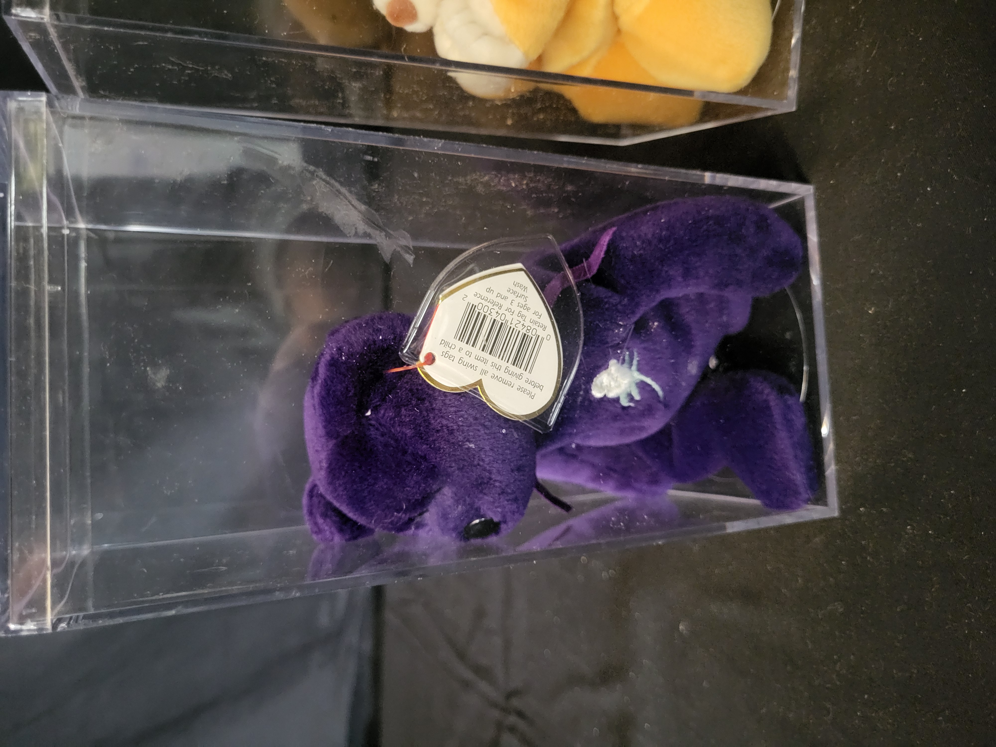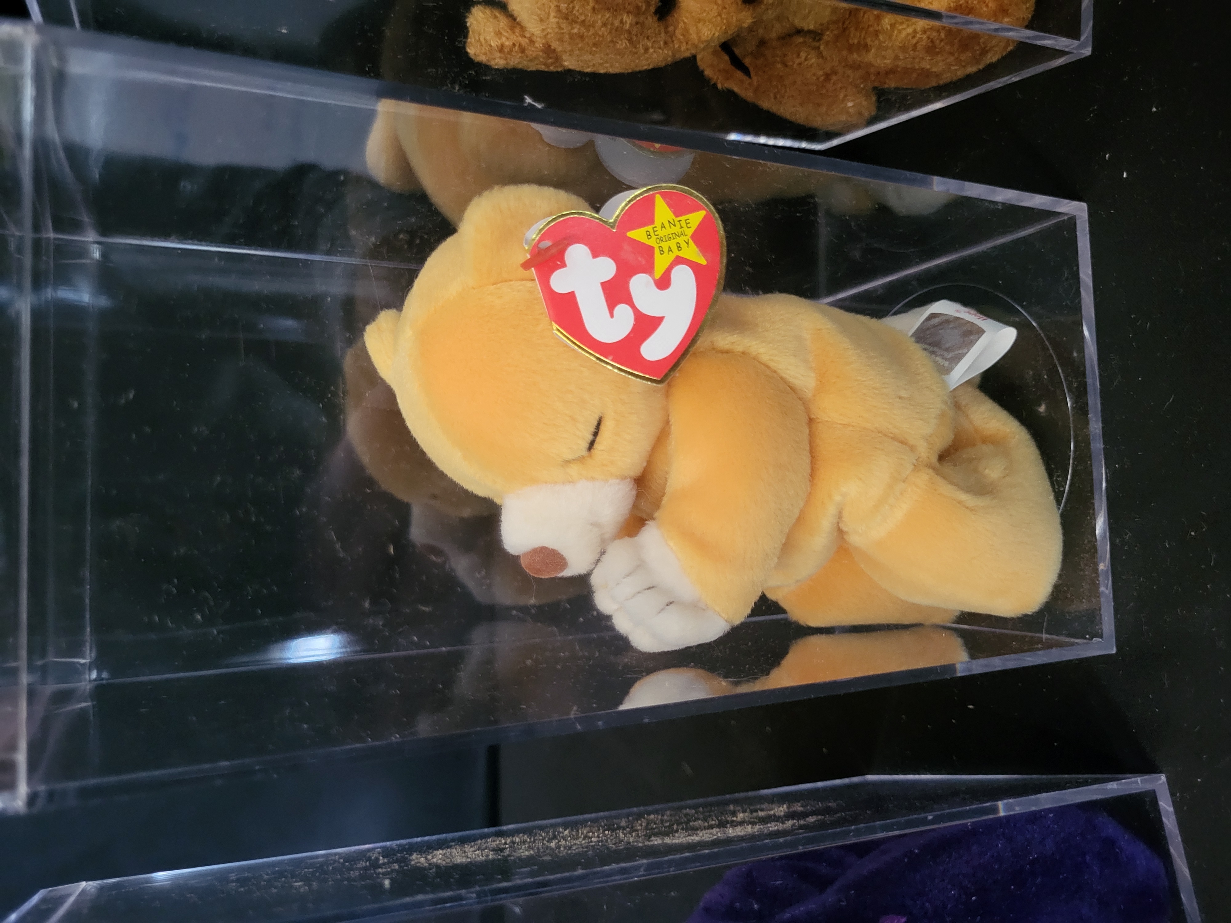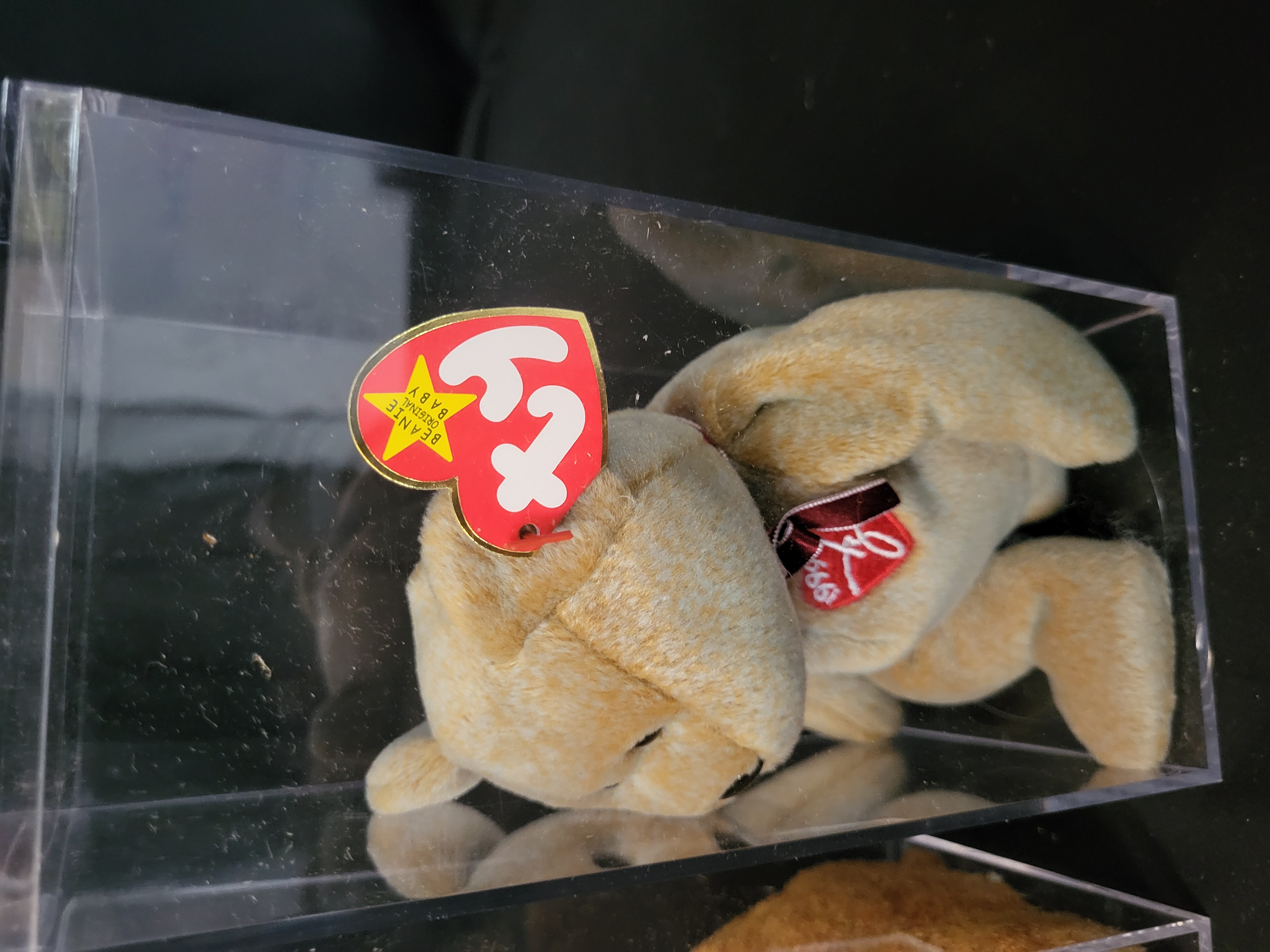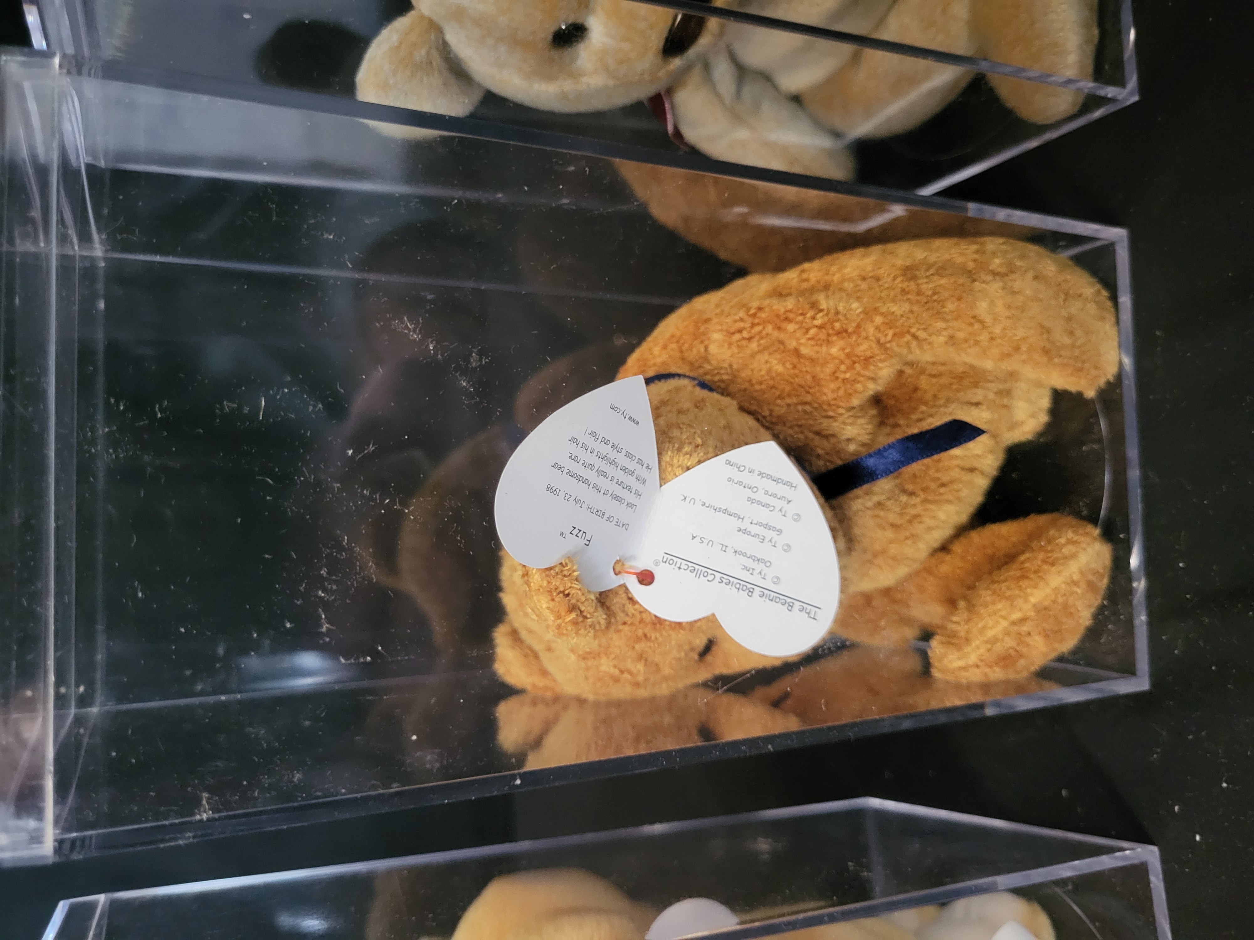 BID PER WHAT YOU SEE IN THE PHOTO, NOT THE AI GENERATED TITLES AND DESCRIPTIONS! A collection of Ty Beanie Baby plush bears, each housed within an individual clear acrylic display case. The group includes the 1998 Hope the Praying Bear, the purple Princess bear featuring an embroidered white rose, the textured brown Fuzz bear with a blue ribbon, and the tan 1999 Signature bear. Each plush toy retains its original heart-shaped Ty swing tag. The items are constructed from synthetic plush fabrics with plastic components.