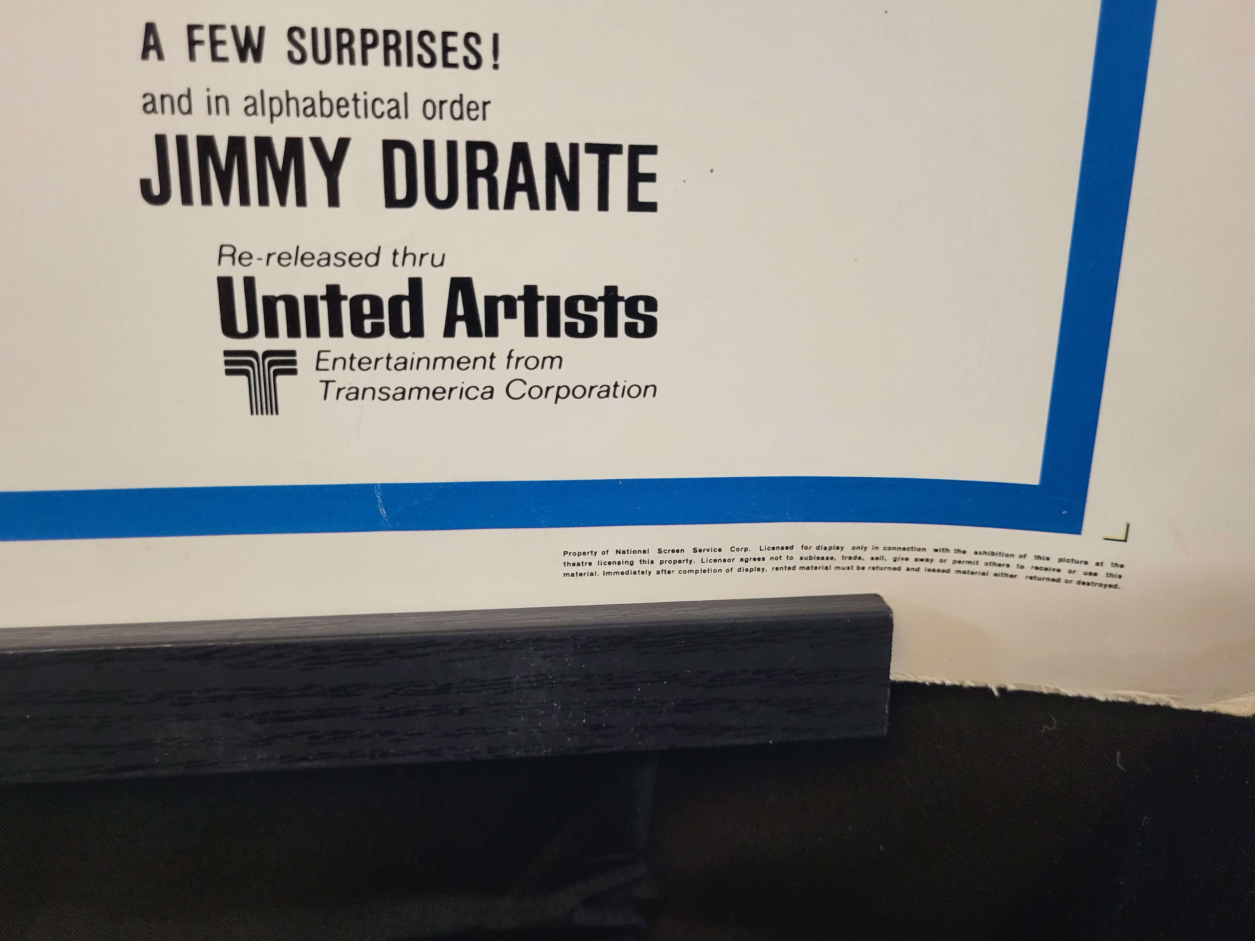The poster shows visible creasing in the lower-left corner and edge wear with small nicks. Minor pinholes are present at the top edge from previous display.
