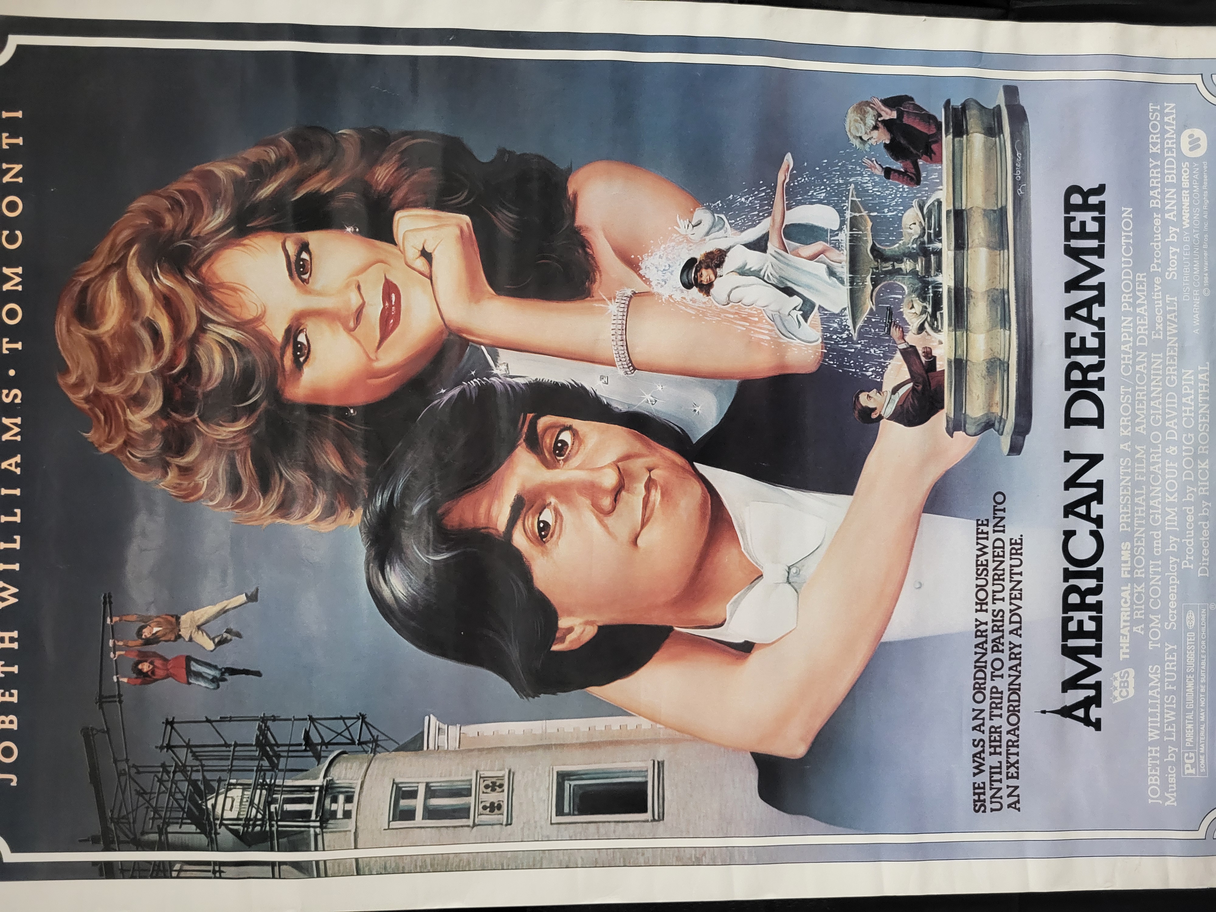 BID PER WHAT YOU SEE IN THE PHOTO, NOT THE AI GENERATED TITLES AND DESCRIPTIONS! An original one-sheet movie poster for the 1984 motion picture American Dreamer, starring JoBeth Williams and Tom Conti. The poster features a color illustrated montage depicting the lead actors in the foreground with various scenes from the film, including a Parisian architectural background and a fountain sequence. The printed text includes the film title, tagline, and full production credits for CBS Theatrical Films and Warner Bros. The lower-right corner displays the National Screen Service number 840115 and a 1984 copyright attribution to Warner Bros. Inc.