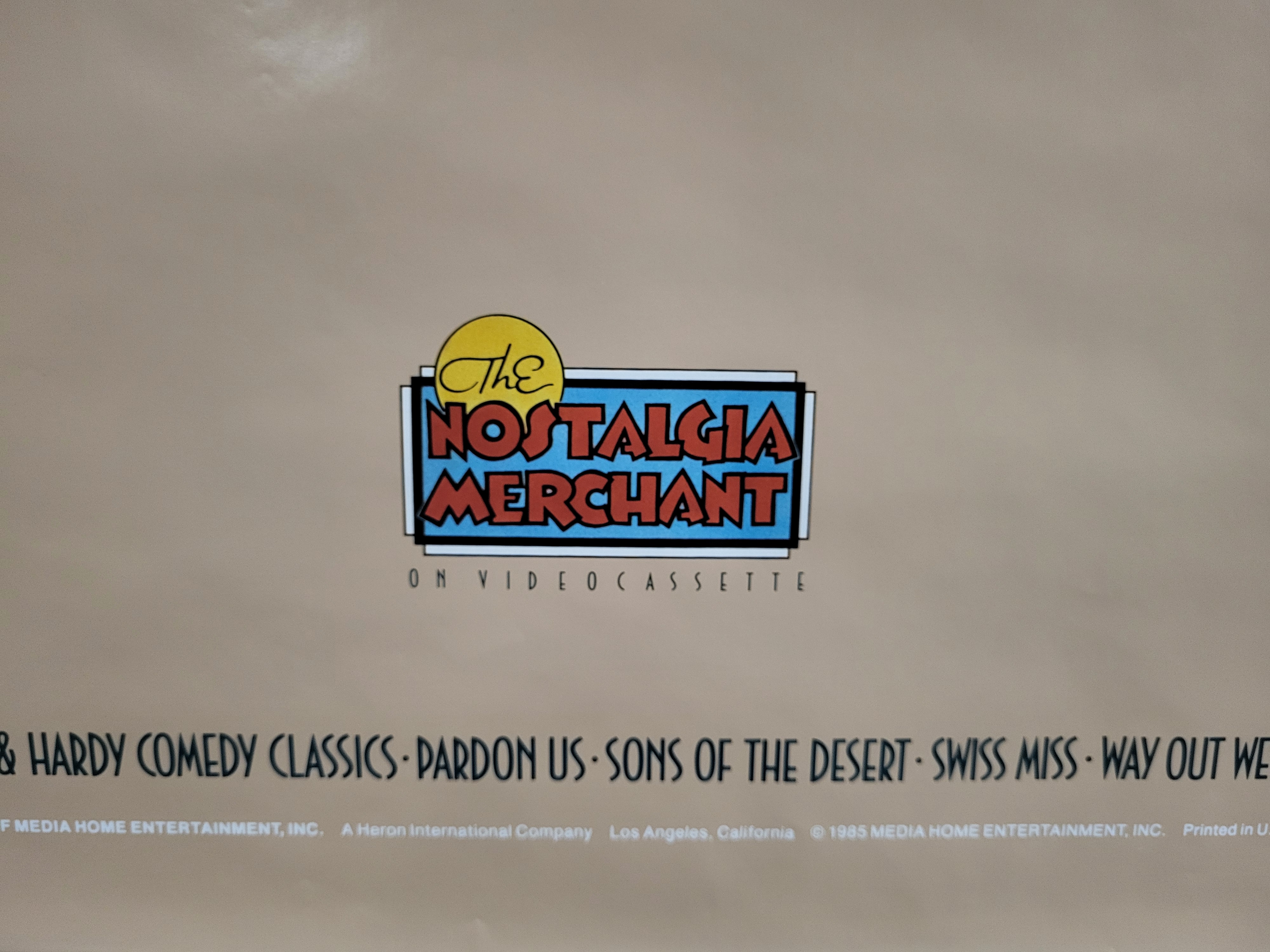 BID PER WHAT YOU SEE IN THE PHOTO, NOT THE AI GENERATED TITLES AND DESCRIPTIONS! This promotional wall scroll poster, dated 1985, features a caricature illustration of Stan Laurel and Oliver Hardy by the artist Nelson. Produced for The Nostalgia Merchant to advertise Laurel and Hardy comedy classics on videocassette, the poster lists the films Pardon Us, Sons of the Desert, Swiss Miss, and Way Out West. The central artwork, signed NELSON 85, depicts the duo against a tan background. The item is constructed as a horizontal scroll with black support bars at each end. Printing and copyright information at the bottom attributes the piece to Media Home Entertainment, Inc., a Heron International Company, based in Los Angeles, California.