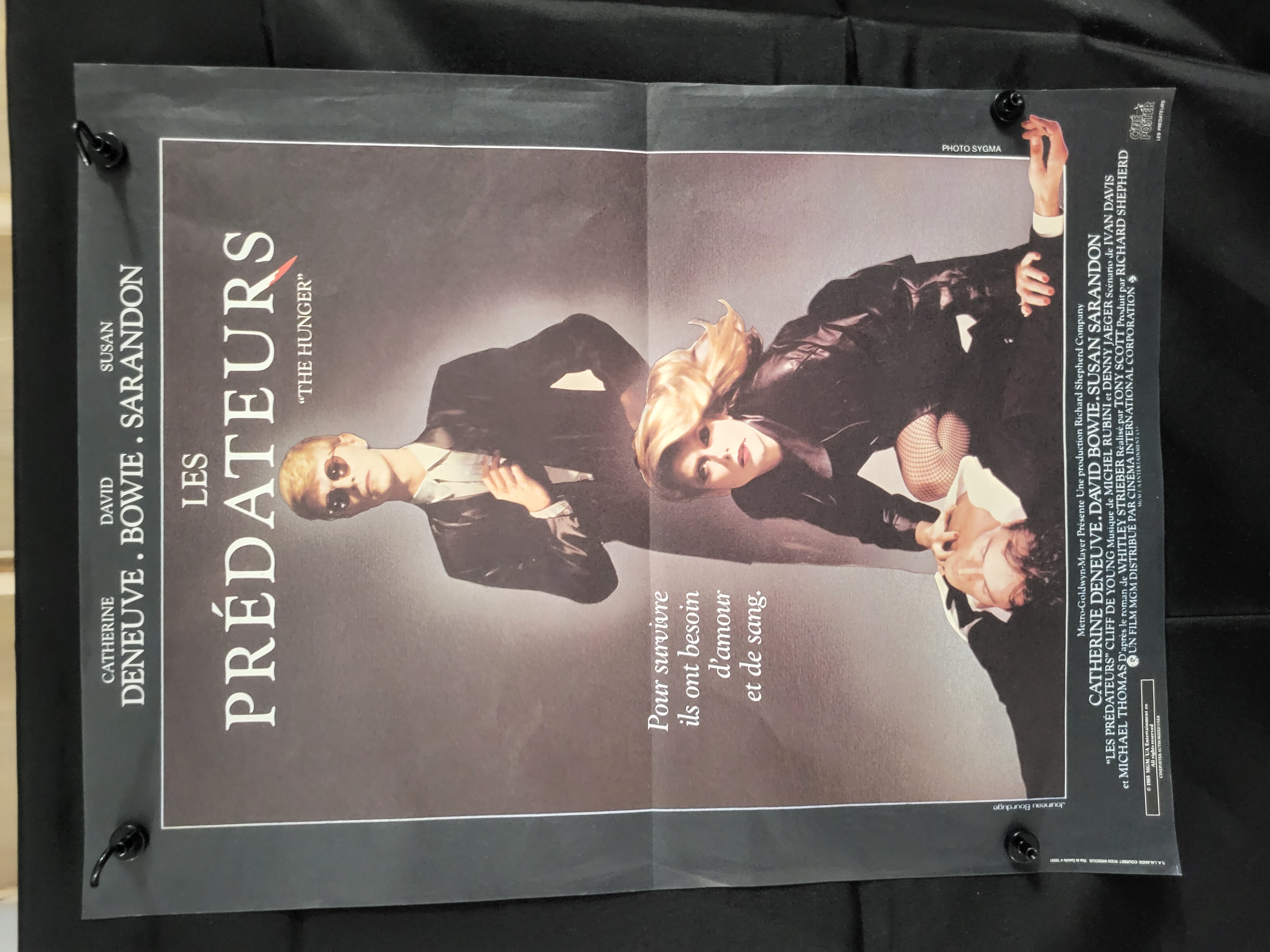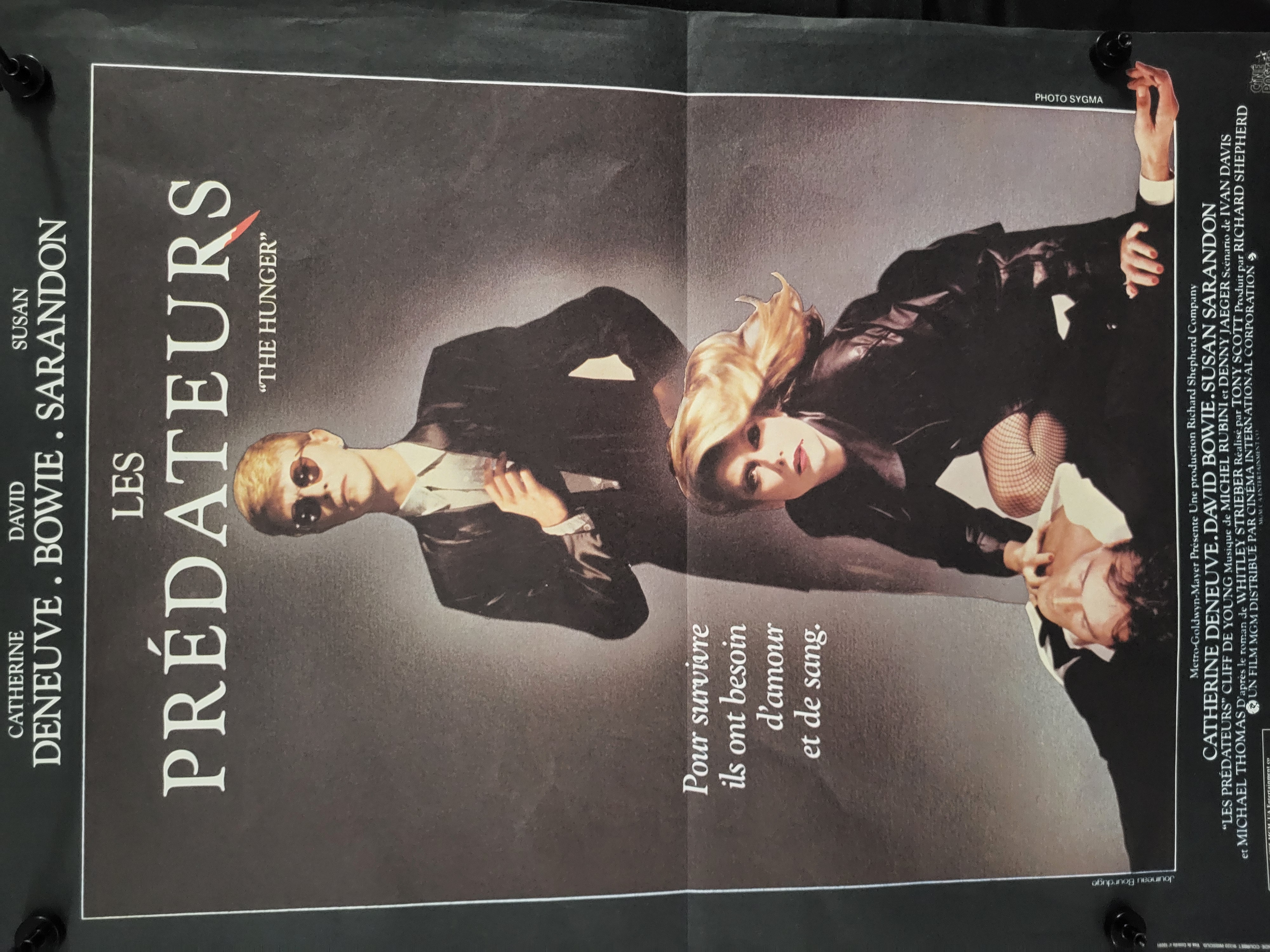 BID PER WHAT YOU SEE IN THE PHOTO, NOT THE AI GENERATED TITLES AND DESCRIPTIONS! A French theatrical movie poster for the film The Hunger, titled Les Prédateurs, featuring a central photographic composition of stars David Bowie and Catherine Deneuve. Printed on paper, the poster displays the primary cast names Catherine Deneuve, David Bowie, and Susan Sarandon along the left side. A French tagline translates to To survive they need love and blood. The bottom right corner contains production credits for Metro-Goldwyn-Mayer and United Artists, including the copyright marking © 1985 MGM/UA Entertainment Co and CINEPOSTER AUTHORIZED USER. Additional markings include PHOTO SYGMA and the artist credit Jouineau Bourduge.