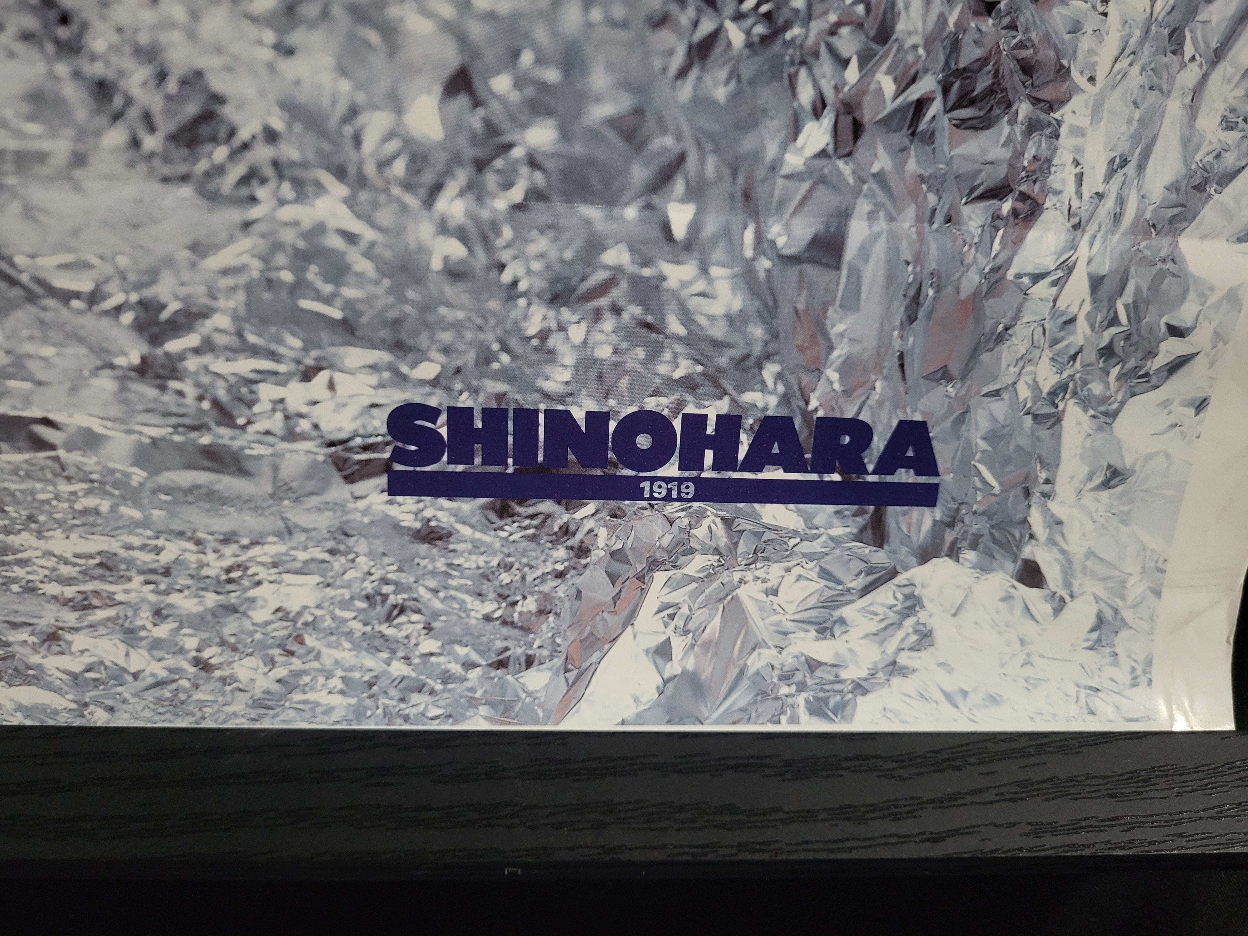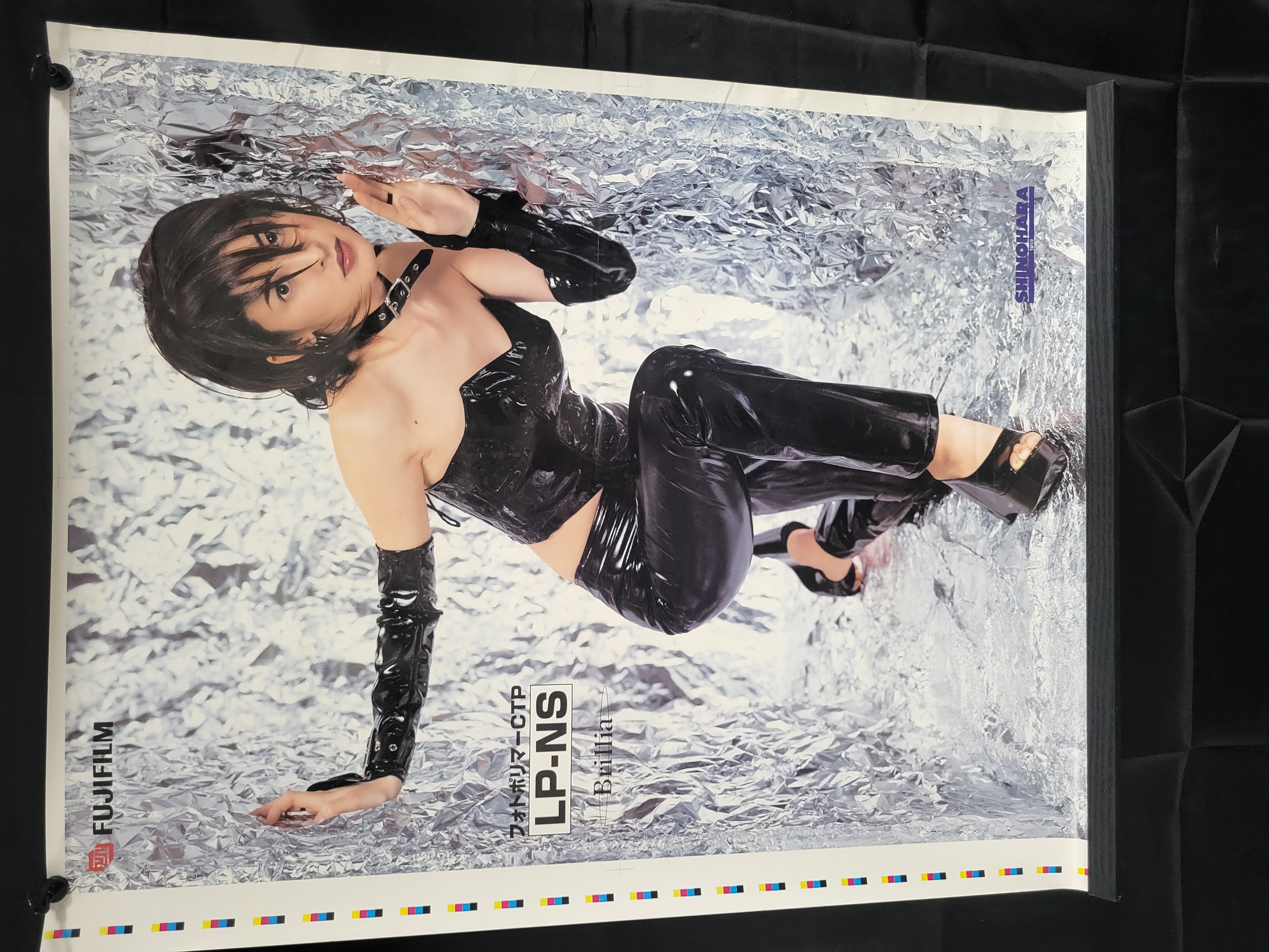 BID PER WHAT YOU SEE IN THE PHOTO, NOT THE AI GENERATED TITLES AND DESCRIPTIONS! This large-format commercial advertising poster was produced for Fujifilm and Shinohara 1919 to promote printing plate technology. The photographic image features a model wearing black patent-style attire, including a bustier, trousers, and long gloves, positioned against a highly reflective, crumpled metallic background. The poster includes printed text for the Fujifilm logo, the Shinohara 1919 brand, and technical product designations including Photopolymer CTP in Japanese characters, LP-NS, and Brillia. A standard printer color calibration bar is located along the bottom edge of the sheet.