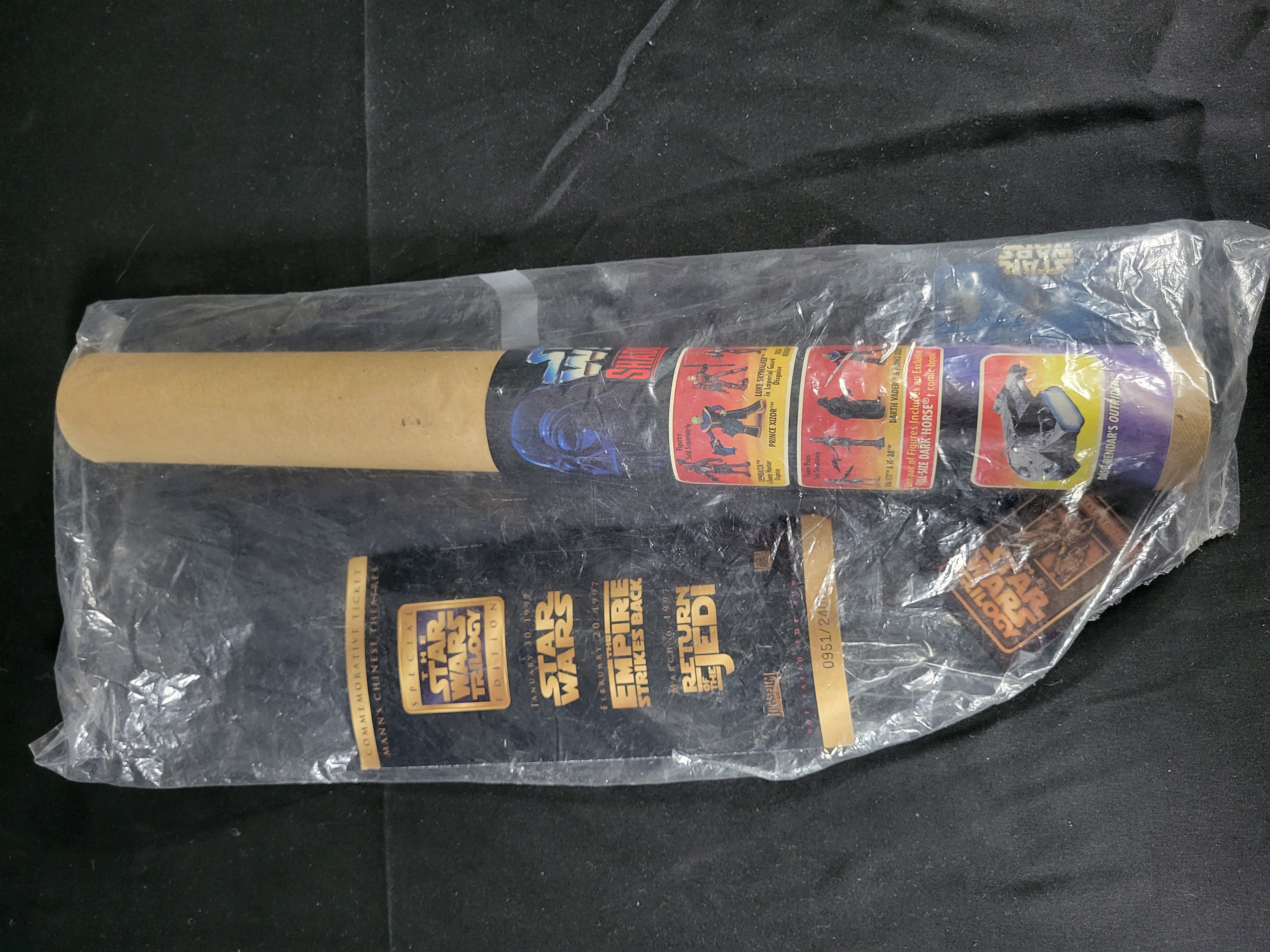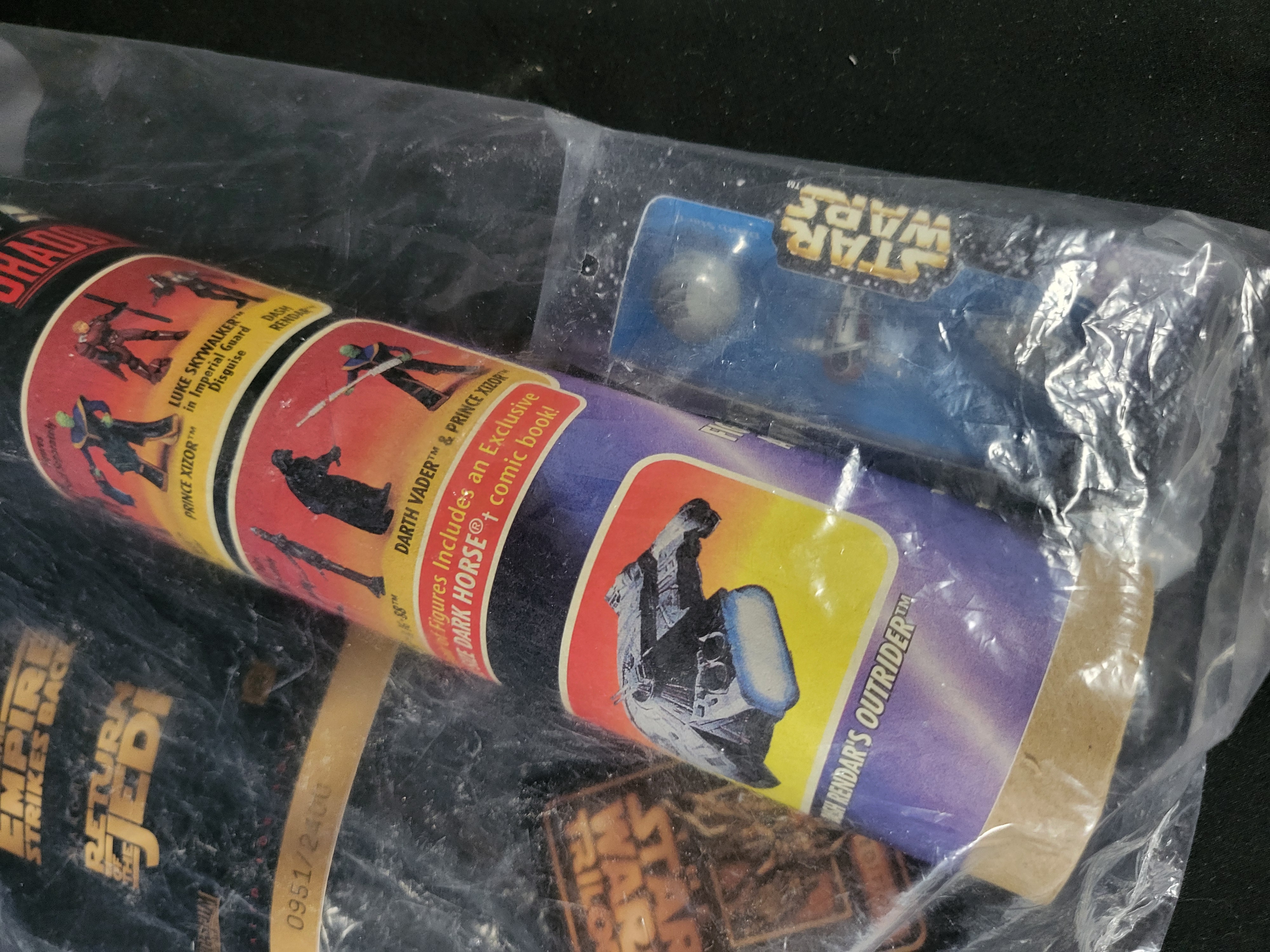 BID PER WHAT YOU SEE IN THE PHOTO, NOT THE AI GENERATED TITLES AND DESCRIPTIONS! A group of Star Wars promotional memorabilia produced for the 1997 Special Edition theatrical releases. The lot includes a cardboard mailing tube with a Shadows of the Empire graphic wrap featuring character and vehicle illustrations including Luke Skywalker, Prince Xizor, and Dash Rendar’s Outrider. Included is a commemorative ticket for Mann’s Chinese Theatre, numbered 0951/2400, which displays the 1997 release dates for the Star Wars Trilogy. The collection also contains a sealed Micro Machines vehicle by Galoob in a Limited Edition promotional package and a Star Wars Trilogy commemorative card. Branding for Lucasfilm Ltd., Kenner, and Dark Horse Comics is present across the items.