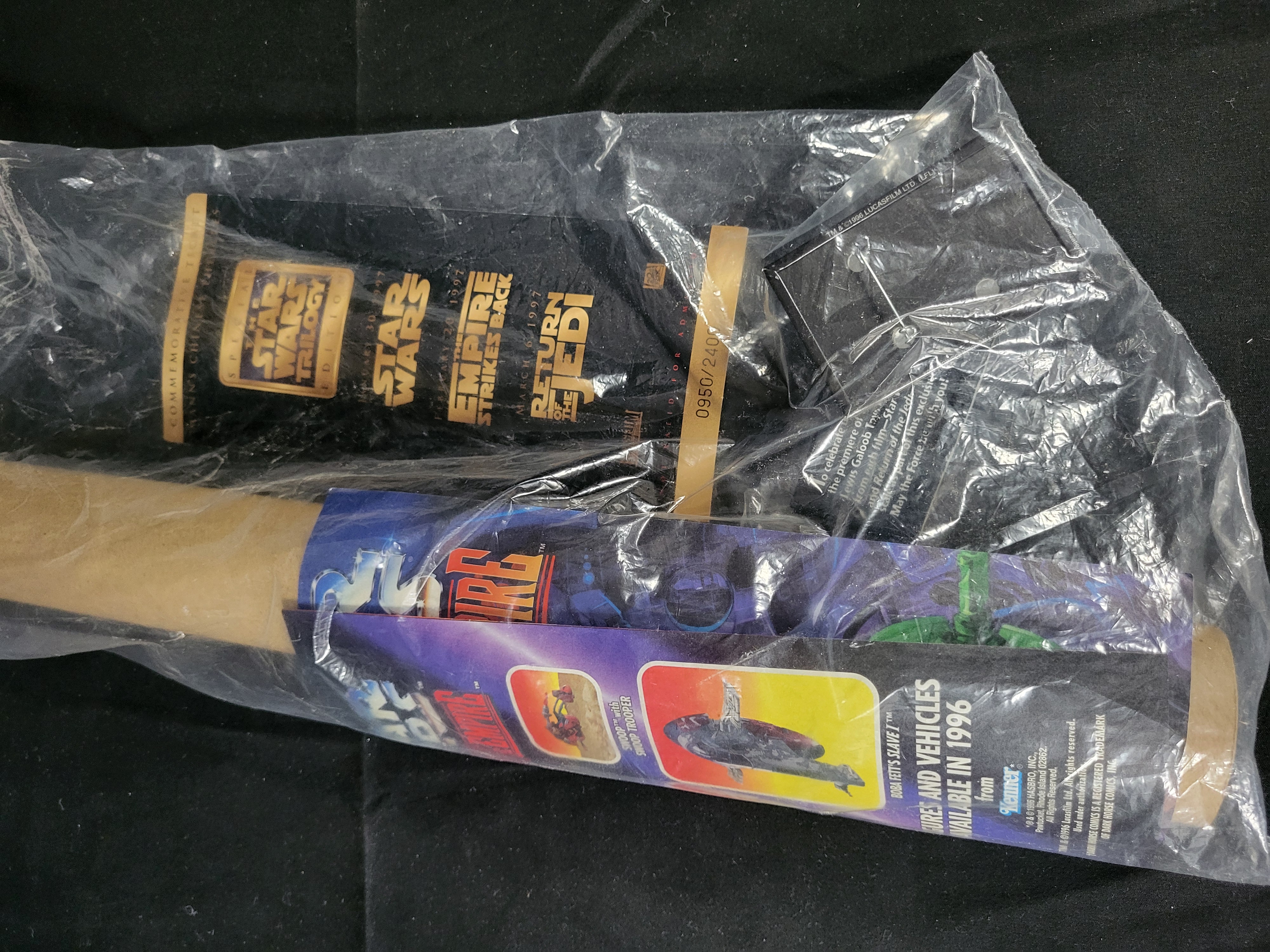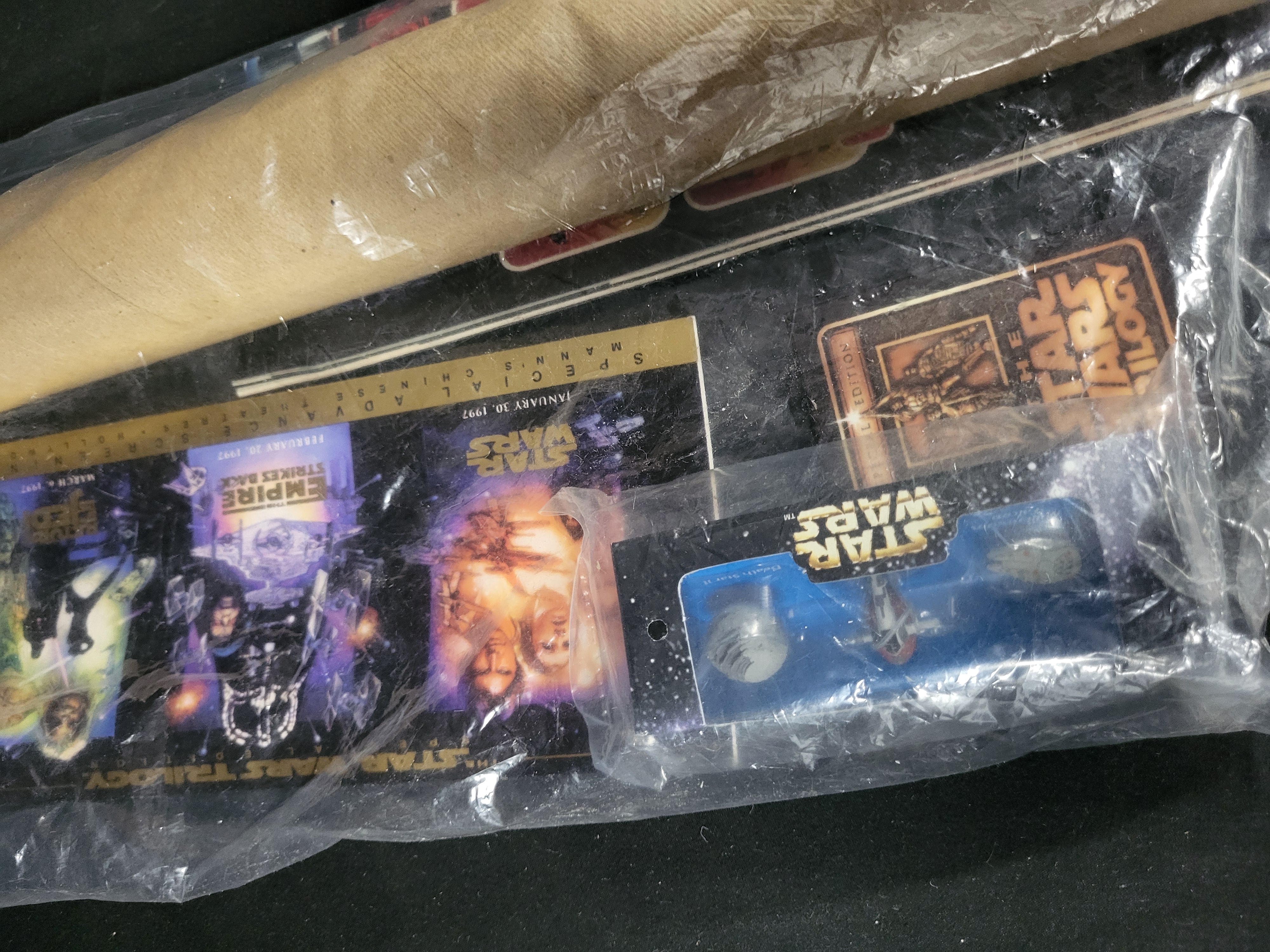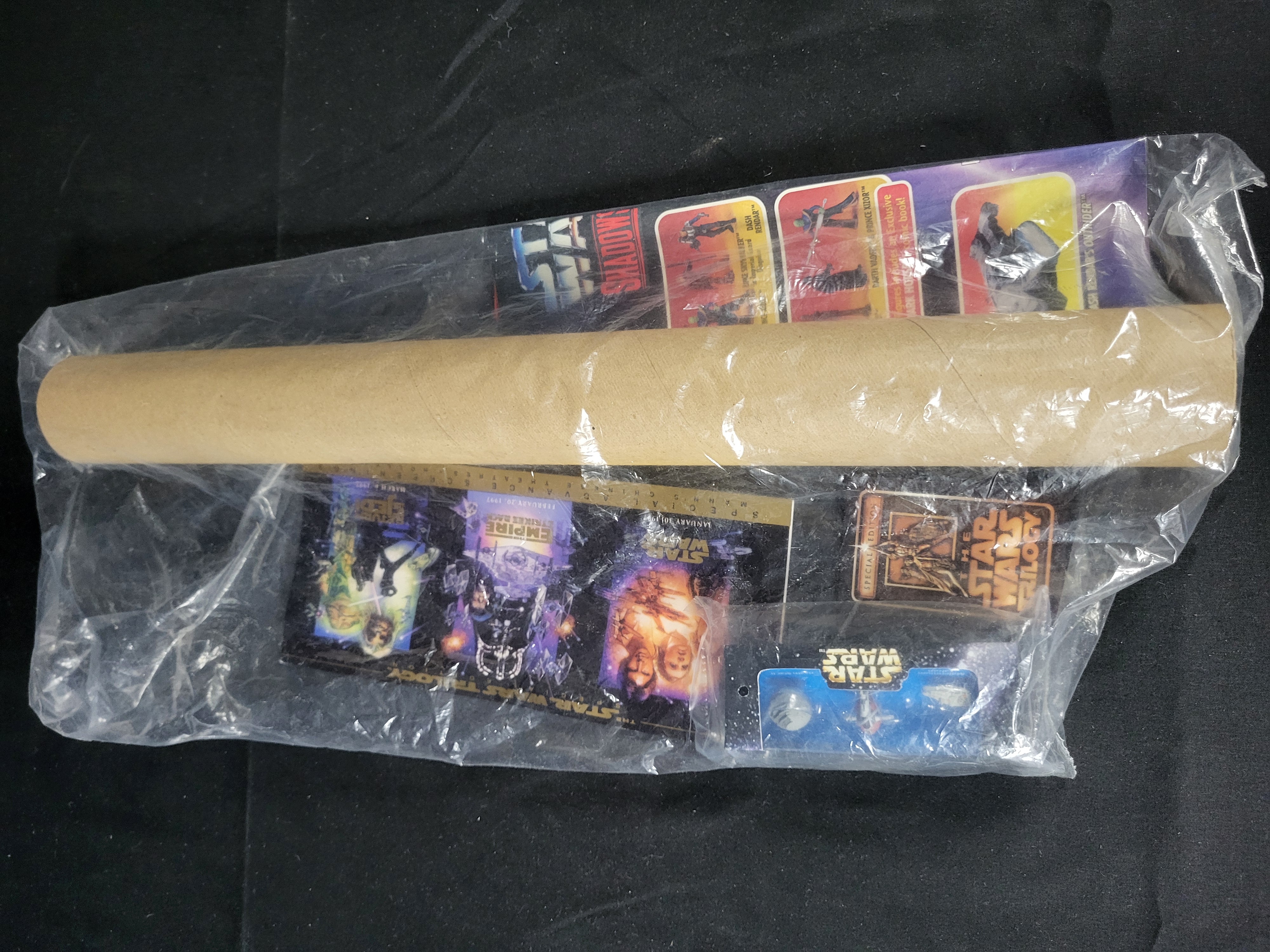 BID PER WHAT YOU SEE IN THE PHOTO, NOT THE AI GENERATED TITLES AND DESCRIPTIONS! A collection of Star Wars promotional items and memorabilia primarily dating from 1996 and 1997, coinciding with the Star Wars Trilogy Special Edition theatrical releases and the Shadows of the Empire multimedia campaign. The group includes a limited edition commemorative ticket for the Special Edition at Mann’s Chinese Theatre, numbered 0950/2400. Also included is a packaged Galoob Micro Machines set featuring the Death Star II and other vehicles. The lot contains various printed promotional materials from Kenner and Galoob, including a large cardboard storage tube and inserts showcasing figures and vehicles from the Shadows of the Empire line. Items are composed of printed cardstock, paper, and molded plastic.