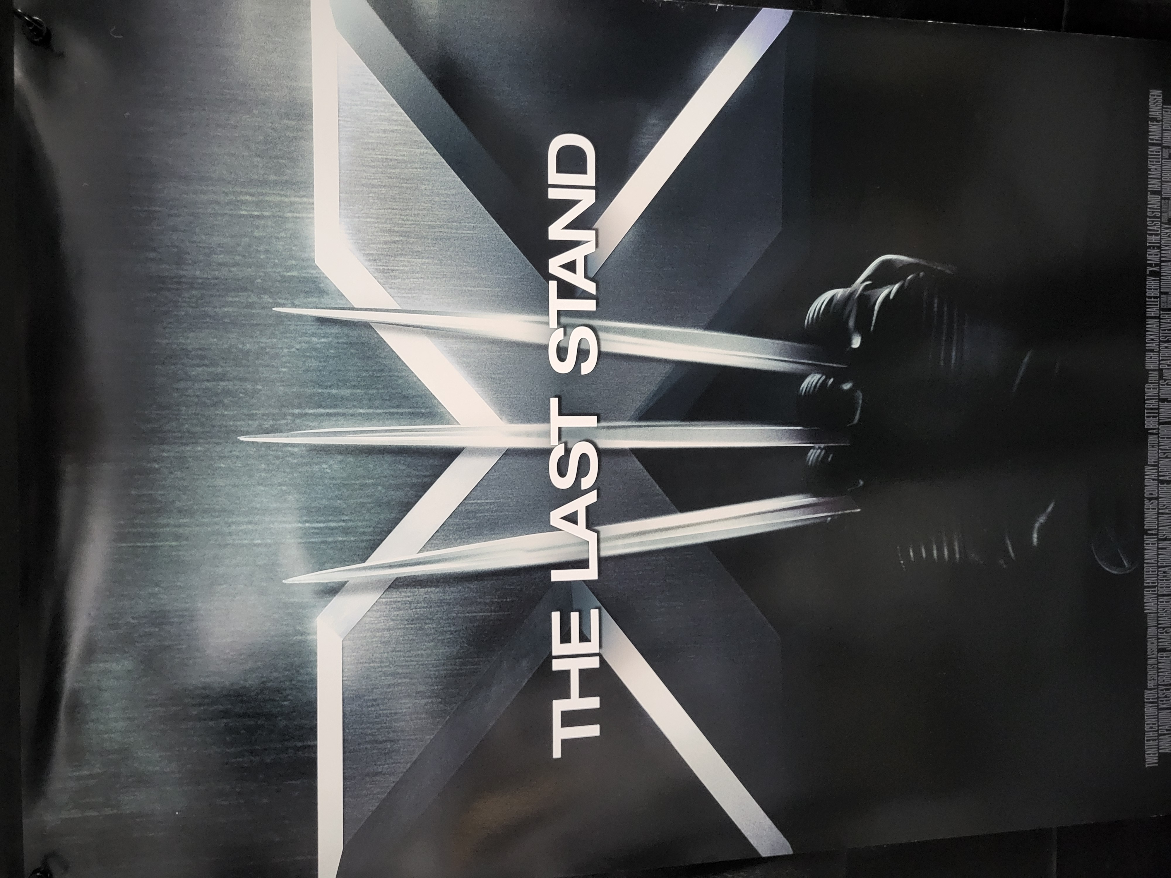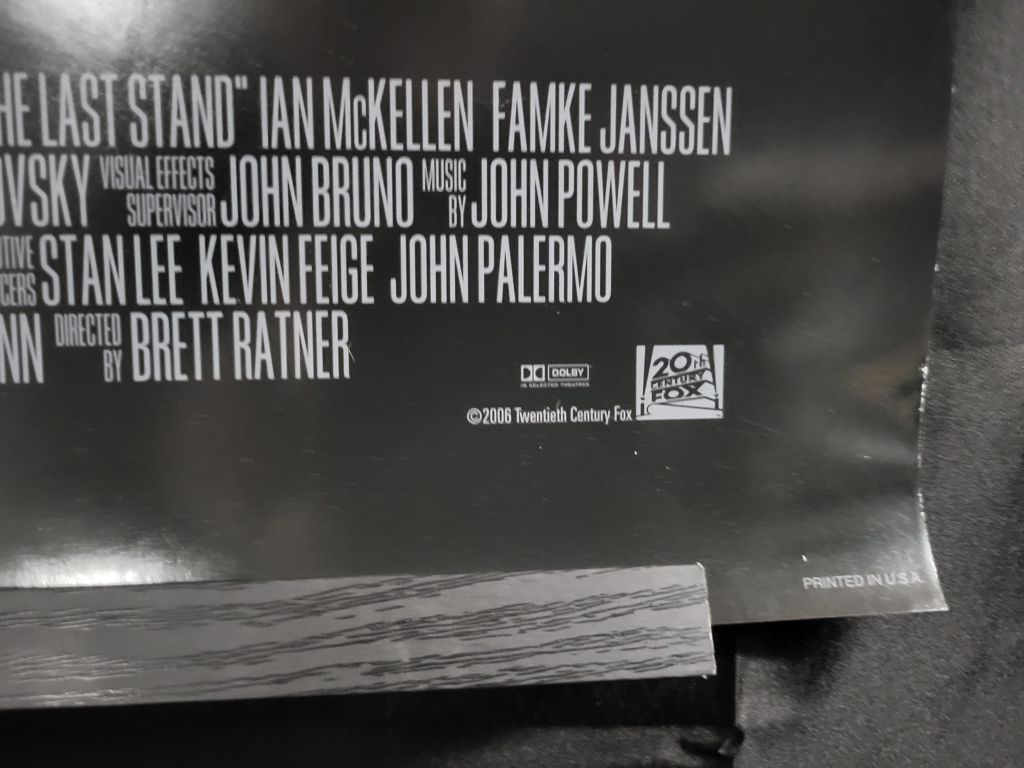 BID PER WHAT YOU SEE IN THE PHOTO, NOT THE AI GENERATED TITLES AND DESCRIPTIONS! This original one sheet movie poster for the 2006 motion picture X-Men: The Last Stand features a graphic design depicting Wolverine’s claws over a metallic stylized X background. The film title is printed vertically in white lettering. The lower margin contains a standard billing block with credits for Ian McKellen, Famke Janssen, and director Brett Ratner, alongside the 20th Century Fox and Marvel logos. The lower right corner is marked with a copyright for 2006 Twentieth Century Fox and the text PRINTED IN U.S.A.