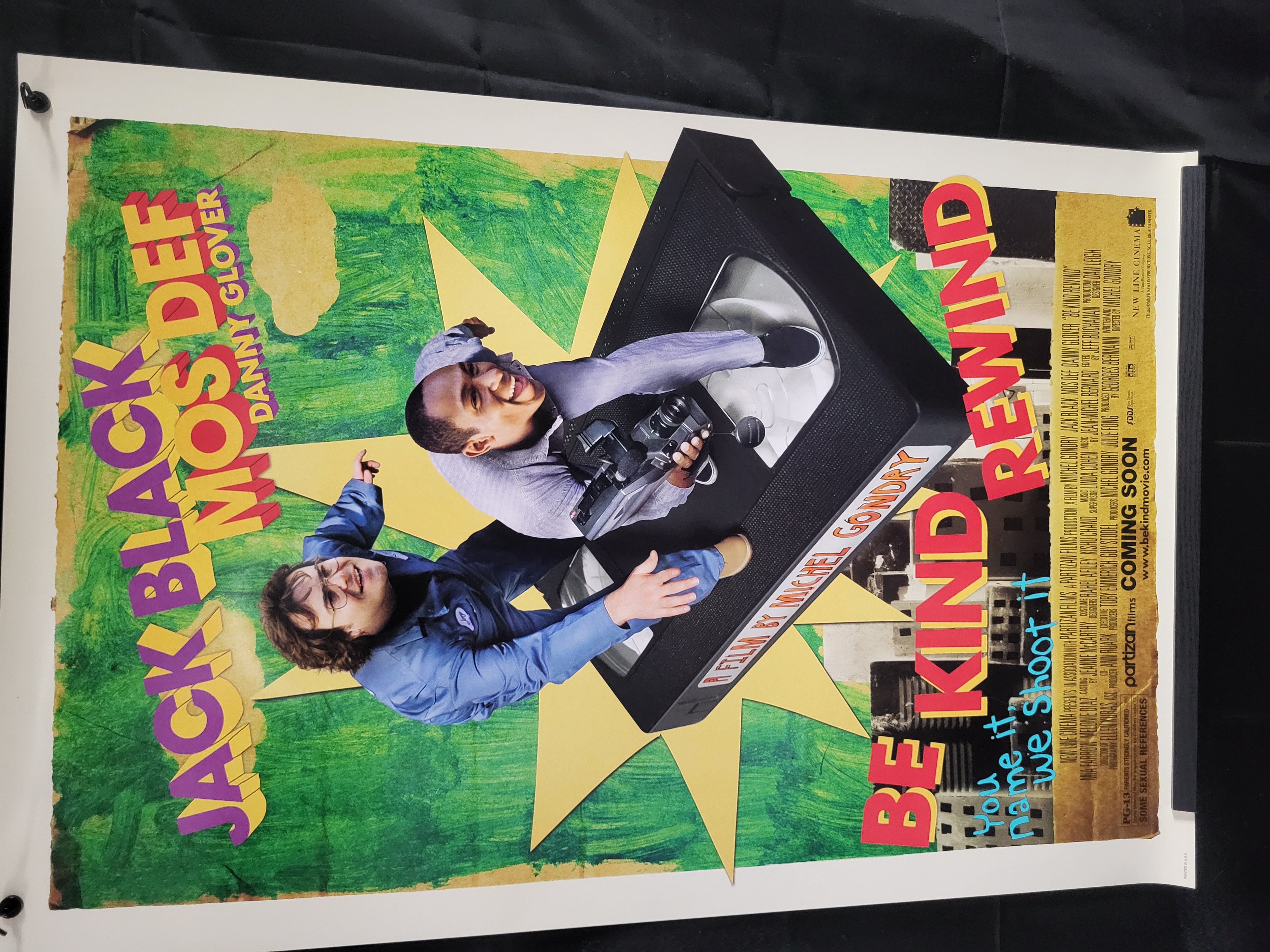 BID PER WHAT YOU SEE IN THE PHOTO, NOT THE AI GENERATED TITLES AND DESCRIPTIONS! An original promotional teaser poster for the 2008 motion picture Be Kind Rewind, directed by Michel Gondry. The poster features a collage-style design on paper, reflecting the film’s DIY aesthetic. Lead actors Jack Black and Mos Def are depicted emerging from a stylized television set against a background of green brushstrokes and a yellow starburst. The poster displays the film title in bold lettering, the tagline You name it, we shoot it, and cast billing for Jack Black, Mos Def, and Danny Glover. Detailed production credits for New Line Cinema and Partizan Films, a PG-13 rating, and Coming Soon text are located in the lower right corner.