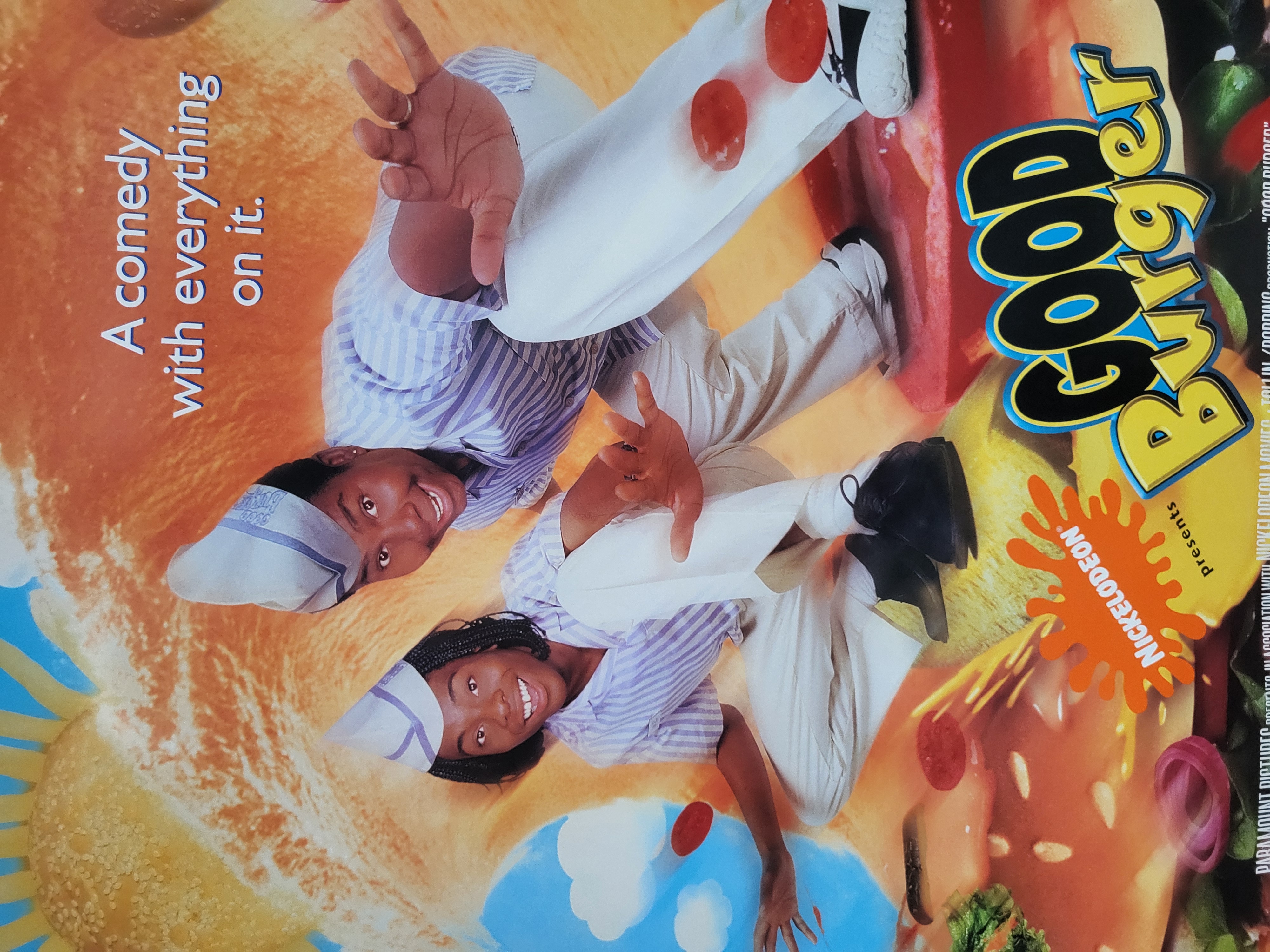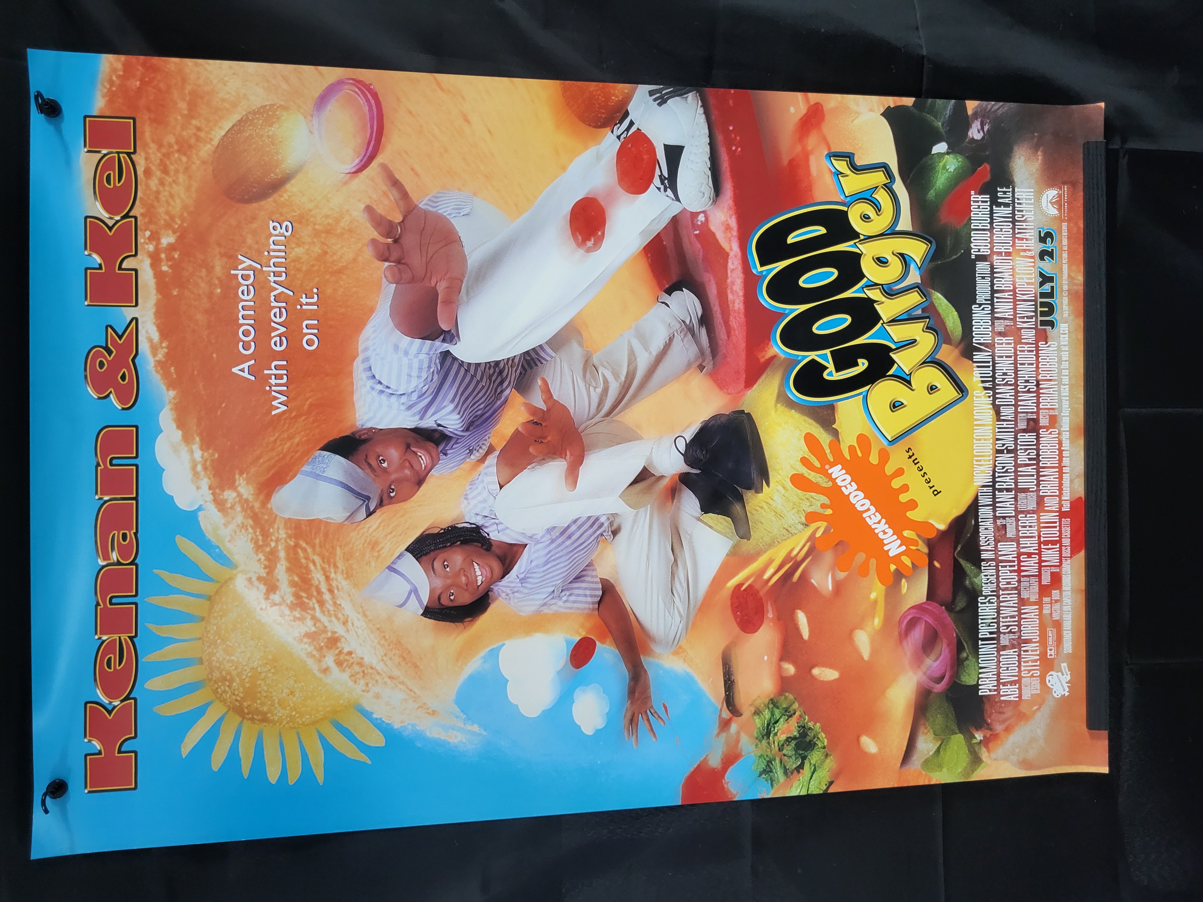 BID PER WHAT YOU SEE IN THE PHOTO, NOT THE AI GENERATED TITLES AND DESCRIPTIONS! This original promotional theatrical movie poster for the 1997 film Good Burger features stars Kenan Thompson and Kel Mitchell in their fast-food employee uniforms. The graphic design incorporates oversized burger ingredients including buns, tomatoes, and onions, alongside the film title in a stylized font and the tagline, A comedy with everything on it. The lower portion contains a standard billing block with production credits for Paramount Pictures, Nickelodeon Movies, and a Tollin/Robbins production, listing a release date of July 25. The poster is printed on paper and includes metal grommets in the upper corners for display purposes.