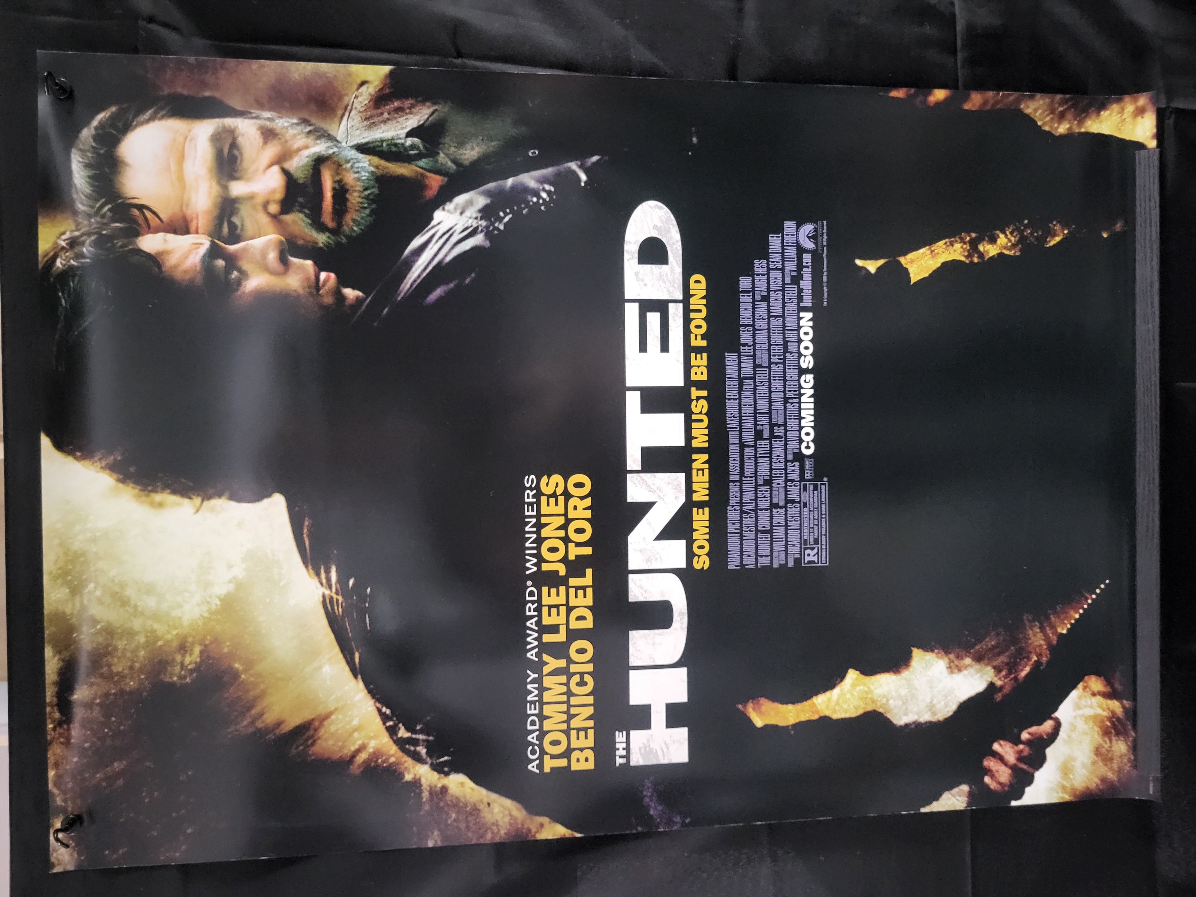 BID PER WHAT YOU SEE IN THE PHOTO, NOT THE AI GENERATED TITLES AND DESCRIPTIONS! A promotional movie poster for the 2003 action thriller The Hunted, produced by Paramount Pictures and Lakeshore Entertainment. The poster features a high-contrast design with a dark background and golden-hued imagery highlighting lead actors Tommy Lee Jones and Benicio Del Toro. The layout includes the film title, the tagline SOME MEN MUST BE FOUND, and a comprehensive billing block of production credits. A COMING SOON release notice is printed at the bottom alongside the studio logos. The item is printed on standard glossy poster paper.