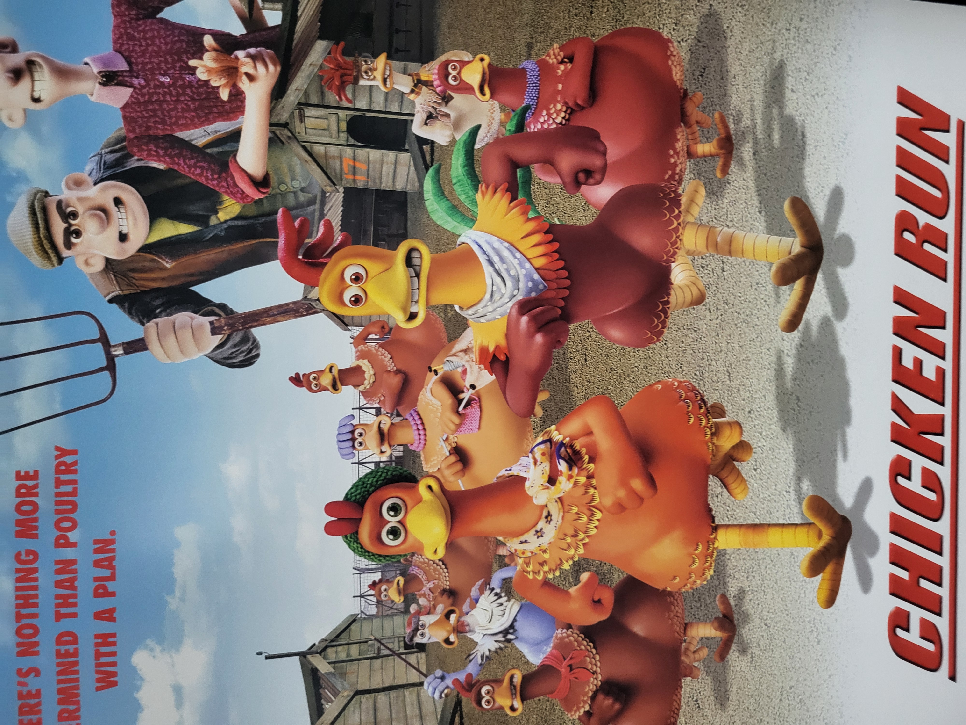 BID PER WHAT YOU SEE IN THE PHOTO, NOT THE AI GENERATED TITLES AND DESCRIPTIONS! An original theatrical movie poster for the 2000 stop-motion animated film Chicken Run, produced by Aardman Animations in association with Dreamworks Pictures and Pathe. The graphic depicts the film’s central claymation characters, including a group of chickens and human antagonists, set against a farm backdrop. The poster features the film title in large red block letters, the tagline There is nothing more determined than poultry with a plan, and the credit From the creators of Wallace and Gromit. A detailed production credits block is visible in the bottom right corner, citing producers such as Peter Lord, David Sproxton, and Nick Park.