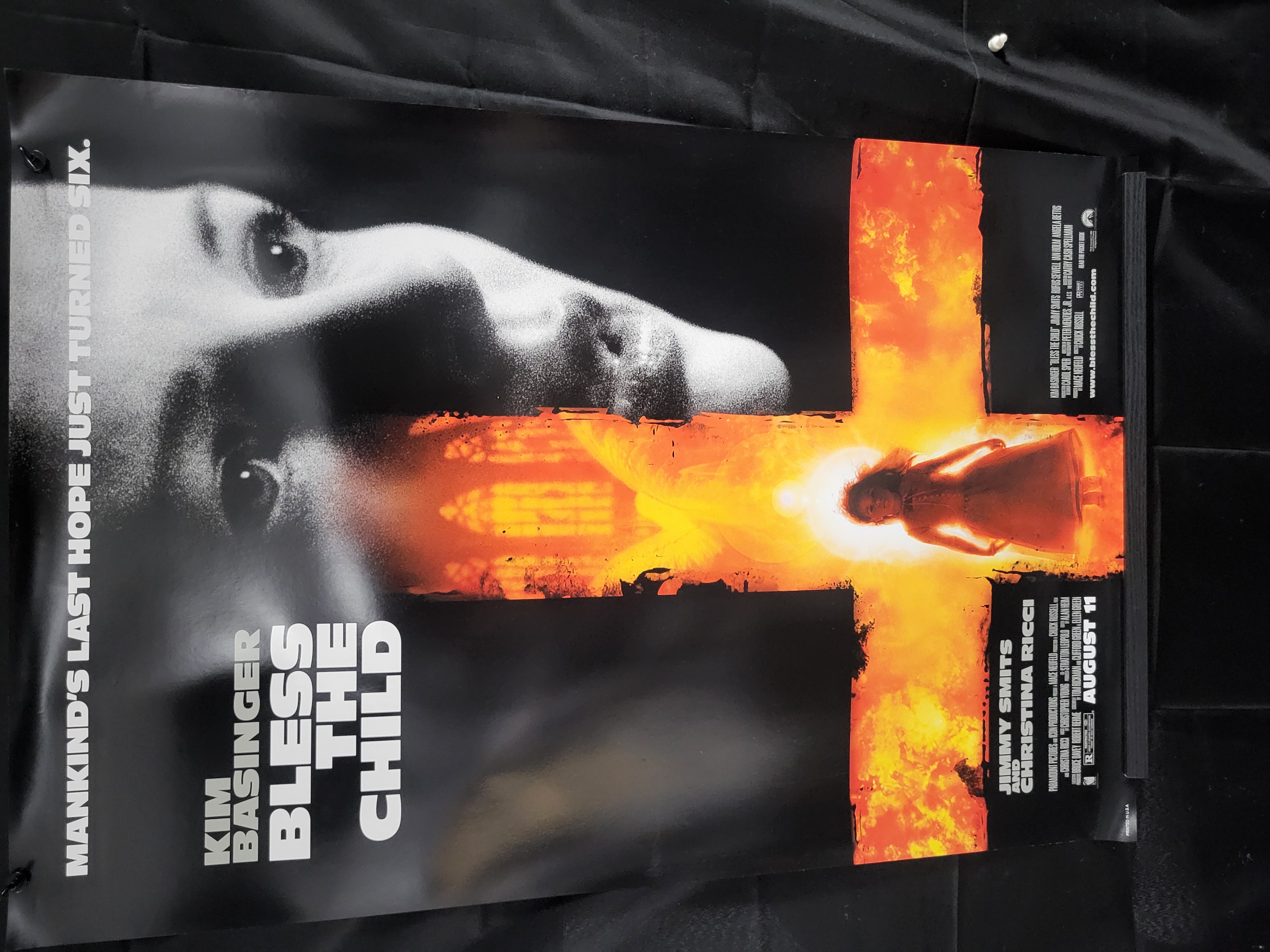 BID PER WHAT YOU SEE IN THE PHOTO, NOT THE AI GENERATED TITLES AND DESCRIPTIONS! This original promotional movie poster for the 2000 supernatural thriller Bless the Child features a high-contrast, black-and-white close-up portrait of lead actress Kim Basinger. A luminous, fiery cruciform graphic is superimposed over the image, containing the silhouette of a young girl and gothic church architectural details. The poster displays the film title, the tagline MANKIND’S LAST HOPE JUST TURNED SIX, and the names of starring cast members Kim Basinger, Jimmy Smits, and Christina Ricci. A detailed production credit block in the lower-right corner includes logos for Paramount Pictures and Icon Productions, along with the release date of August 11 and the official website. The item is printed on glossy paper stock.