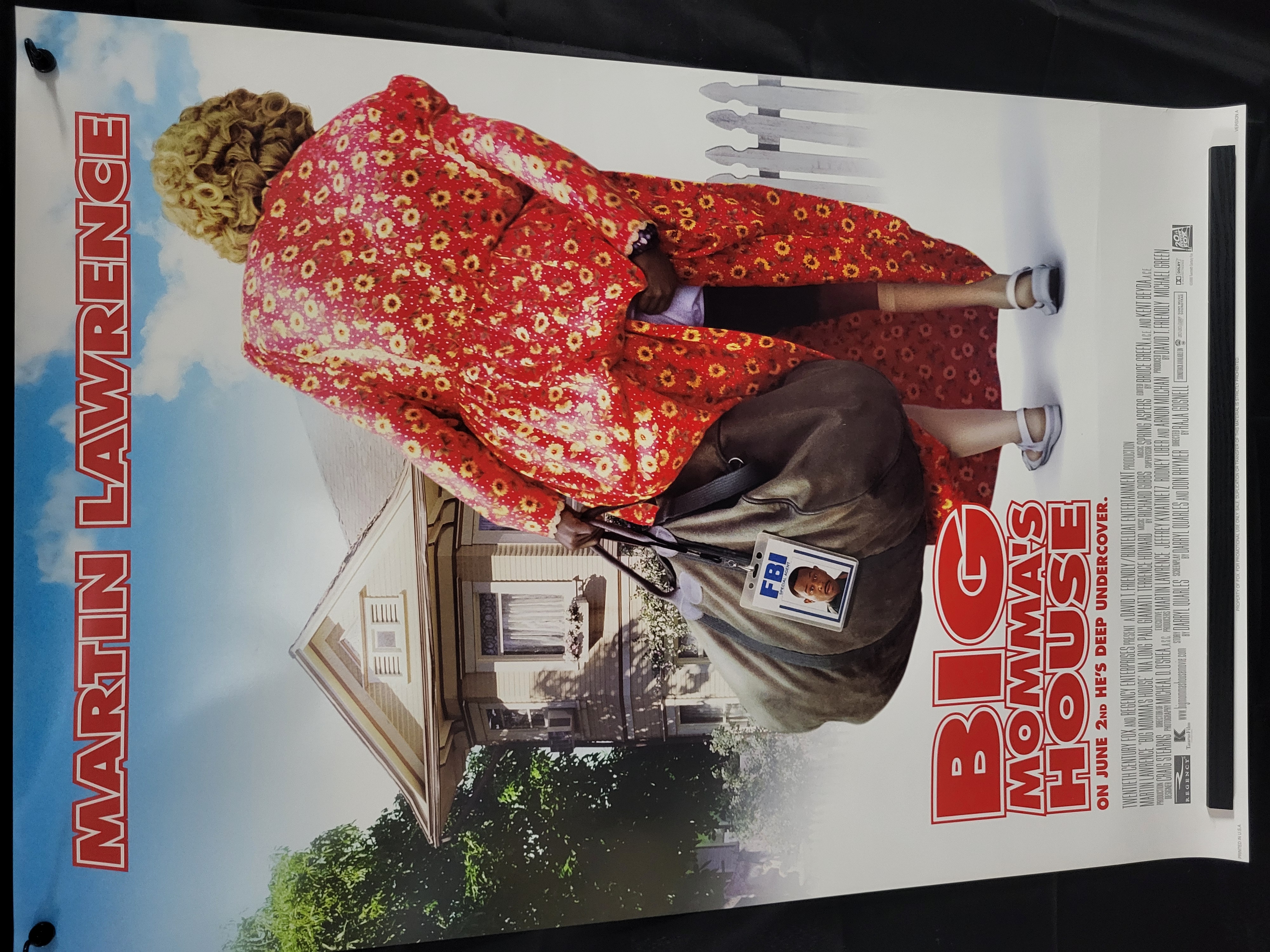 BID PER WHAT YOU SEE IN THE PHOTO, NOT THE AI GENERATED TITLES AND DESCRIPTIONS! An original promotional movie poster for the 2000 motion picture Big Momma’s House starring Martin Lawrence. The vertical poster features a central photographic image of the titular character viewed from behind, dressed in a red and yellow floral patterned coat and carrying a large brown bag with an attached FBI identification badge. The text includes Martin Lawrence oriented vertically on the left side and Big Momma’s House in large red block letters on the right, accompanied by the tagline On June 2nd He’s Deep Undercover. Production credits and logos for Twentieth Century Fox, Regency Enterprises, and other production companies are printed in the lower right corner. This is a double-sided printing intended for use in theater light boxes.
