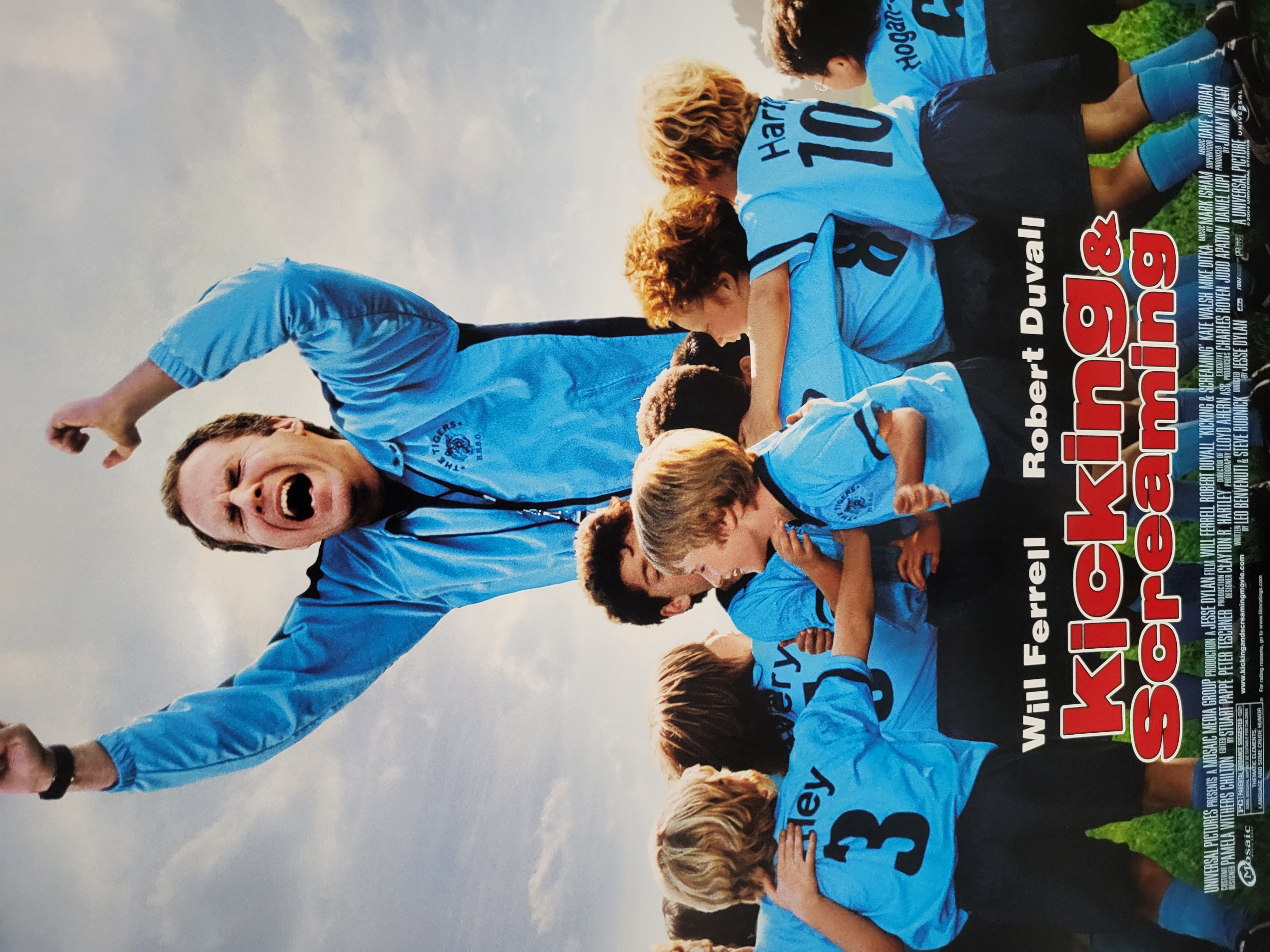 BID PER WHAT YOU SEE IN THE PHOTO, NOT THE AI GENERATED TITLES AND DESCRIPTIONS! An original promotional movie poster for the 2005 film Kicking & Screaming starring Will Ferrell and Robert Duvall. The poster features a central image of Ferrell in a blue athletic jacket cheering alongside a group of children in matching light blue soccer uniforms. Textual elements include the lead actors names, the film title in stylized red and white lettering, and a tagline reading: All his life, Phil Weston has dreamed of being on a winning team. Phil… your time has come. The bottom margin contains production and studio credits for Universal Pictures and Mosaic Media Group. The item is printed on paper and presented in a portrait orientation.