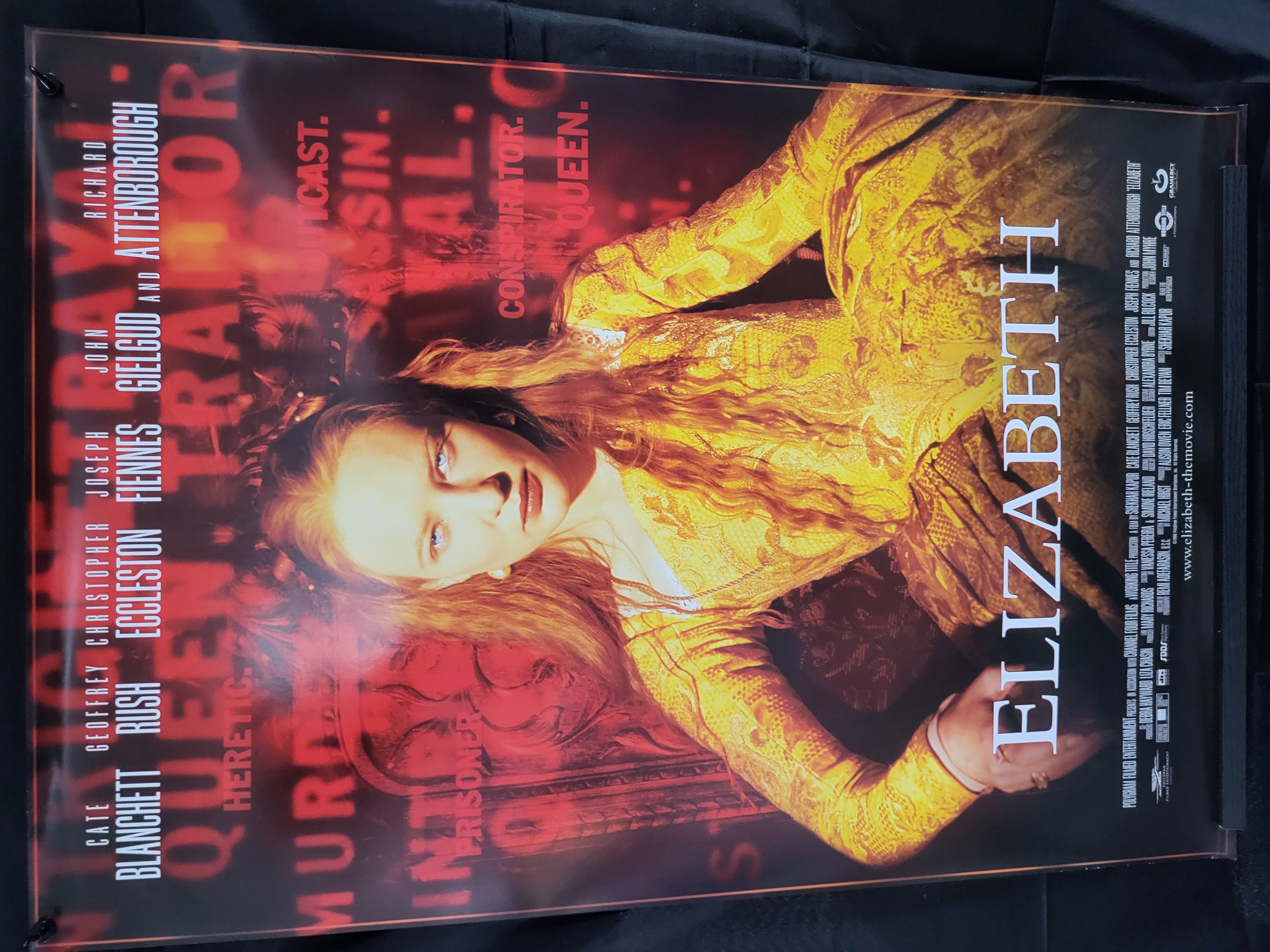BID PER WHAT YOU SEE IN THE PHOTO, NOT THE AI GENERATED TITLES AND DESCRIPTIONS! An original promotional film poster for the 1998 biographical drama Elizabeth, directed by Shekhar Kapur. The poster features a central photographic image of Cate Blanchett in a yellow embroidered period gown against a red and black background. The composition incorporates bold, stylized typography with thematic words including TRAITOR, HERETIC, QUEEN, MURDERER, and PRISONER. The film title ELIZABETH is printed in large white serif lettering. Principal cast members listed include Cate Blanchett, Geoffrey Rush, Christopher Eccleston, Joseph Fiennes, John Gielgud, and Richard Attenborough. The lower margin contains production credits and studio logos for Polygram Filmed Entertainment, Working Title, Channel Four Films, and Gramercy Pictures. The item is printed on paper.