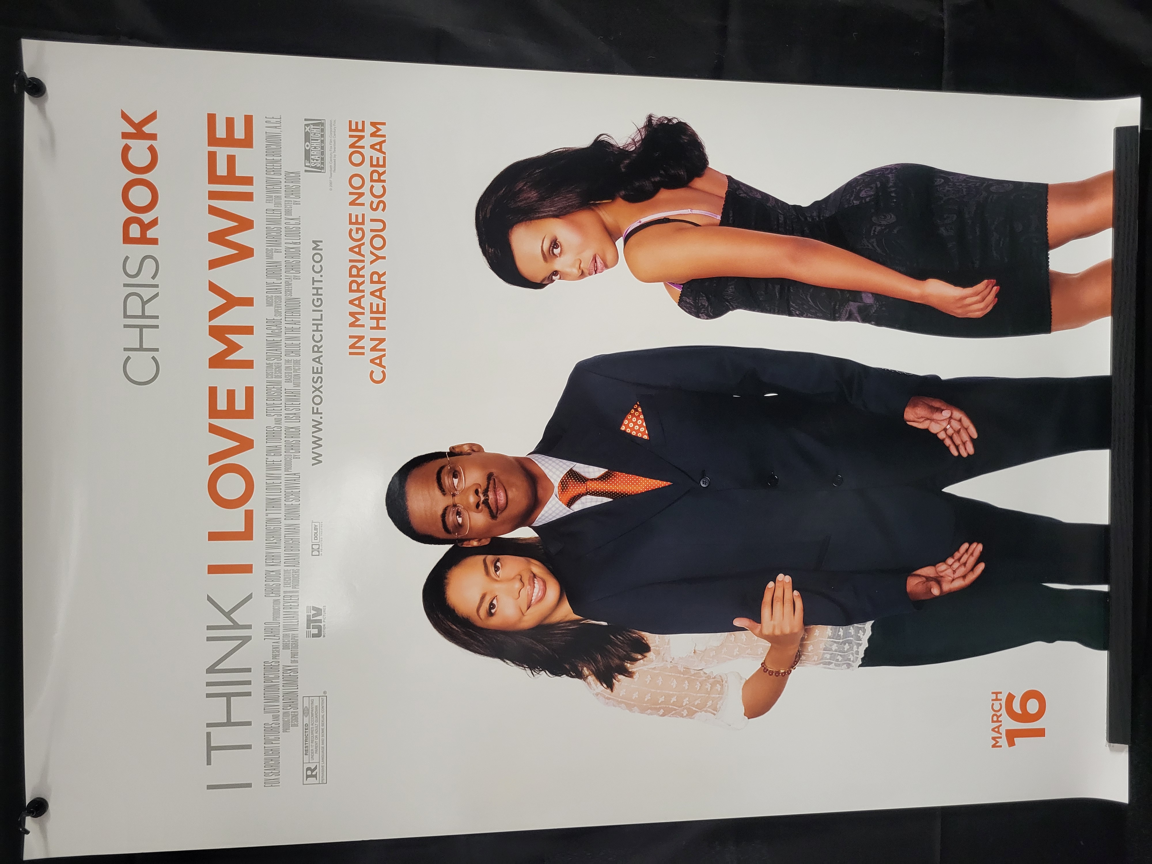 BID PER WHAT YOU SEE IN THE PHOTO, NOT THE AI GENERATED TITLES AND DESCRIPTIONS! An original theatrical movie poster for the 2007 romantic comedy I Think I Love My Wife, directed by and starring Chris Rock. The poster features a central photographic image of Chris Rock wearing a navy suit, positioned between co-stars Kerry Washington and Gina Torres against a white background. The film title and lead actor name are presented in bold orange and gray typography. The tagline IN MARRIAGE NO ONE CAN HEAR YOU SCREAM is printed above the title. A production credit block is located at the lower left, accompanied by the Fox Searchlight and UTV Motion Pictures logos and an R rating box. The release date MARCH 16 is printed in the lower right corner.