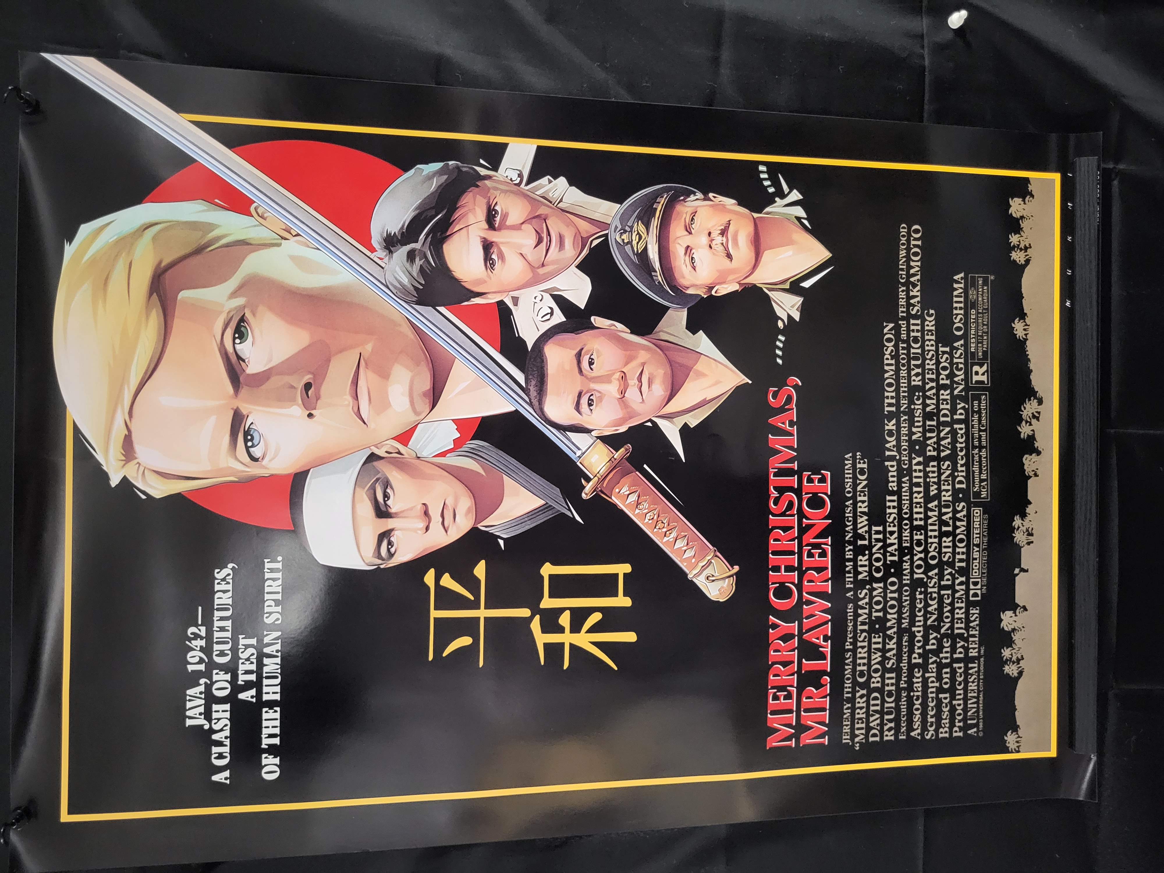 BID PER WHAT YOU SEE IN THE PHOTO, NOT THE AI GENERATED TITLES AND DESCRIPTIONS! An original theatrical movie poster for the 1983 motion picture Merry Christmas, Mr. Lawrence, directed by Nagisa Oshima. The poster is printed on glossy paper and features a stylized graphic illustration of the principal cast including David Bowie, Tom Conti, and Ryuichi Sakamoto. The design is composed against a black ground with a large red sun and a diagonal Japanese katana, accompanied by gold-toned Japanese characters for Peace. The lower portion of the poster contains the film title, the tagline JAVA, 1942— A CLASH OF CULTURES, A TEST OF THE HUMAN SPIRIT., and comprehensive production credits. A copyright notice for 1983 Universal City Studios, Inc. is printed at the bottom right.