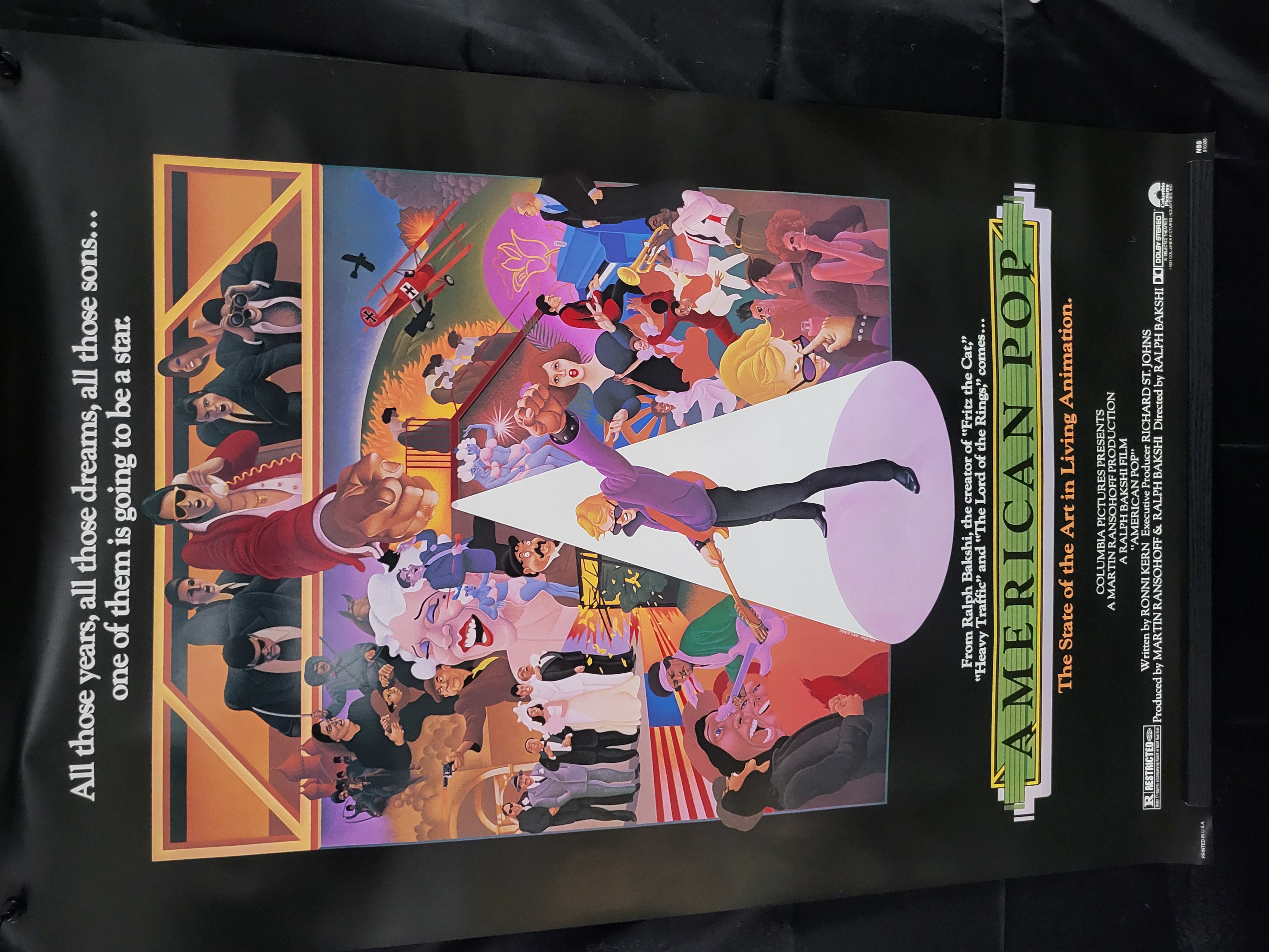 BID PER WHAT YOU SEE IN THE PHOTO, NOT THE AI GENERATED TITLES AND DESCRIPTIONS! American Pop (1981) original theatrical one-sheet movie poster. This item was produced for the theatrical release of the animated musical drama directed by Ralph Bakshi and distributed by Columbia Pictures. The poster features a multi-colored collage-style illustration depicting various characters and motifs from the film, centered on a performer in a spotlight. The design includes the title in a green and white typeface along with promotional taglines and a full credit block. The lower right corner contains the National Screen Service (NSS) number 810028 and a 1981 copyright date. The poster is printed on paper and was originally issued in a rolled format.
