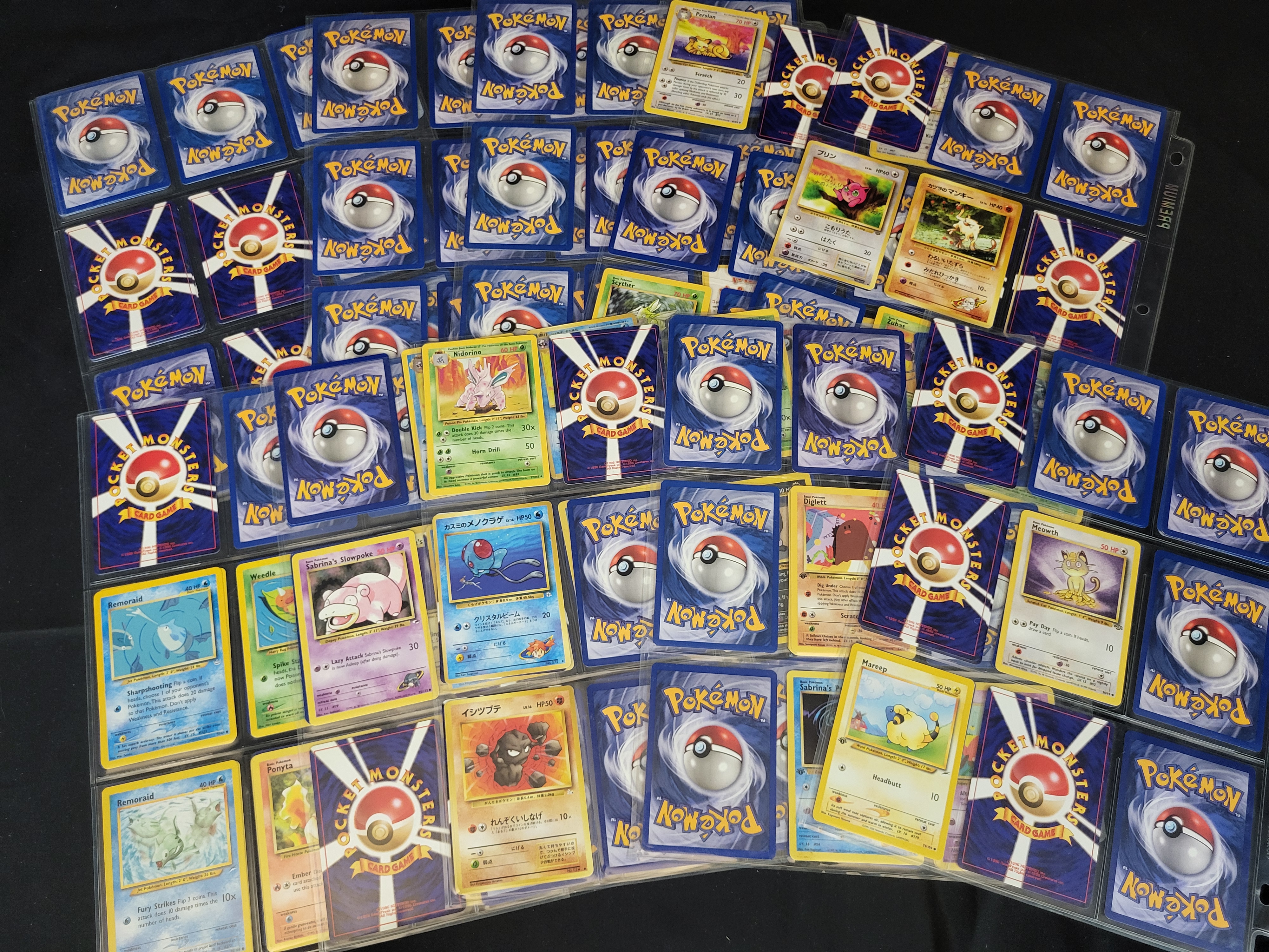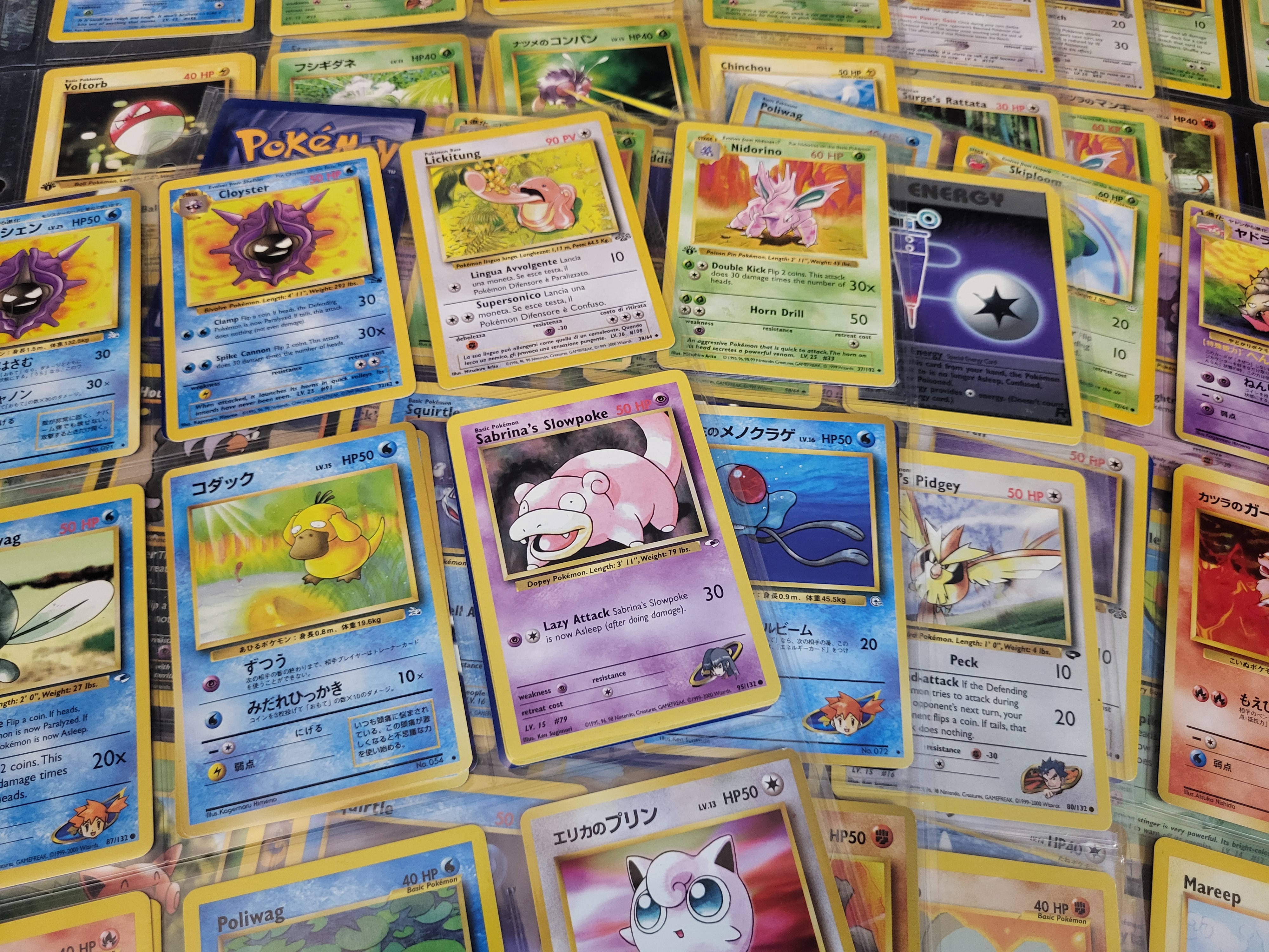 BID PER WHAT YOU SEE IN THE PHOTO, NOT THE AI GENERATED TITLES AND DESCRIPTIONS! A collection of vintage Pokémon trading cards produced by Wizards of the Coast during the late 1990s and early 2000s. The group includes cards from various expansions such as Base Set, Jungle, Gym Heroes, and Gym Challenge. The cards are printed in multiple languages, including English, Japanese, and Italian. Visible examples include Sabrina’s Slowpoke, an Italian Lickitung, Nidorino, and Erika’s Jigglypuff. The lot features both the standard English blue-bordered card backs and the original Japanese Pocket Monsters card backs. The items are housed in clear plastic binder pages and individual protective sleeves.