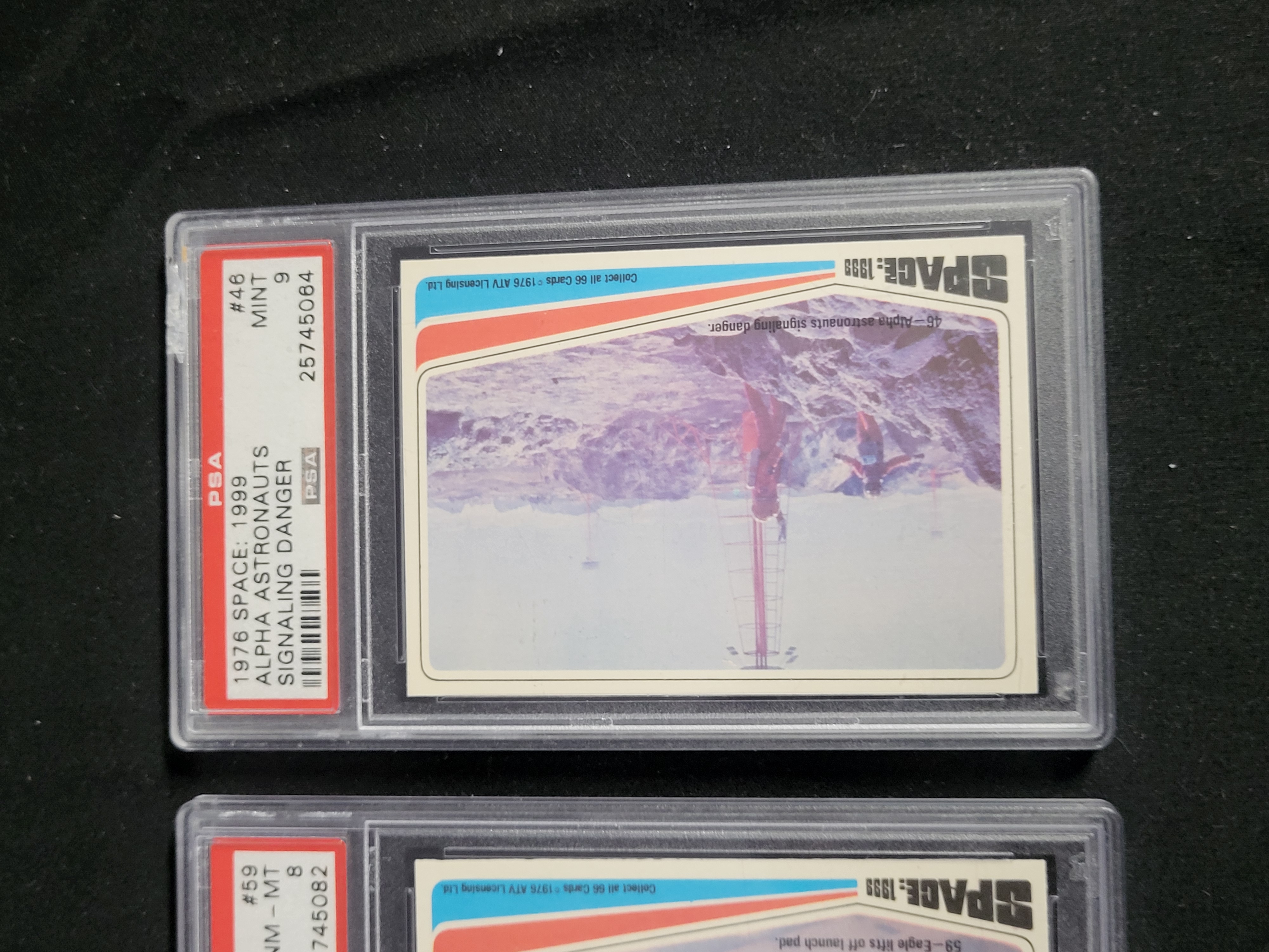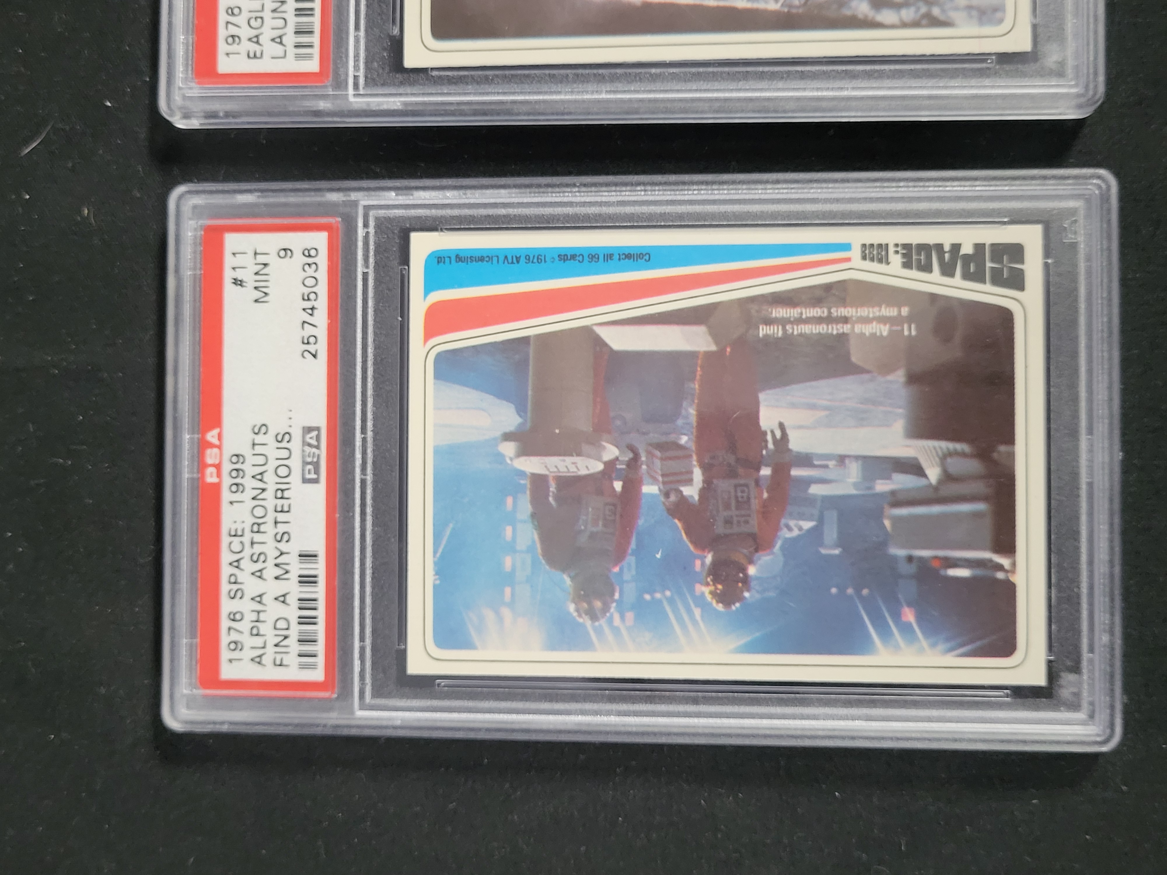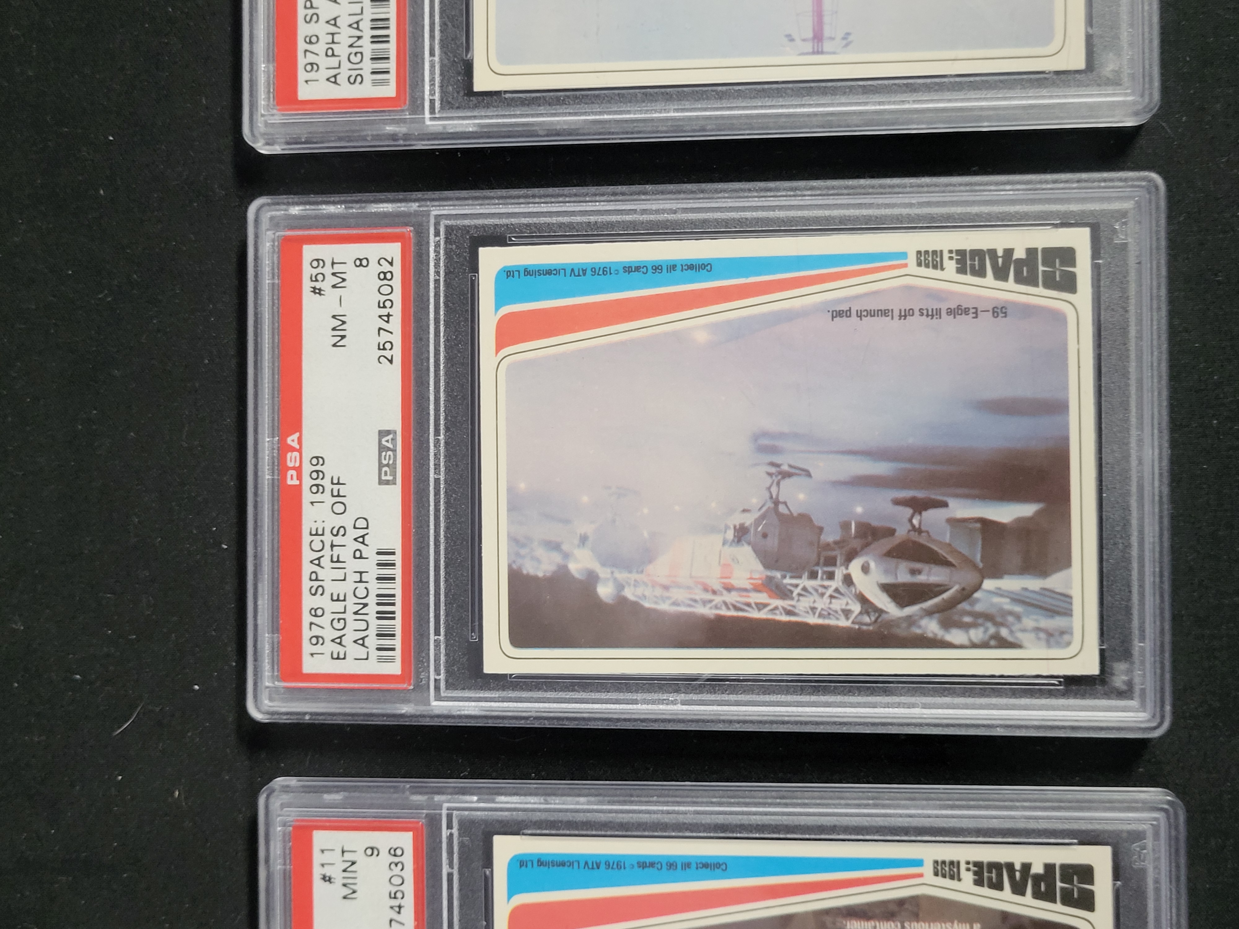 BID PER WHAT YOU SEE IN THE PHOTO, NOT THE AI GENERATED TITLES AND DESCRIPTIONS! A trio of vintage trading cards from the 1976 Donruss Space: 1999 series, each professionally graded and encapsulated by Professional Sports Authenticator (PSA). The collection includes card number 11 titled Alpha Astronauts find a mysterious container, card number 46 titled Alpha Astronauts signaling danger, and card number 59 titled Eagle lifts off launch pad. Each card features a photographic still from the science fiction television series and bears the copyright mark ©1976 ATV Licensing Ltd. The cards are part of a 66-card set. Card number 11 is graded PSA MINT 9 with certification number 25745036. Card number 46 is graded PSA MINT 9 with certification number 25745064. Card number 59 is graded PSA NM-MT 8 with certification number 25745082. The items consist of printed cardstock housed within clear protective plastic slabs.