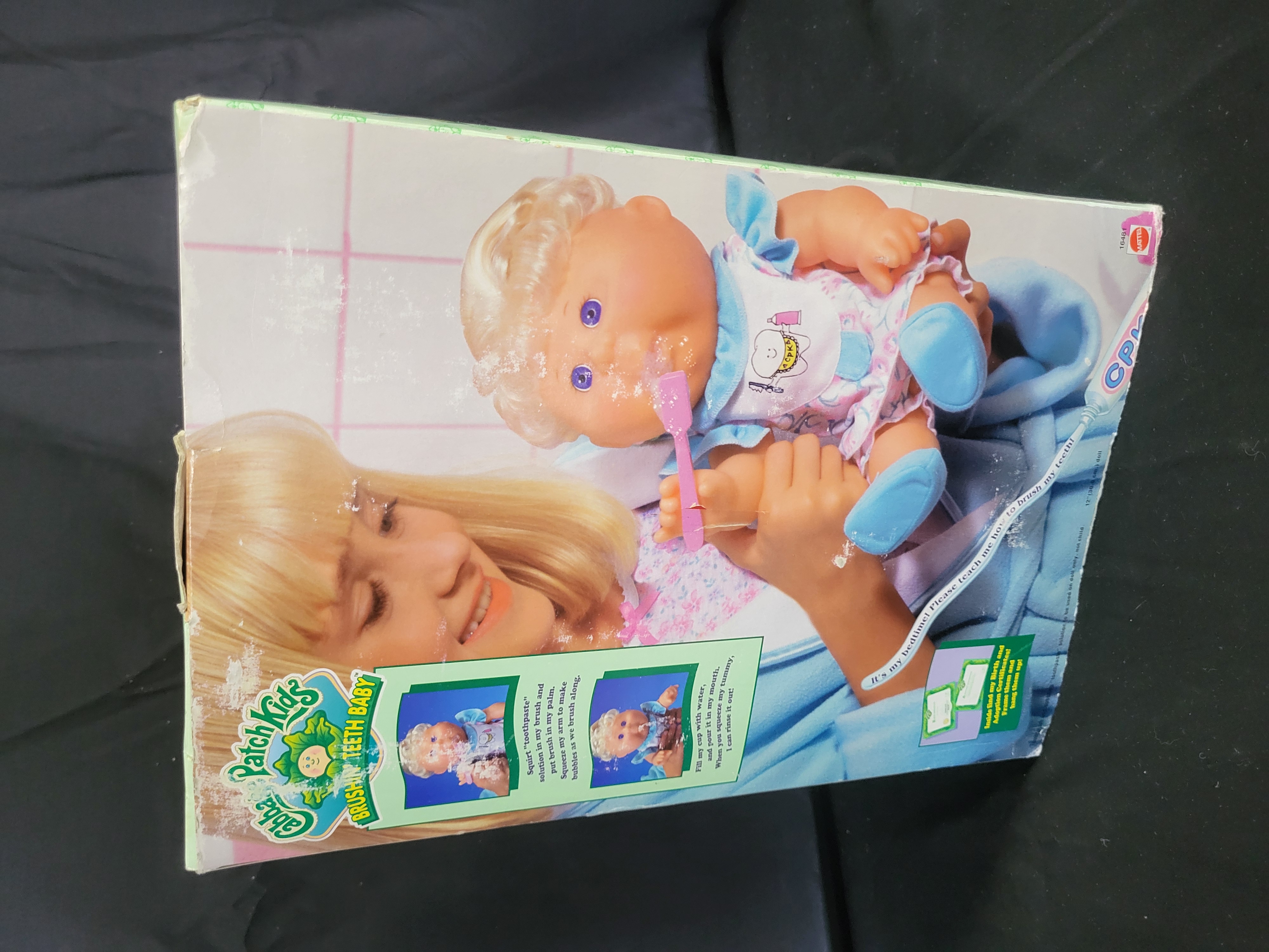 BID PER WHAT YOU SEE IN THE PHOTO, NOT THE AI GENERATED TITLES AND DESCRIPTIONS! This 1997 Mattel Cabbage Patch Kids Brushin’ Teeth Baby doll is presented in its original factory packaging. The 12-inch vinyl doll features dark hair and green eyes. The figure is dressed in a patterned shirt, a purple bib with a dinosaur motif, and blue pants. The set includes its original accessories: a bubbling toothbrush, a tube of CPK toothpaste solution, and a sipping cup. The packaging bears item number 16481 and a copyright notice for Original Appalachian Artworks, Inc. The doll remains secured to the original interior packaging.