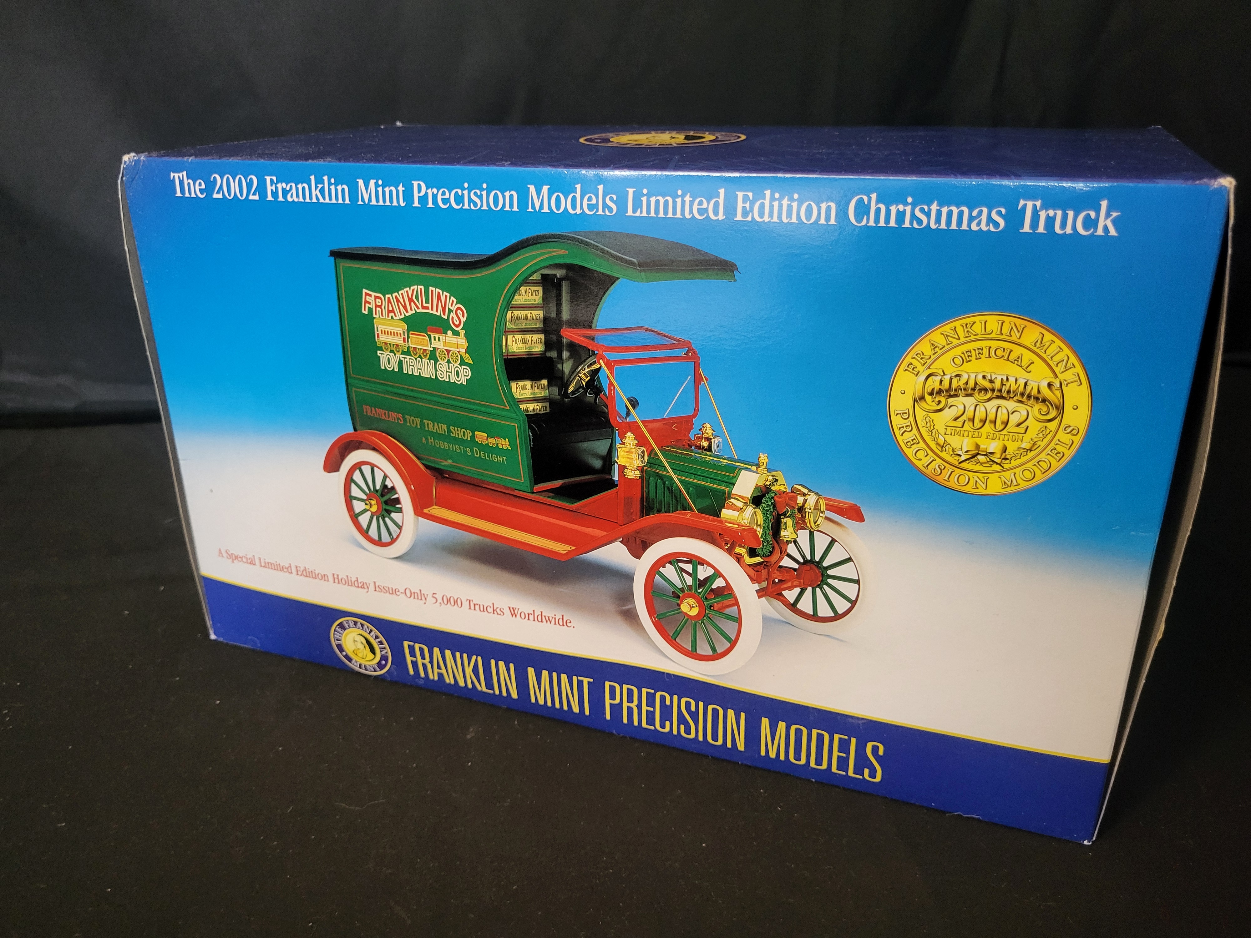BID PER WHAT YOU SEE IN THE PHOTO, NOT THE AI GENERATED TITLES AND DESCRIPTIONS! A 1:16 scale die-cast model produced by Franklin Mint Precision Models, identified as the 2002 Limited Edition Christmas Truck. The vehicle is modeled after a 1913 Ford Model T delivery truck and features a festive green and red color scheme with gold-tone accents. The side panels are branded for Franklin’s Toy Train Shop with the subtitle A Hobbyist’s Delight. The interior cargo area is depicted carrying multiple miniature toy train sets. This specific holiday issue was limited to a production run of 5,000 units worldwide. The item is housed in its original blue and white illustrated box which contains manufacturer specifications and branding.
