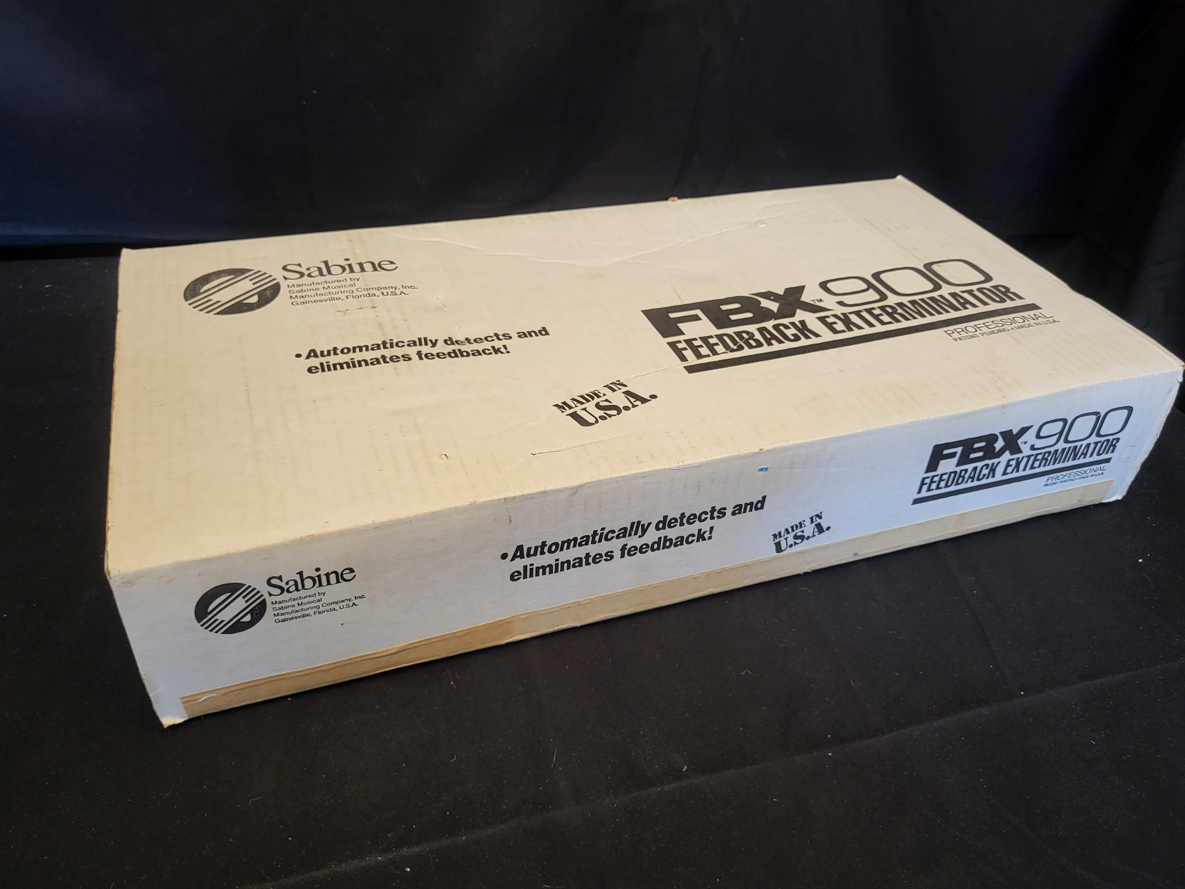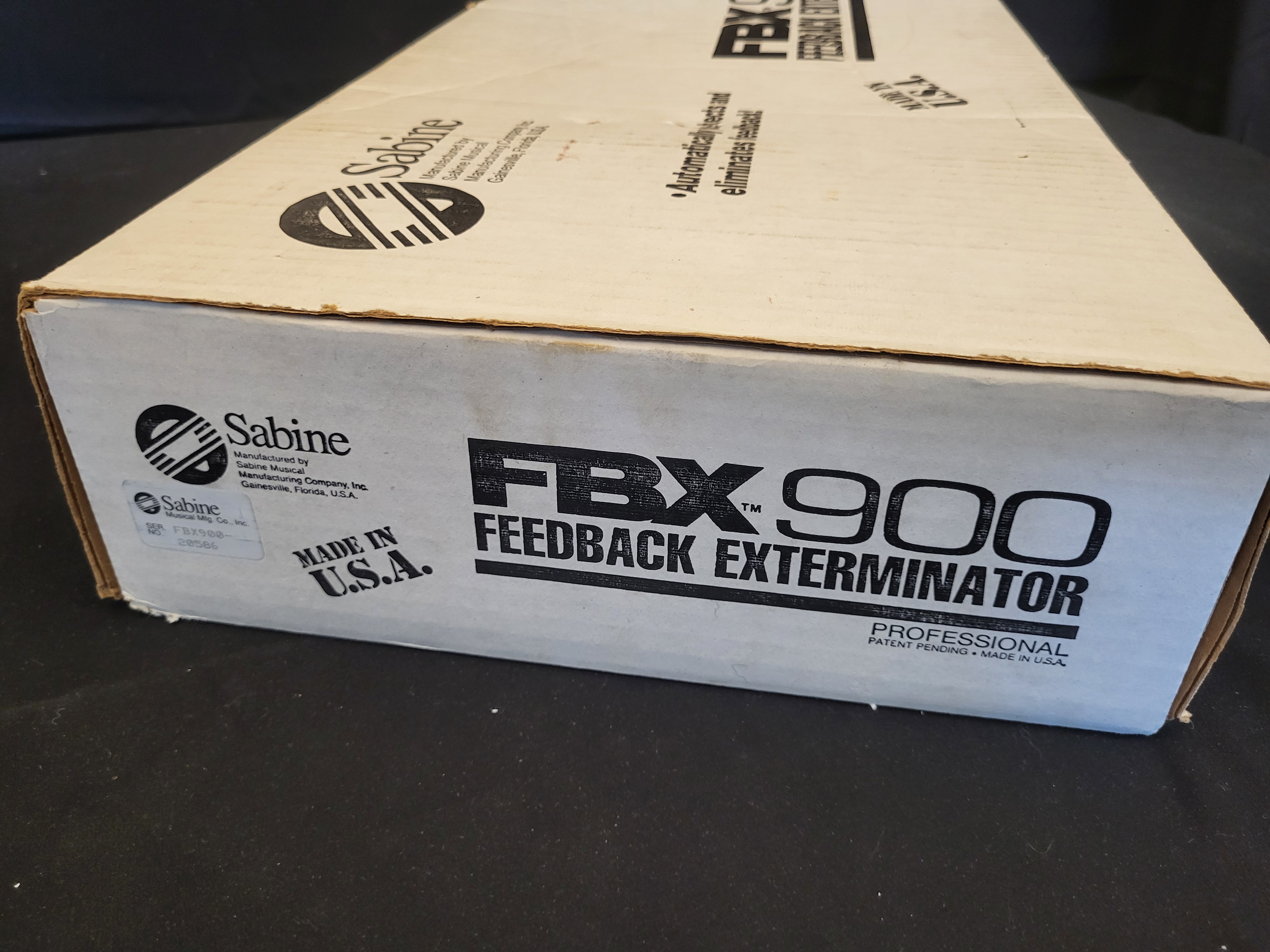 BID PER WHAT YOU SEE IN THE PHOTO, NOT THE AI GENERATED TITLES AND DESCRIPTIONS! A Sabine FBX-900 Feedback Exterminator professional audio signal processor manufactured by the Sabine Musical Manufacturing Company, Inc. of Gainesville, Florida, USA. The unit is contained within its original white cardboard retail packaging which is printed with the brand name, model, and the functional description Automatically detects and eliminates feedback. The packaging also bears the markings Made in U.S.A. and Professional Patent Pending. A manufacturer label on the side of the box identifies the unit with serial number FBX900-20586.