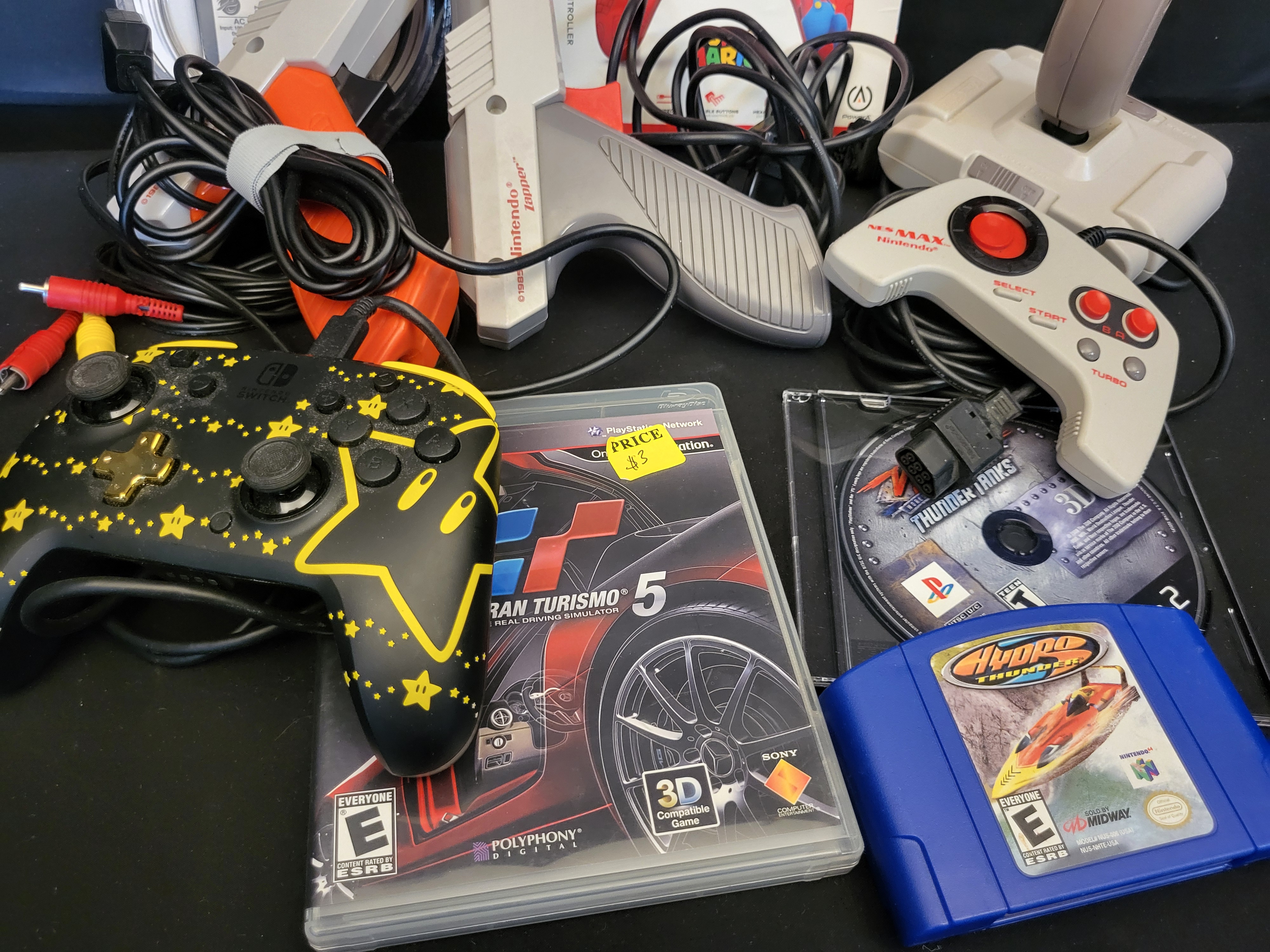 BID PER WHAT YOU SEE IN THE PHOTO, NOT THE AI GENERATED TITLES AND DESCRIPTIONS! A collection of vintage and modern video game hardware, controllers, and software. The assortment includes Nintendo Zapper light guns in grey and orange, an NES Max controller, and an NES Advantage joystick. Modern hardware features a boxed PowerA Mario themed wired controller for Nintendo Switch and an additional unboxed Switch controller with yellow star motifs. Software titles include Gran Turismo 5 for PlayStation 3, a Hydro Thunder cartridge for Nintendo 64 in a blue casing, and a loose Thunder Tanks disc for PlayStation 2. Completing the lot is a Pelican AC adapter for Nintendo DS in its original blister packaging and assorted connection cables.