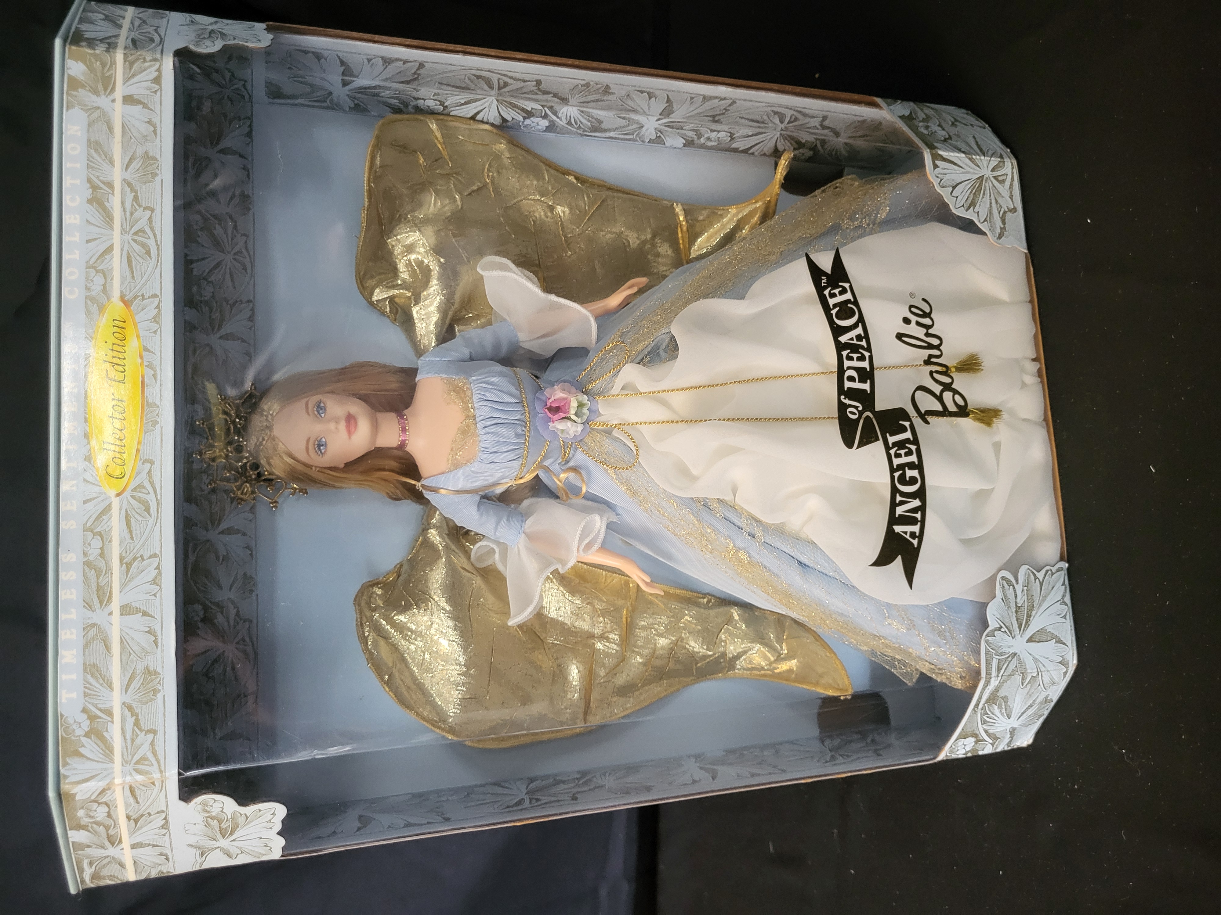 BID PER WHAT YOU SEE IN THE PHOTO, NOT THE AI GENERATED TITLES AND DESCRIPTIONS! A Mattel Angel of Peace Barbie doll from the Timeless Sentiments Collection, product number 24240. This 1999 Collector Edition doll features long blonde hair and is dressed in a light blue and white gown with gold-tone accents. The ensemble includes large shimmering gold-colored wings and a golden filigree headpiece. The doll is housed in its original display packaging, which features silver-tone foliate patterns and a Collector Edition label. The reverse of the box displays thematic text regarding peace and includes lyrics from the song Let There Be Peace on Earth.